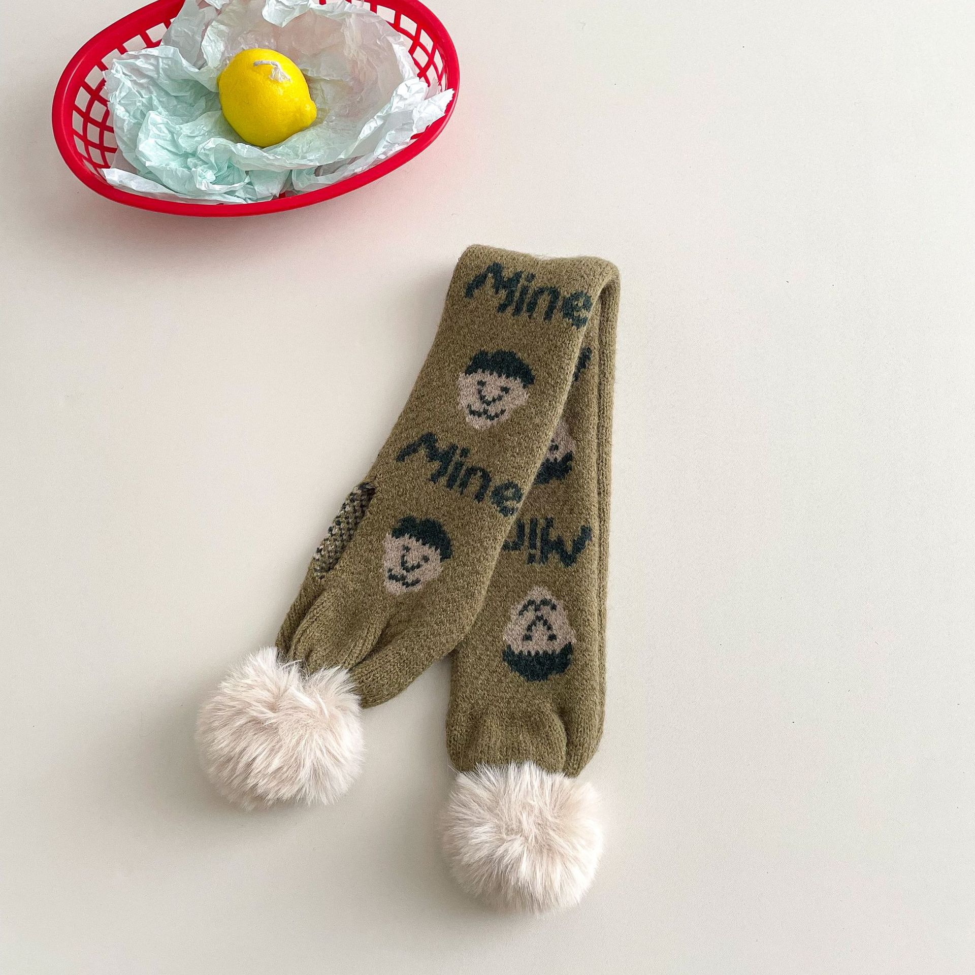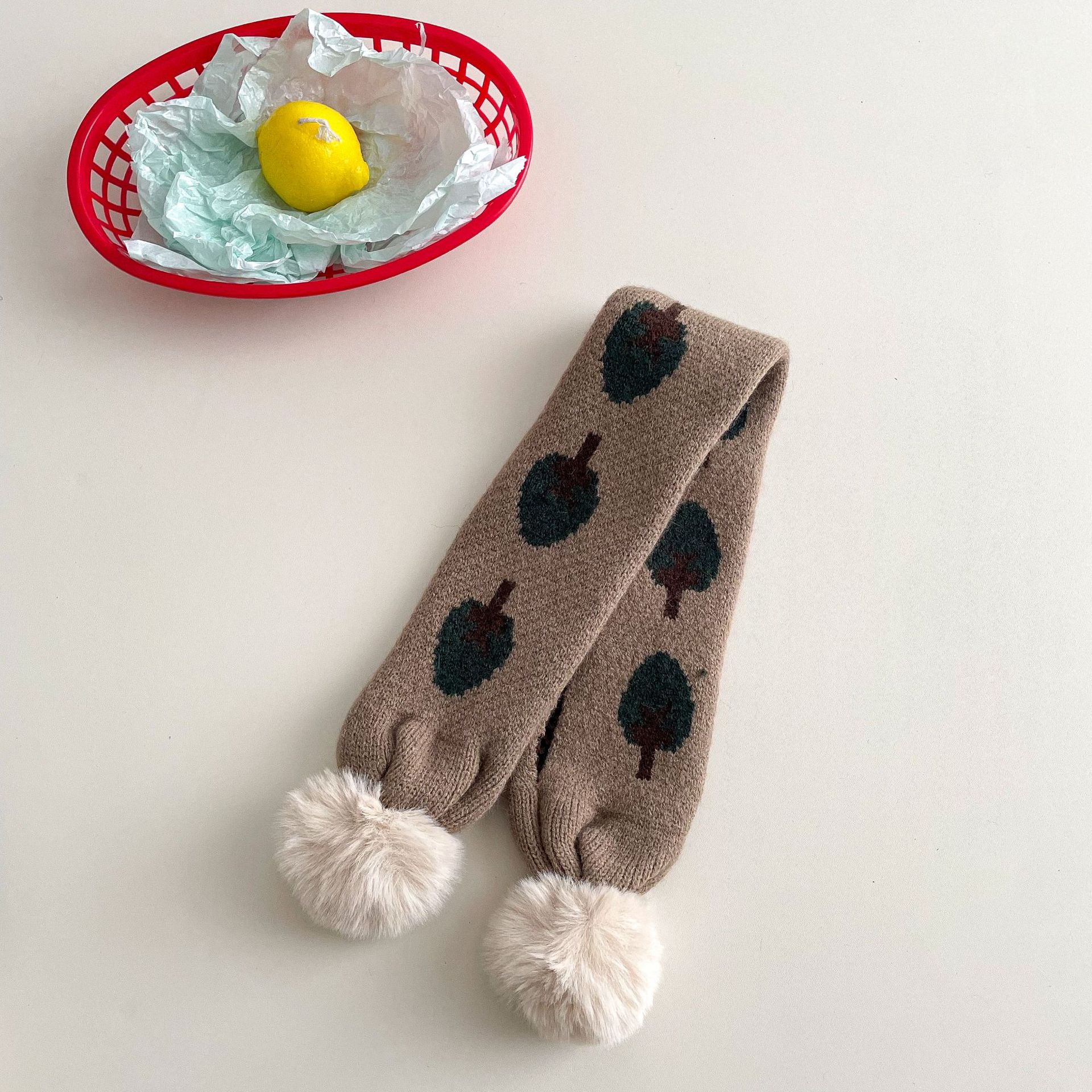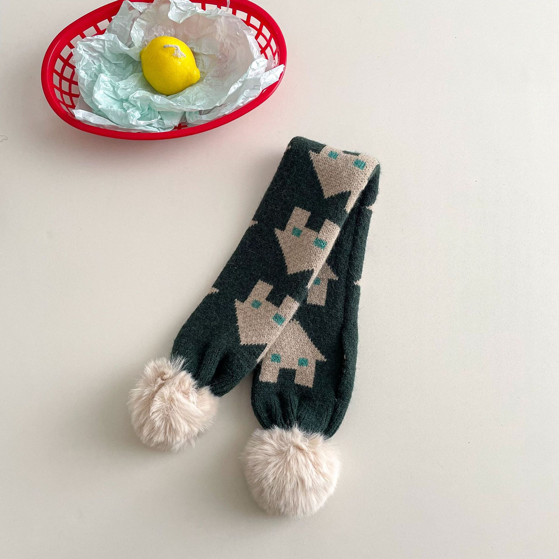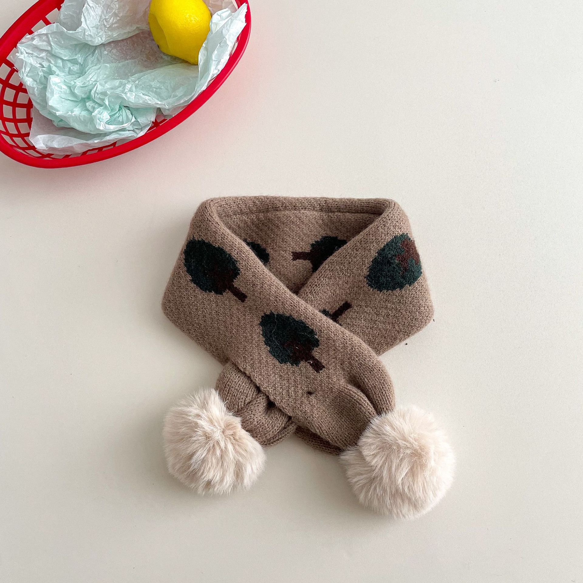 • 아동용 퍼볼 니트 스카프 - 카키 그린 트리