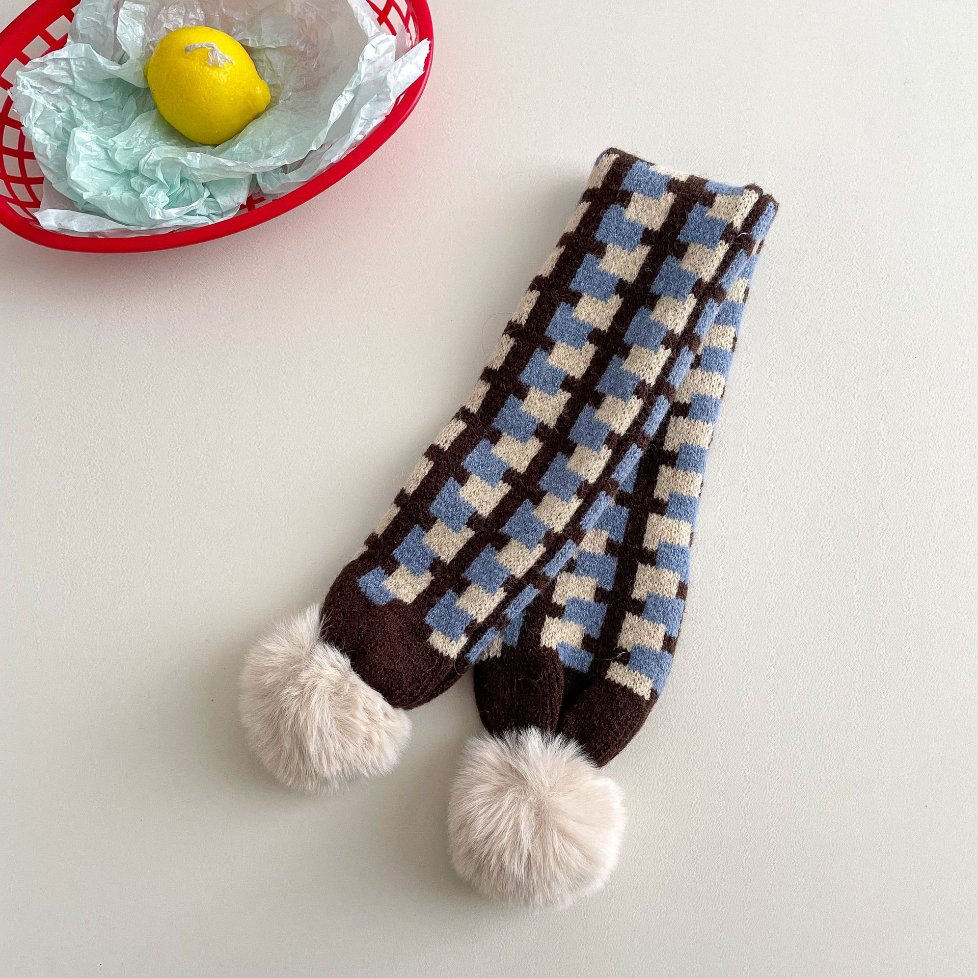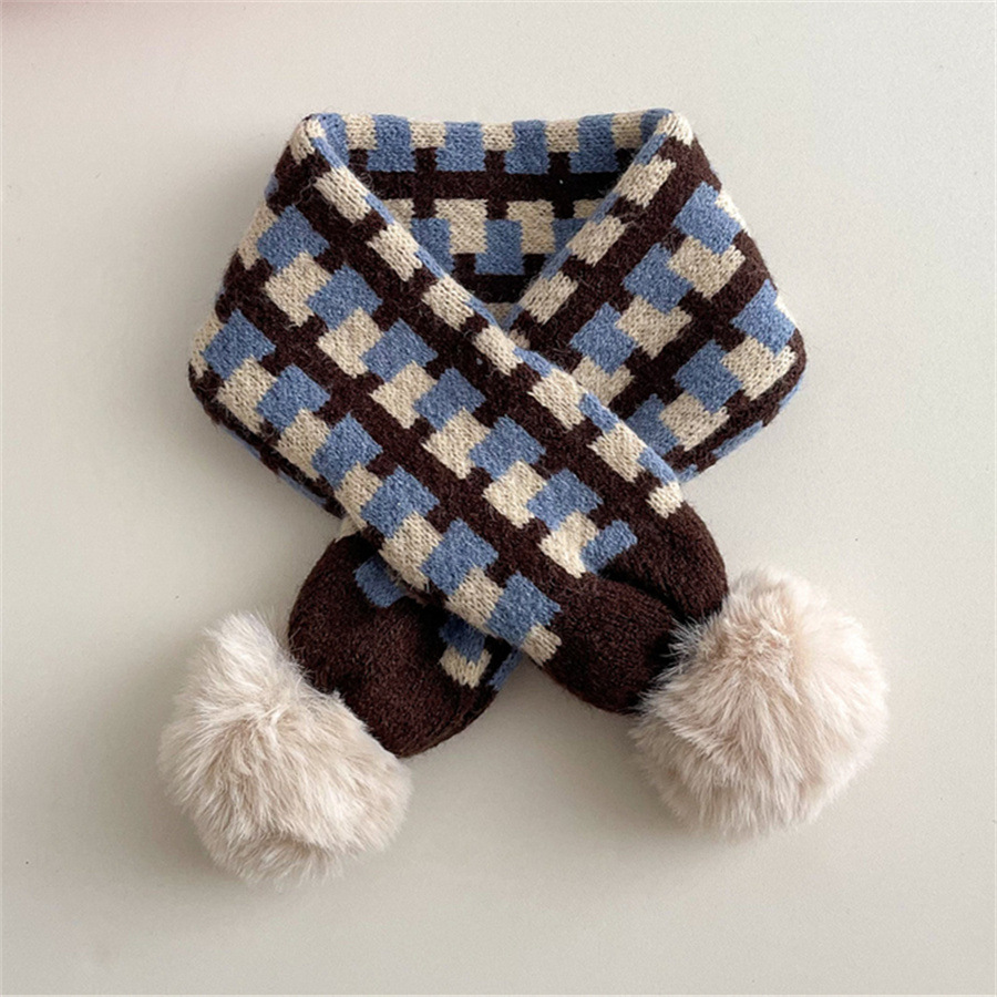 • 아동용 퍼 볼 니트 스카프 - 블루 라이스 브라운 체크 무늬