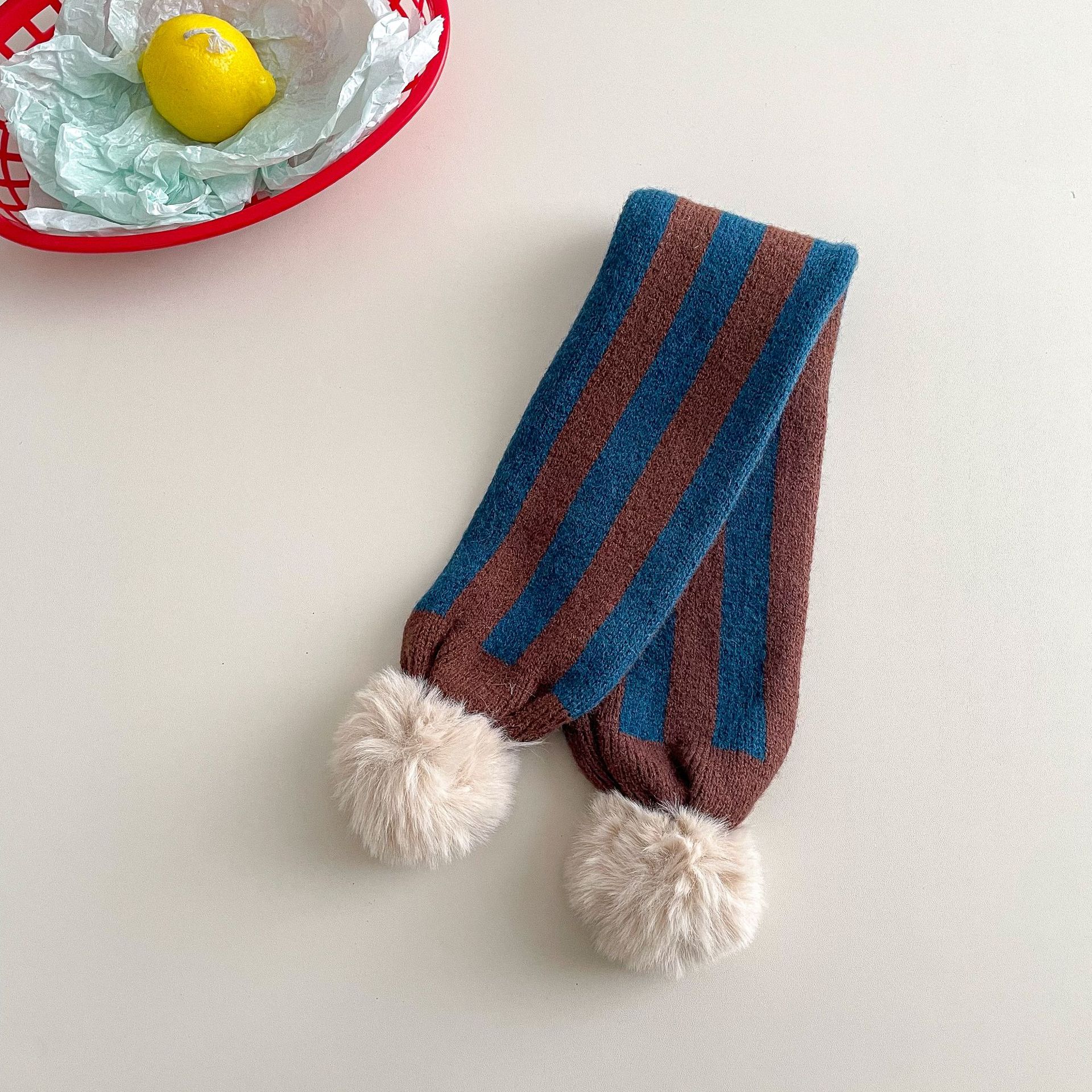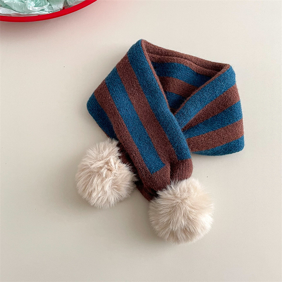 • 아동용 퍼 볼 니트 스카프 - 파란색과 갈색 세로 줄무늬