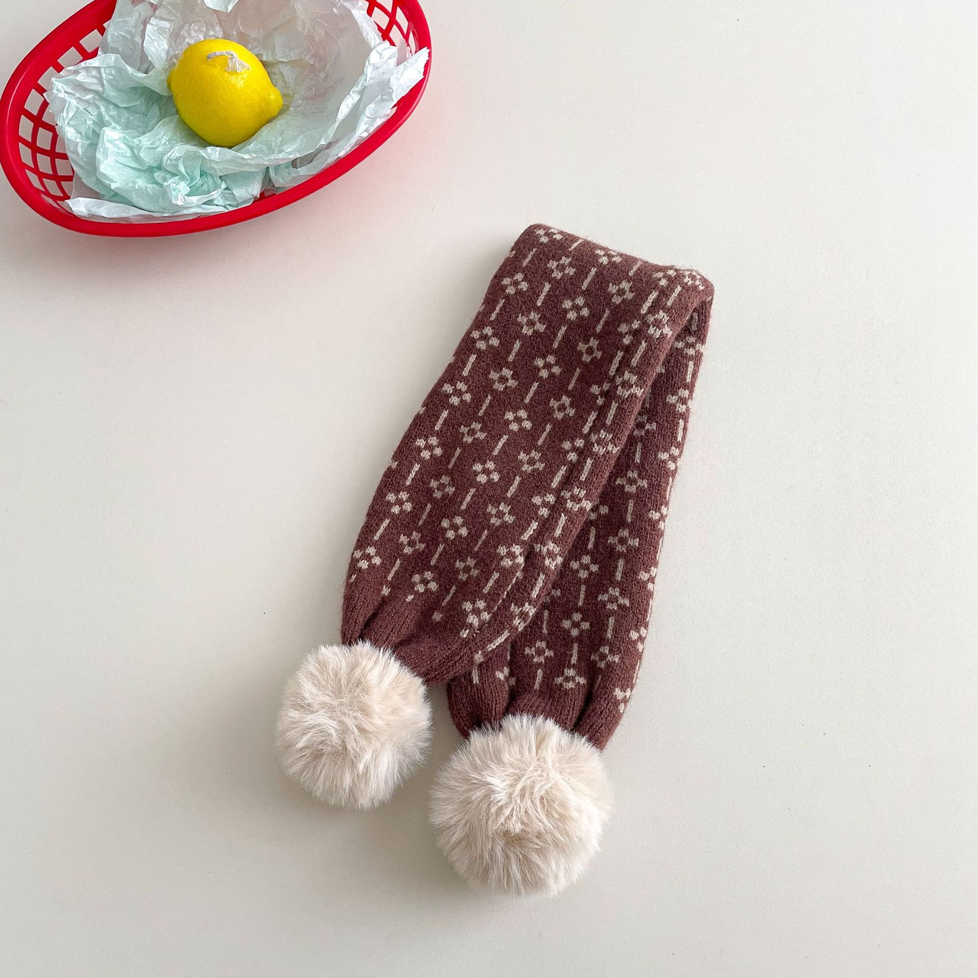 • 아동용 퍼 볼 니트 스카프 - 체인 플라워 브라운