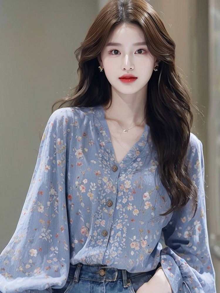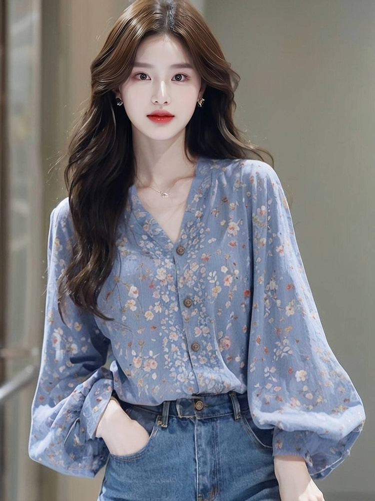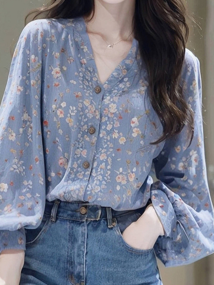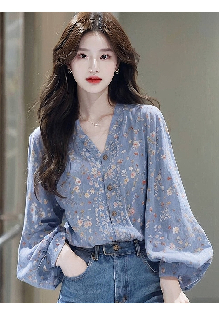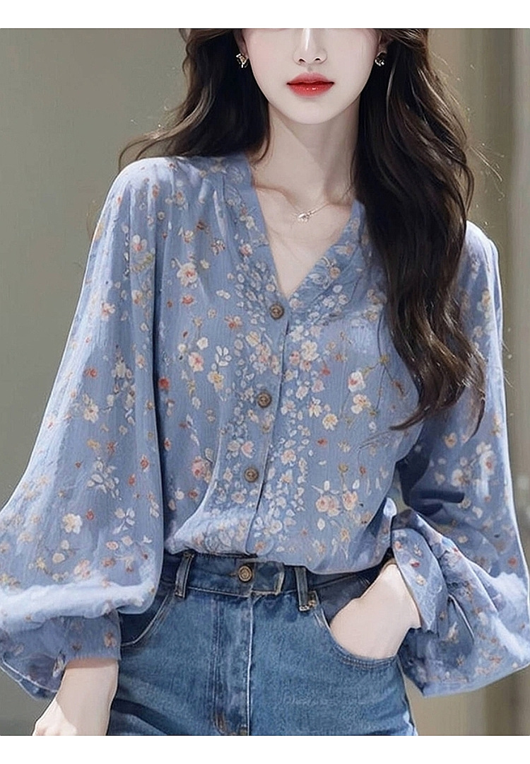 초가을 프렌치 스타일, 아름답고 독특한 여성스러운 우아함, 여성용 루즈하고 나른한 스타일의 블루 플로럴 긴팔 셔츠 탑스토어 가기