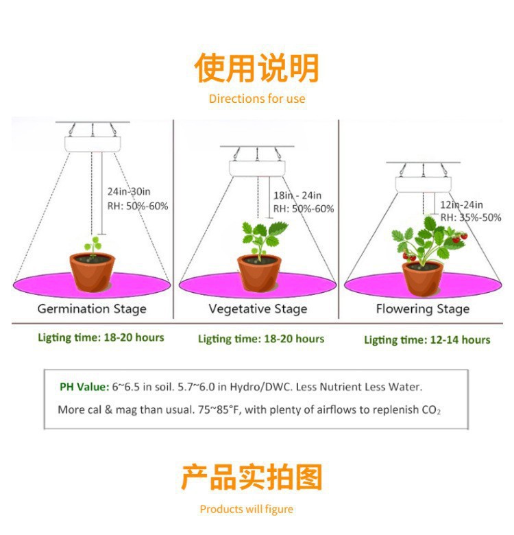 提示: 填料:我们的填料信息是灯具的实际输出。通过更换 300 瓦白炽灯泡用于植物生长,可节省高达 90% 的能源。 光谱相对能量百分比: 蓝色 460-470 nm 蓝光刺激生长并促进光合作用,使叶子更饱满、更紧凑 红色 620-660 nm 红光促进开花结果 紫外线 390-395 nm 紫外线用于播种和杀菌 红外 730-735 nm IR 代表对花卉和水果有益 暖白 3000K 和白 5000K 阳光模式,提高温度,改善光合作用 温馨提示: UV和IR LED特别弱 请不要担心,这是正常的, 灯不防水,请勿放入水中或在潮湿的地方使用 请勿直视 LED 灯