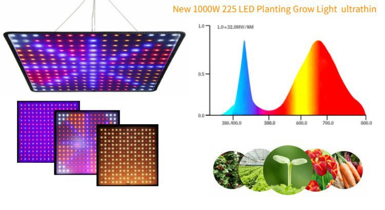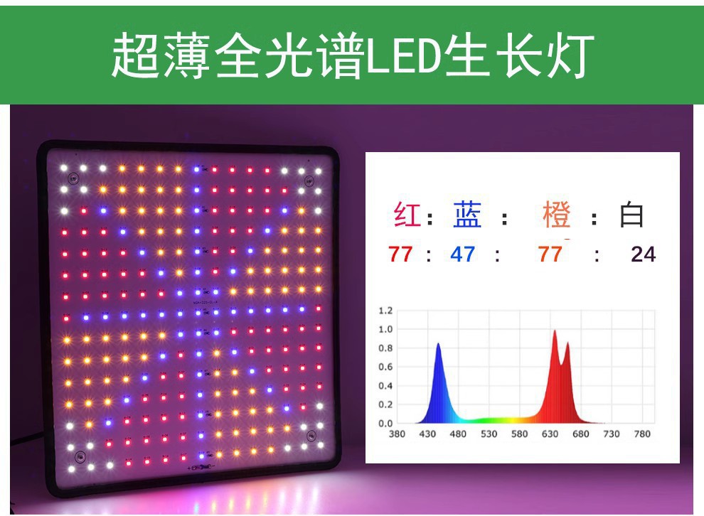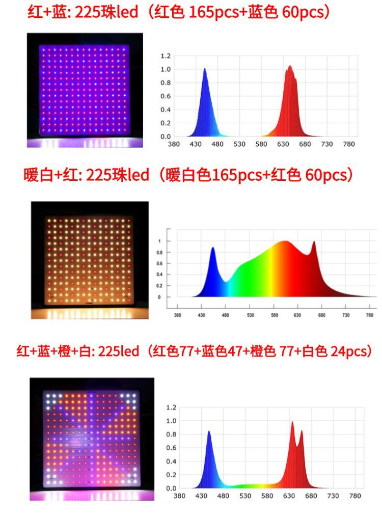 面板尺寸:30*30*3cm/11.8*11.8*1.2in 具有 225 个 LED 的全光谱 B 型号包括 78 个红色 (620-660 nm) + 47 个蓝色 (460-470 nm) + 24 个白色 (5000 K) + 76 个暖白色 (3000 K) LED。