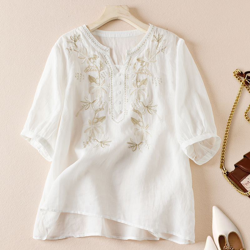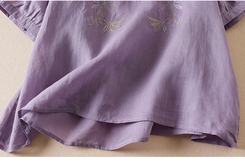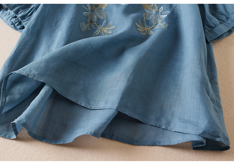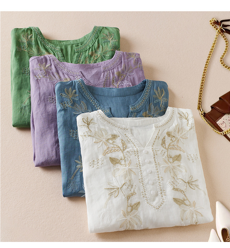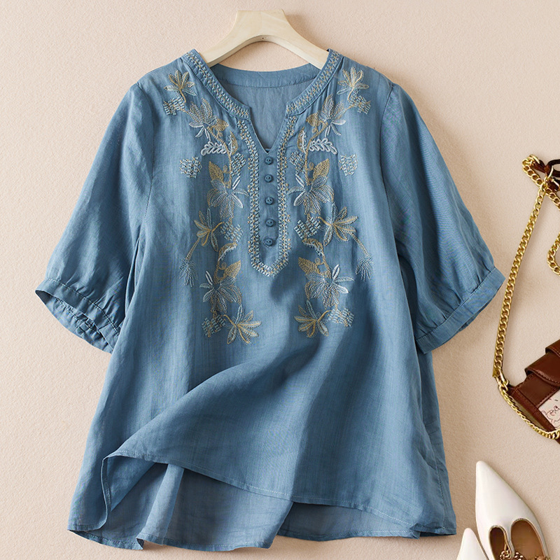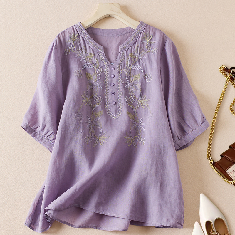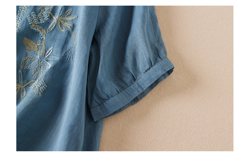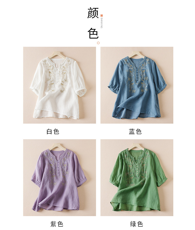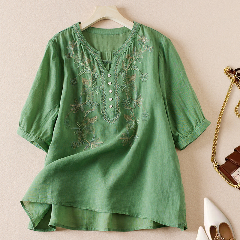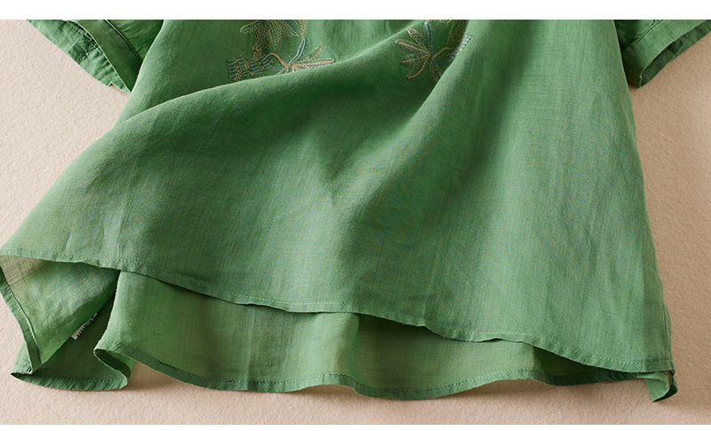 리얼 샷 2024 여름 새로운 예술적 느슨한 단색 자수 V-넥 반팔 티셔츠 여성 재킷 #6650 #스토어 가기