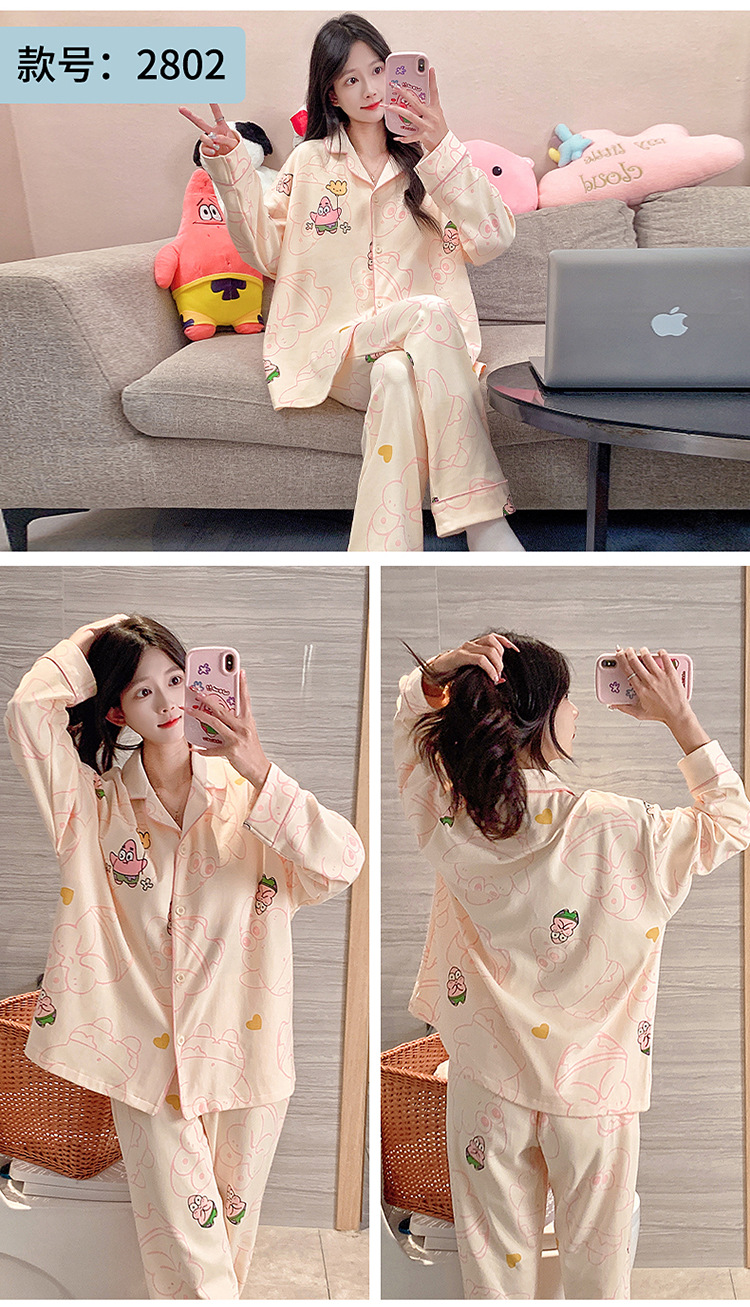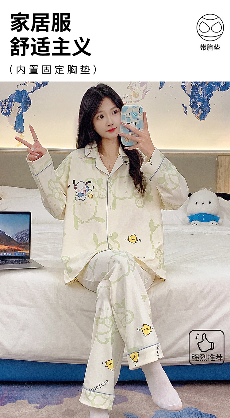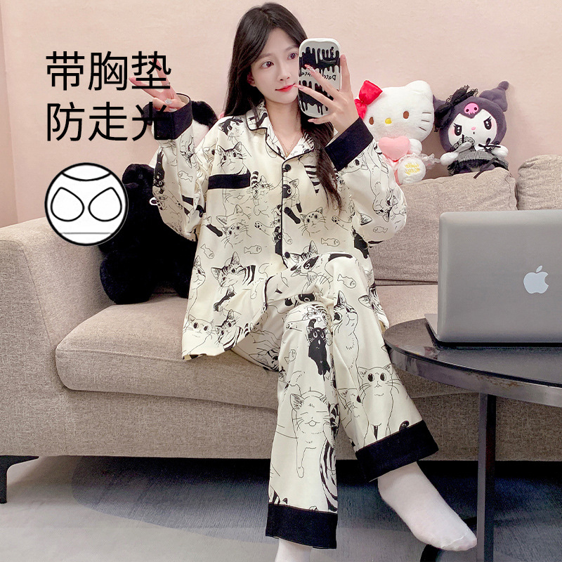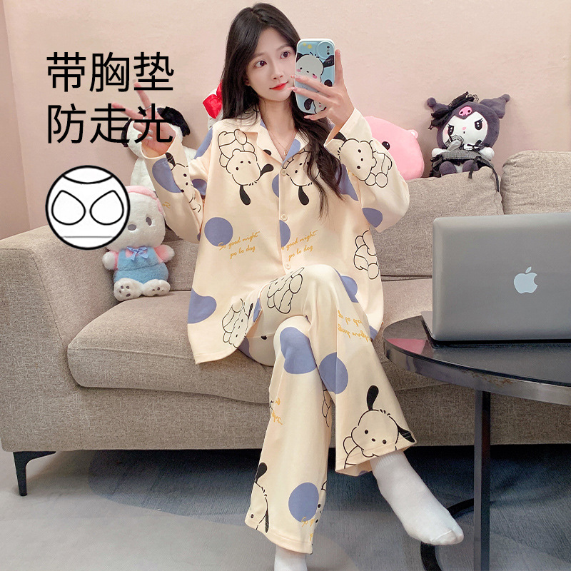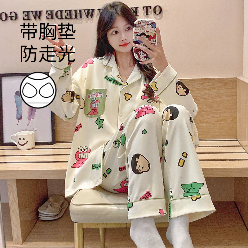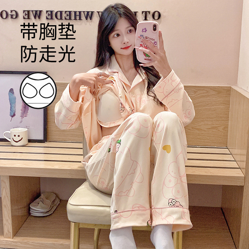 가슴 패드가 달린 잠옷 여성의 가을 모조 면 카디건 긴 소매 바지 세트 여성용 달콤한 귀여운 가을과 겨울 홈 옷스토어 가기