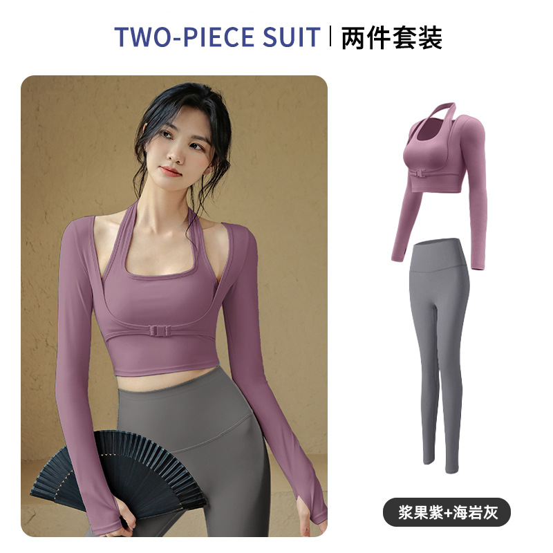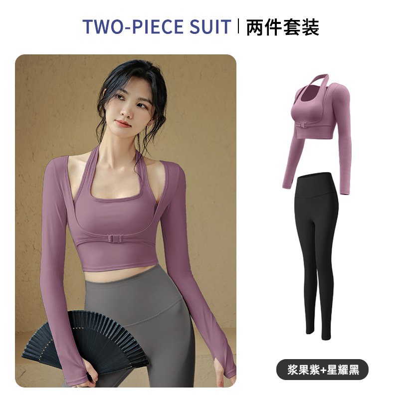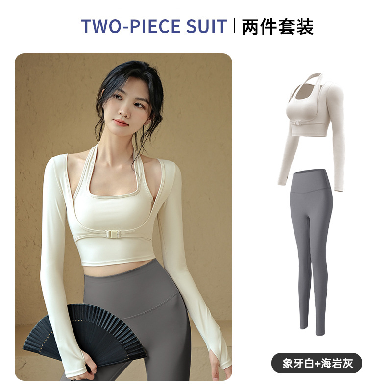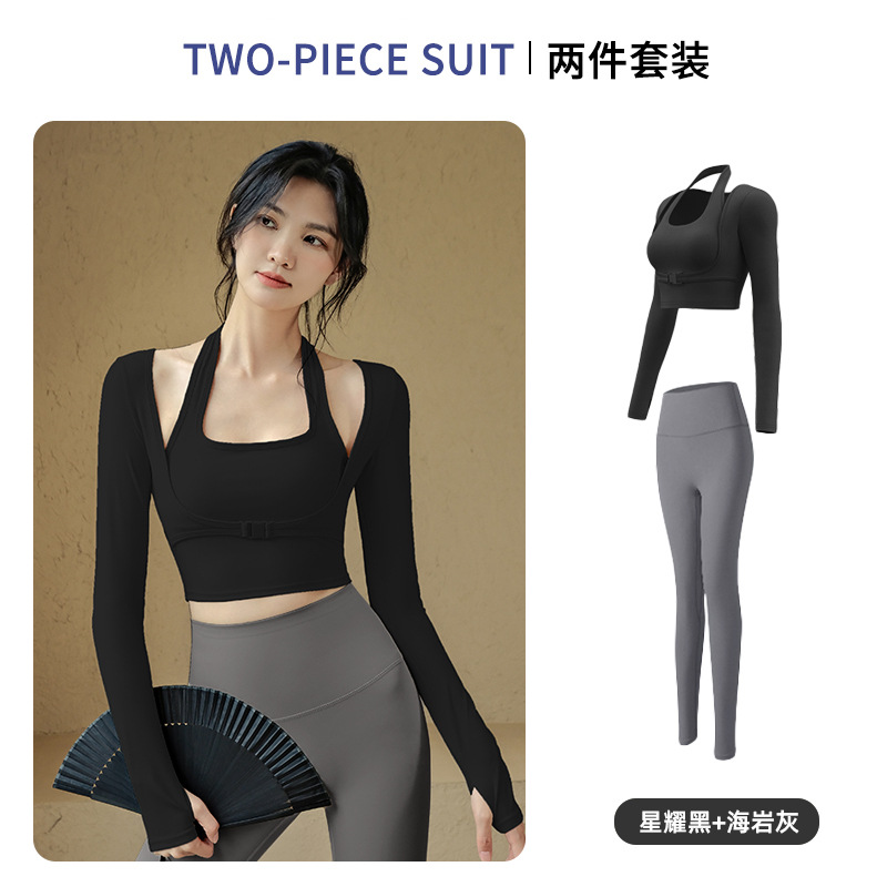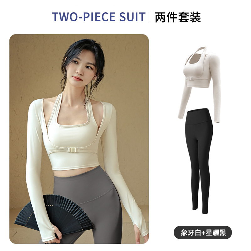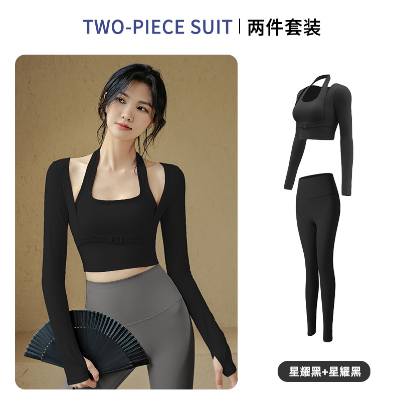 봄철 속건성 세트 러닝 피트니스 스포츠 끈탑 고정형 가슴 패드 내장 투피스 스타일 긴팔 요가복
