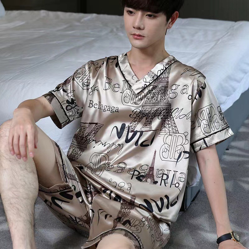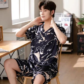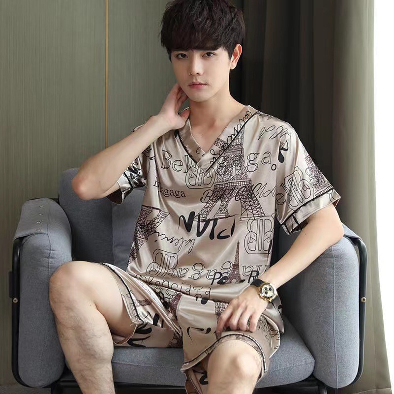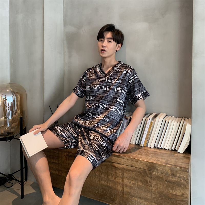 잠옷 남자의 여름 얼음 실크 얇은 짧은 소매 투피스 세트 느슨한 플러스 사이즈 남자의 집 옷의 한국어 버전스토어 가기