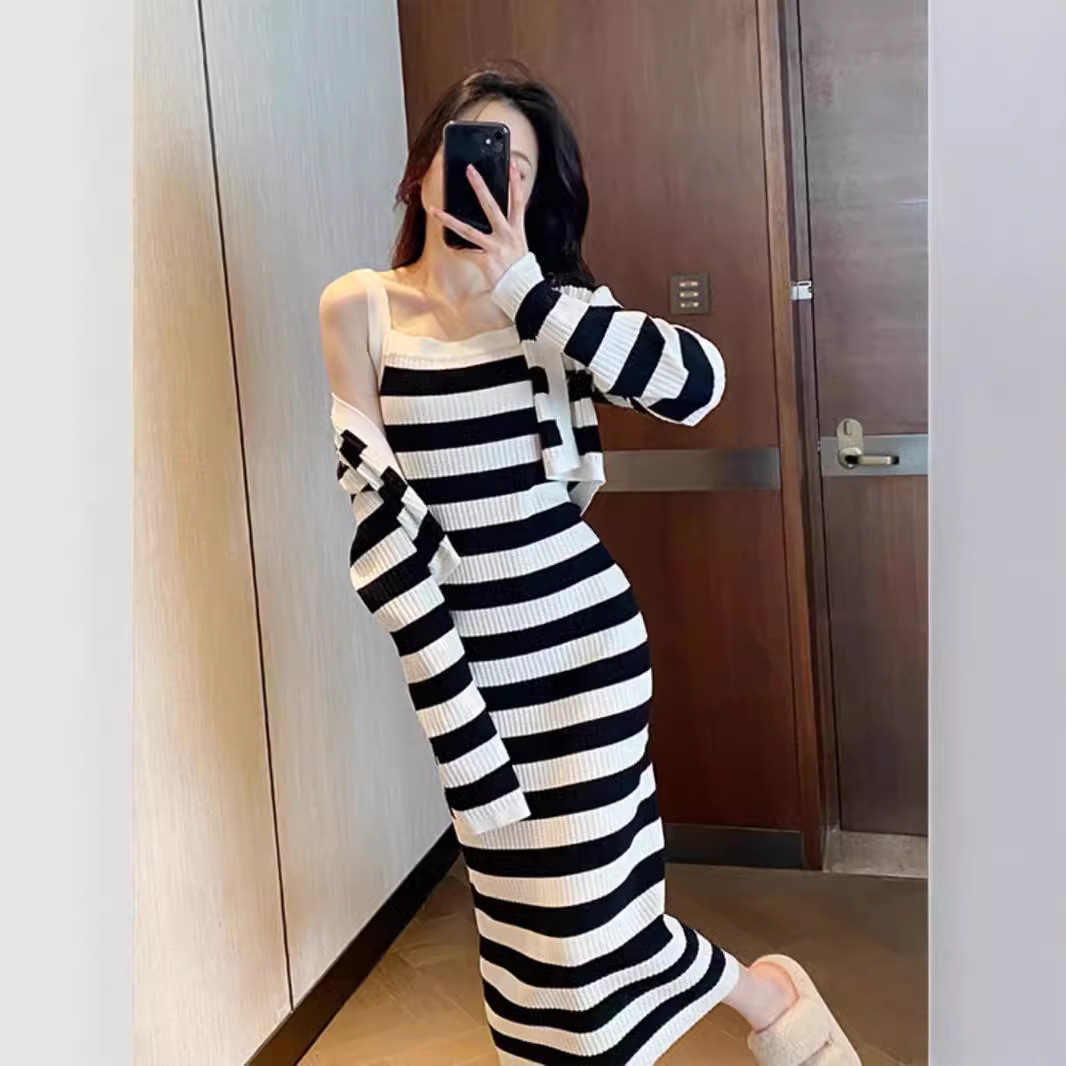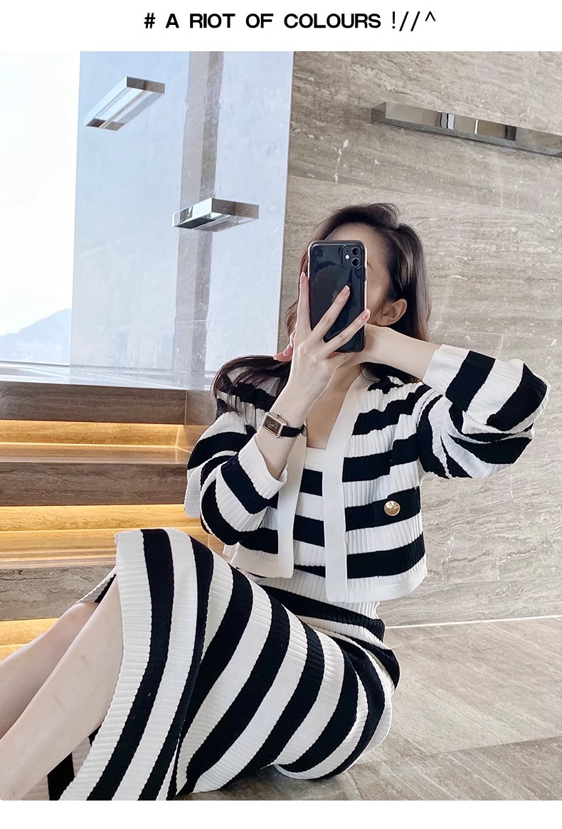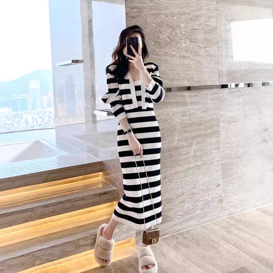 가을과 겨울 여성의 새로운 프랑스 고급 세련된 슬림 스트라이프 슬링 긴 스커트 니트 카디건 투피스 세트스토어 가기
