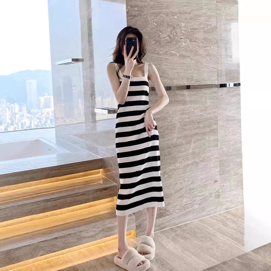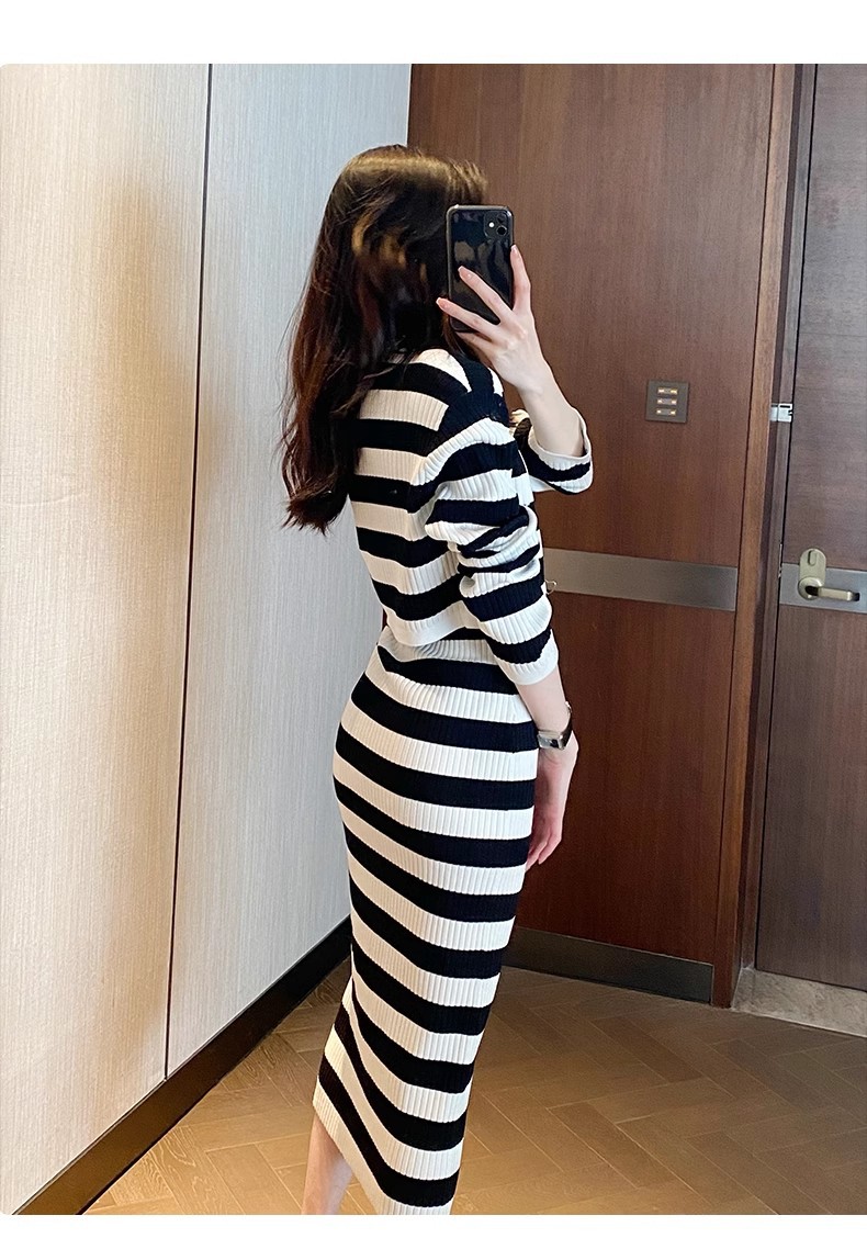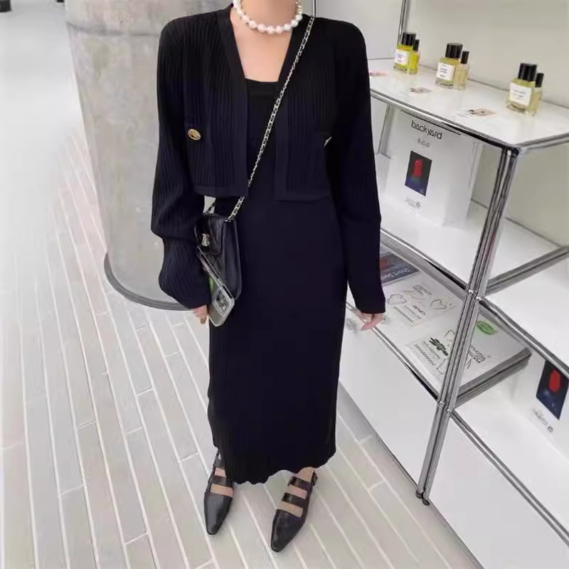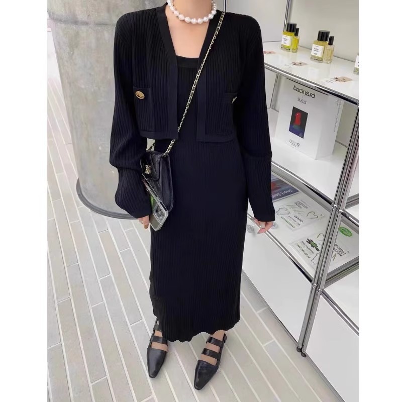 가을과 겨울 여성의 새로운 프랑스 고급 세련된 슬림 스트라이프 슬링 긴 스커트 니트 카디건 투피스 세트스토어 가기