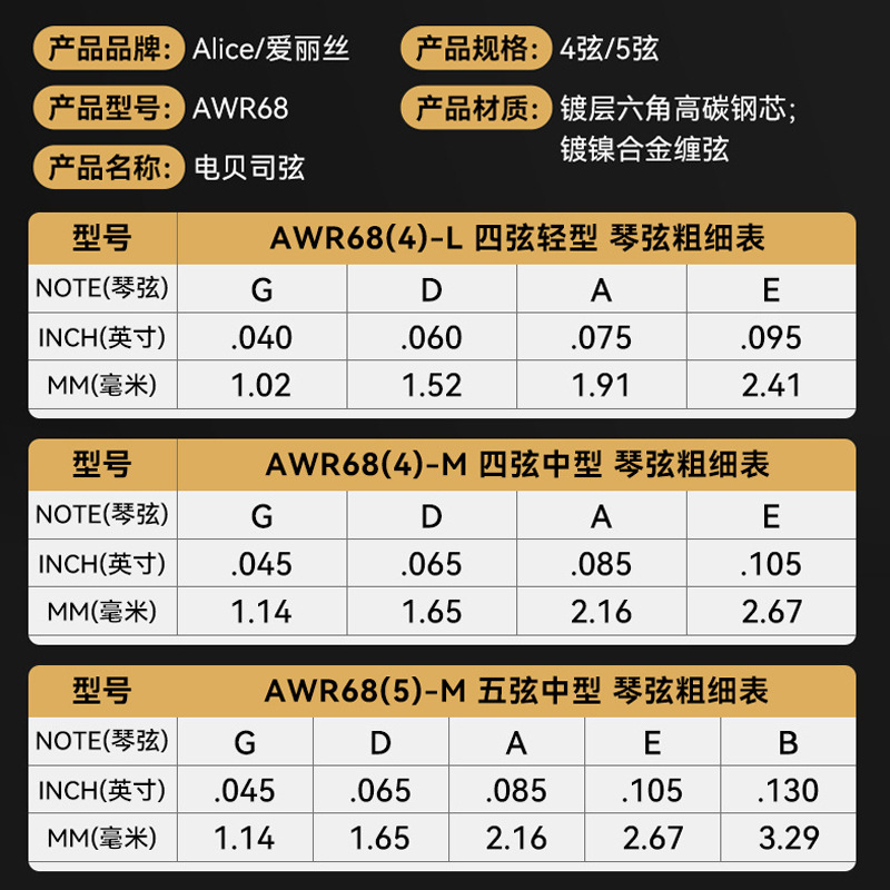 Alice AWR68 4 현 5 현 전기베이스 현악기 세트 세트 스트링 바스 문자열 액세서리