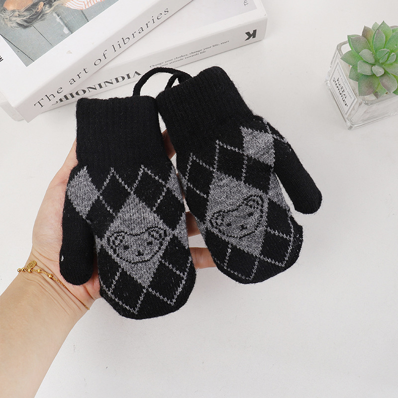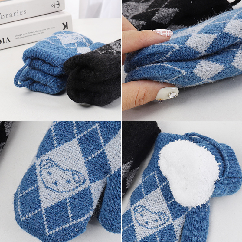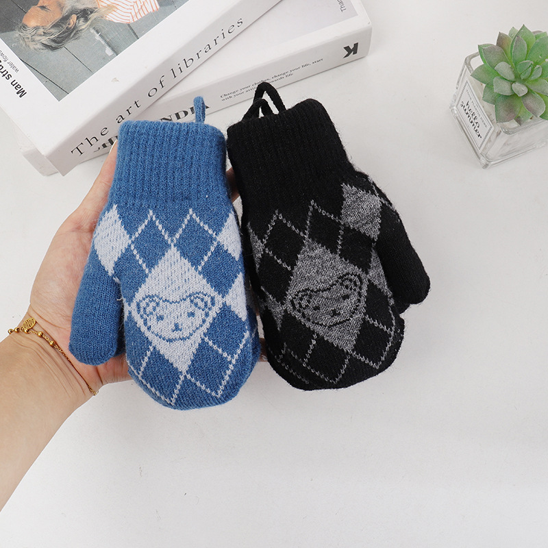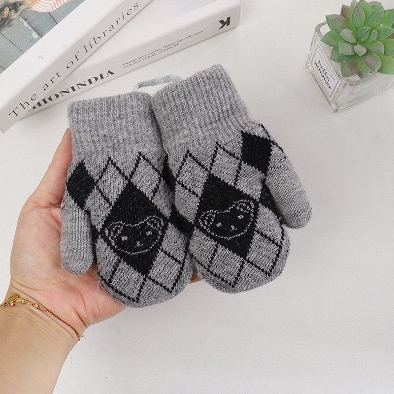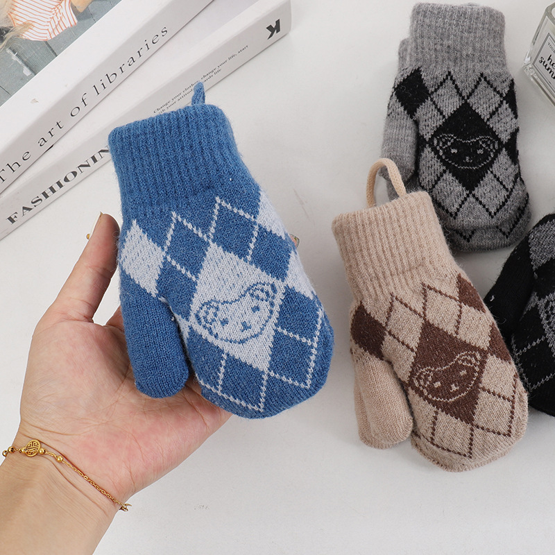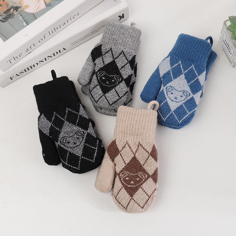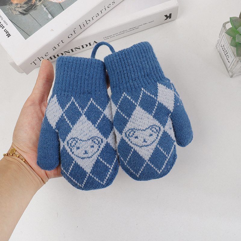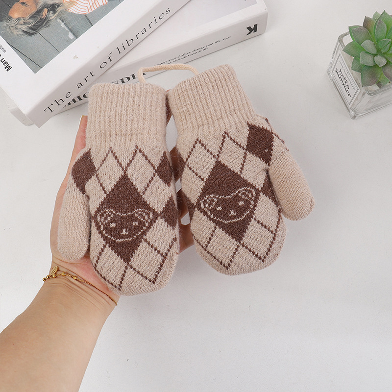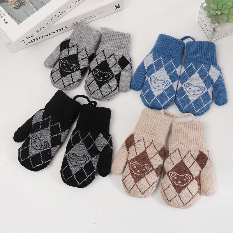 기모 두꺼운 어린이 북부 감기 방지 아웃 바운드 핑거 장갑 소년 소녀를위한 귀여운 목에 매달린 곰 니트 장갑
