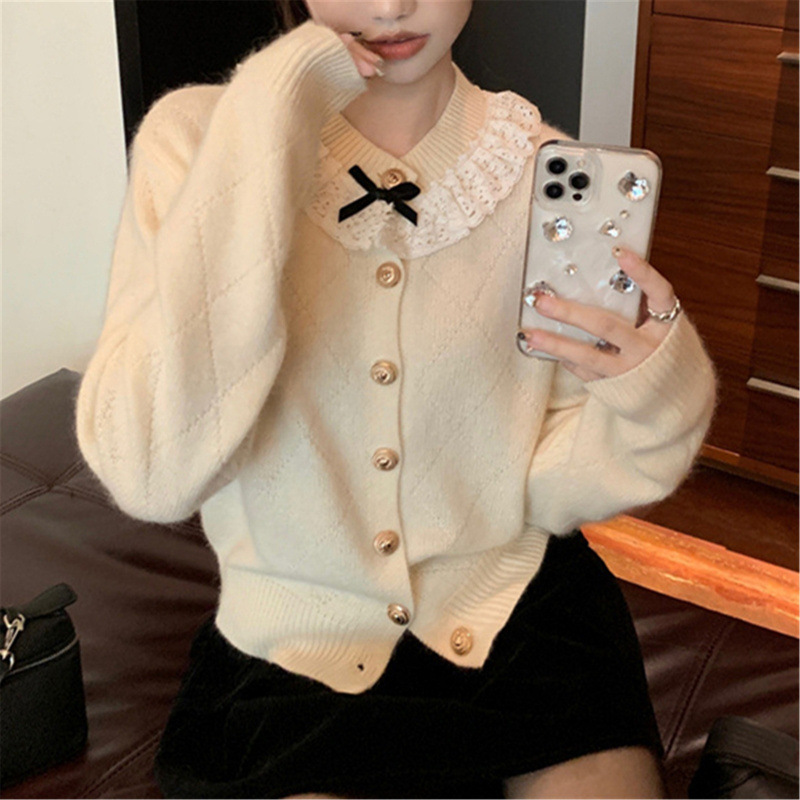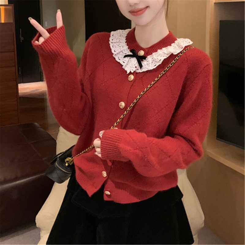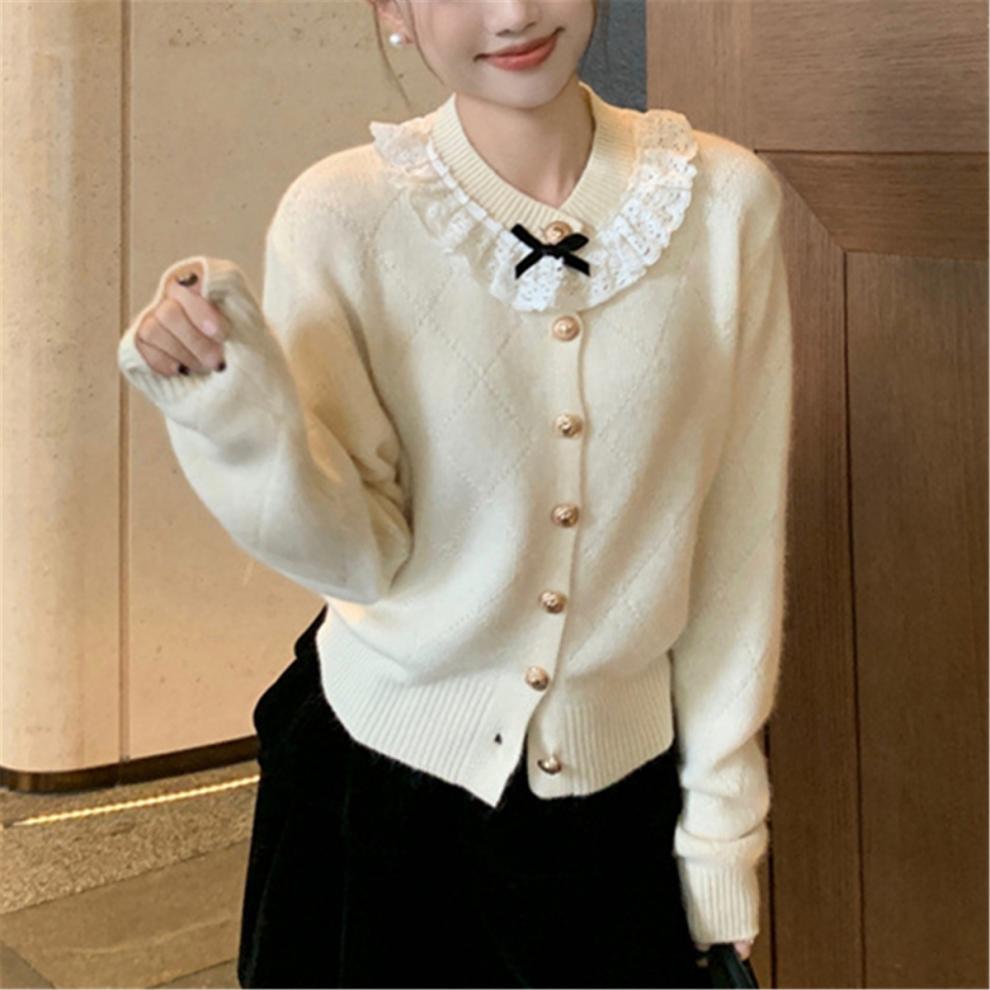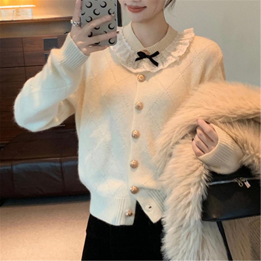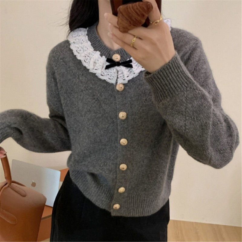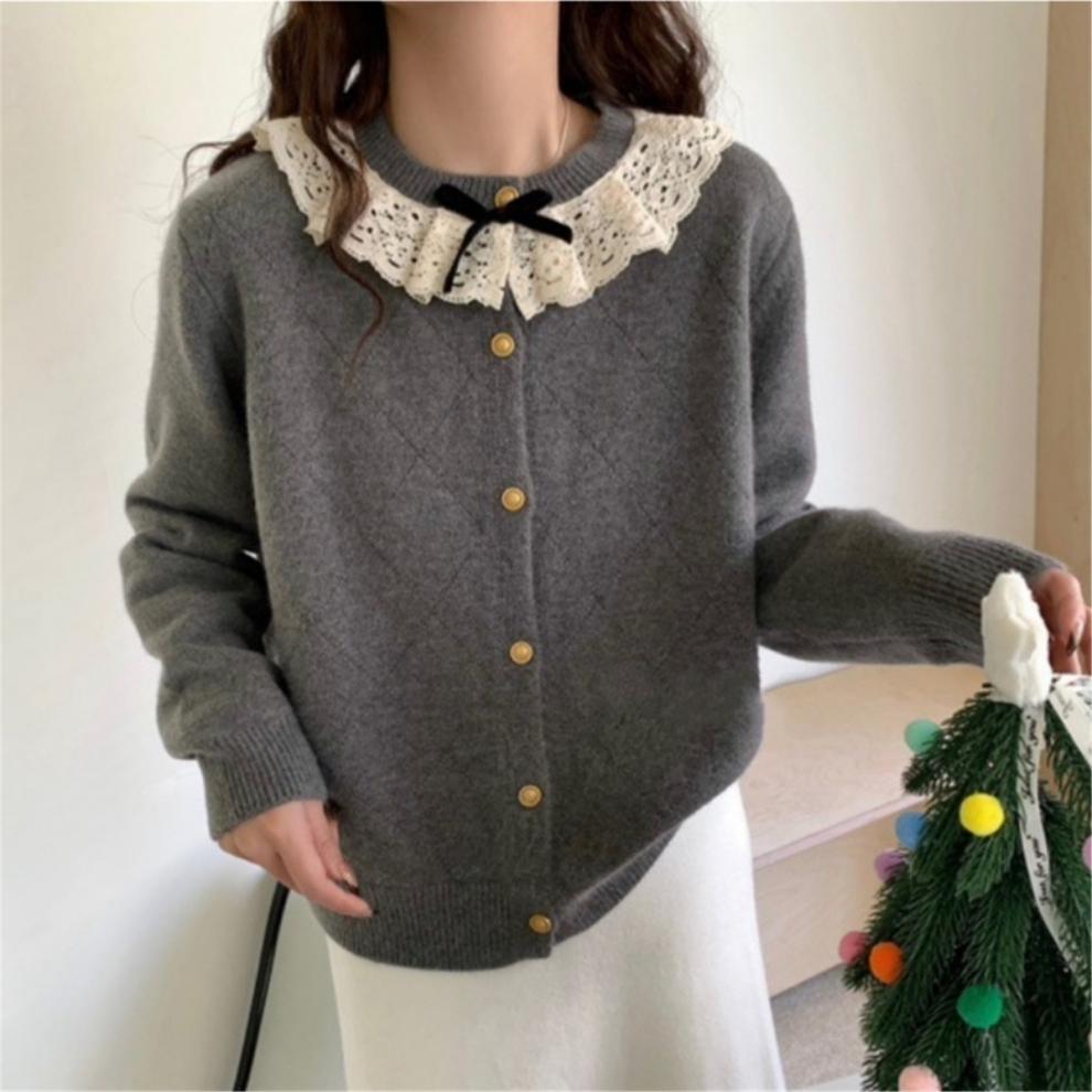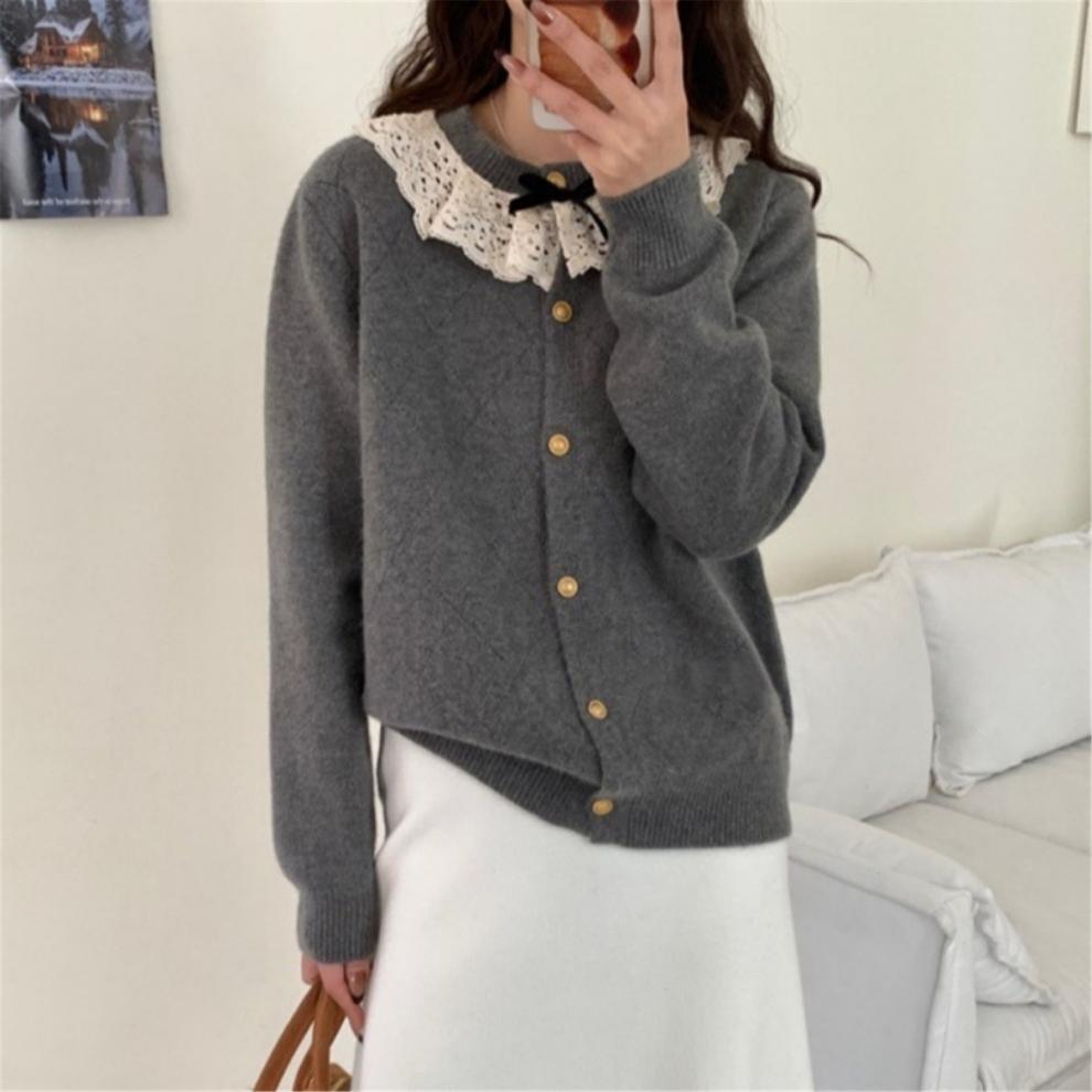 활 레이스 칼라 부드러운 왁스 같은 가을과 겨울 한국 스타일 분위기 달콤한 카디건 스웨터 여성용 니트 탑