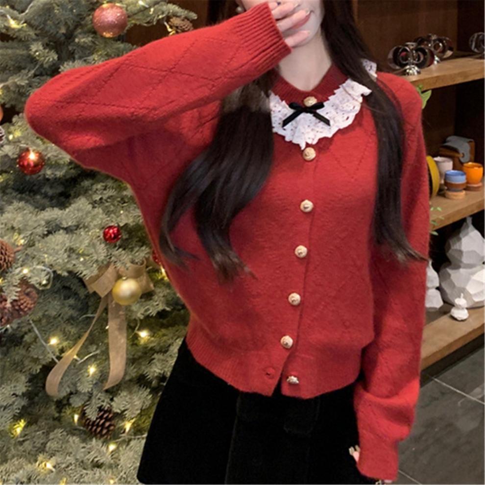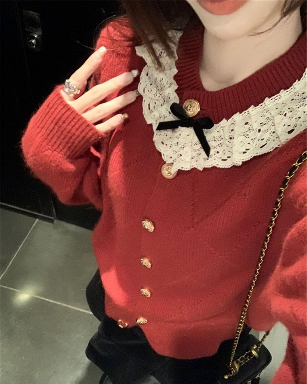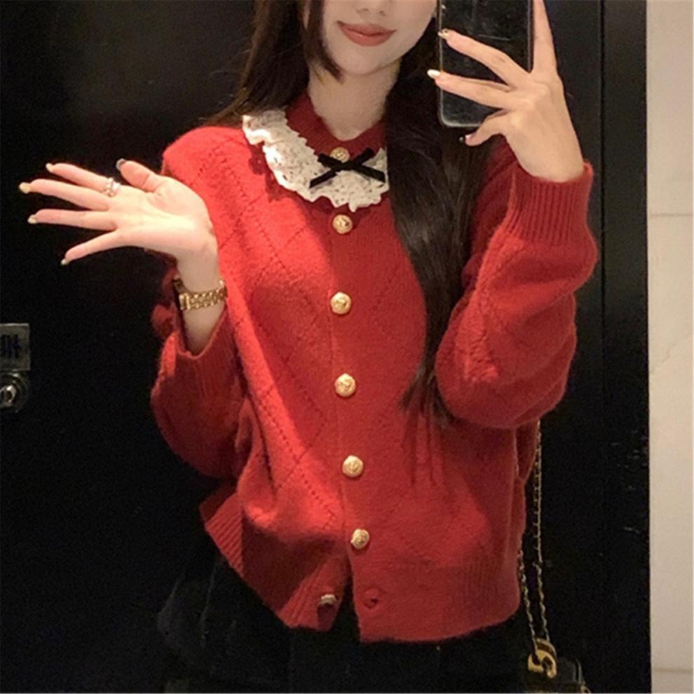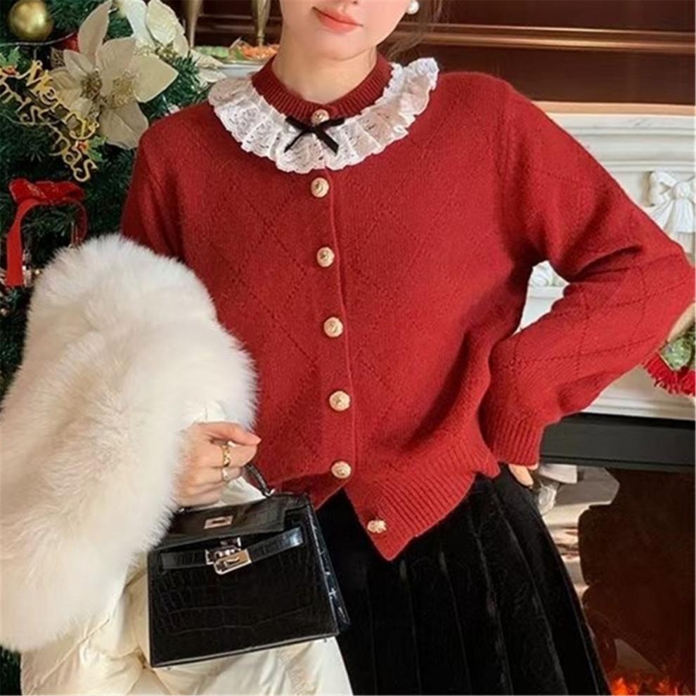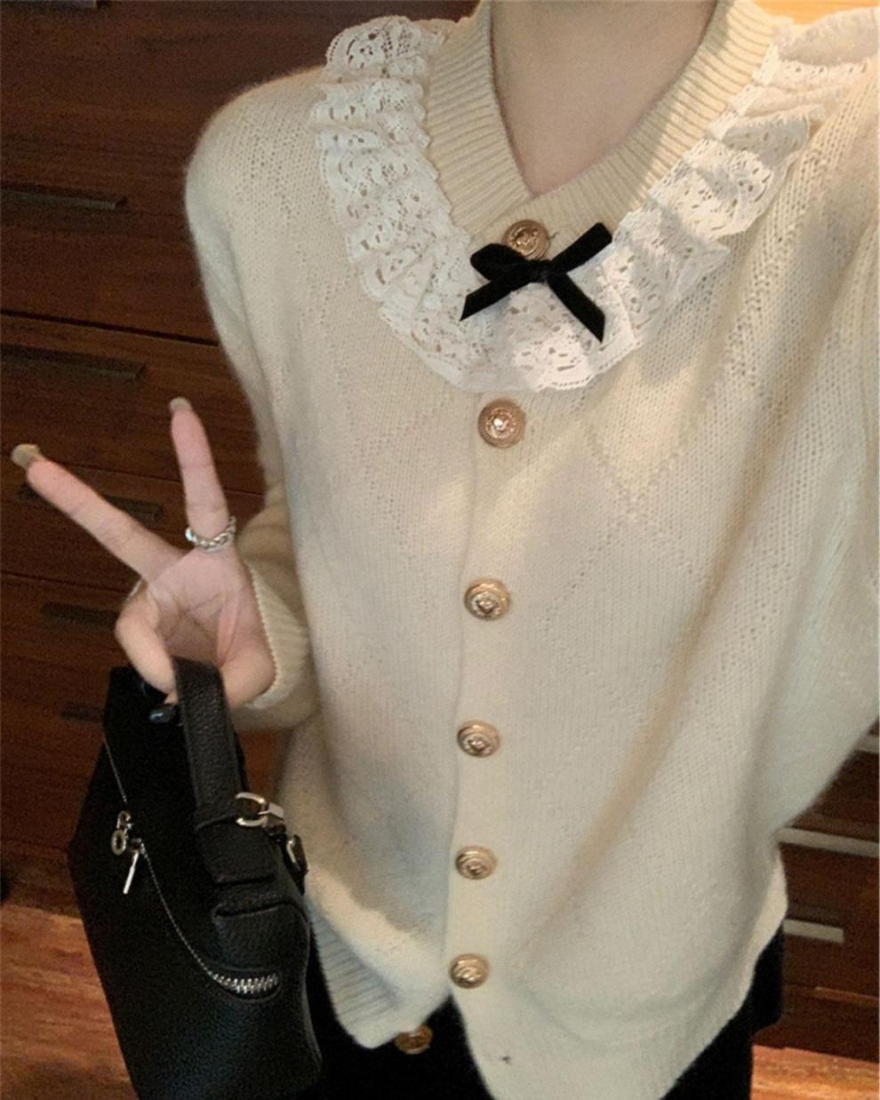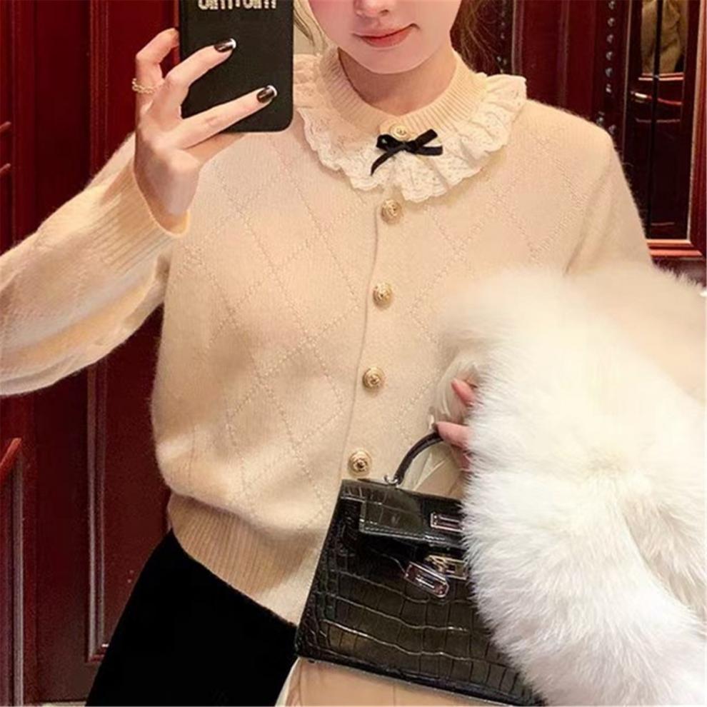 활 레이스 칼라 부드러운 왁스 같은 가을과 겨울 한국 스타일 분위기 달콤한 카디건 스웨터 여성용 니트 탑