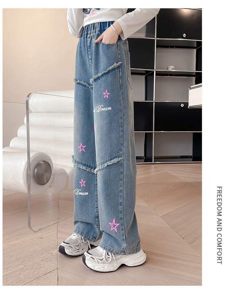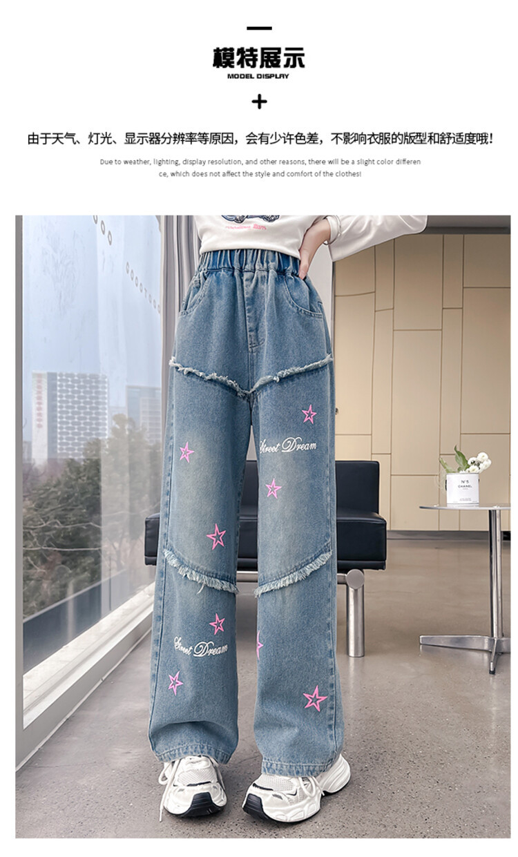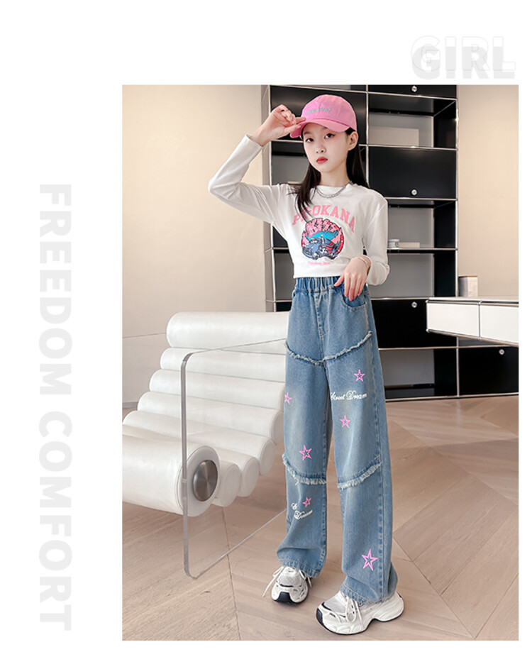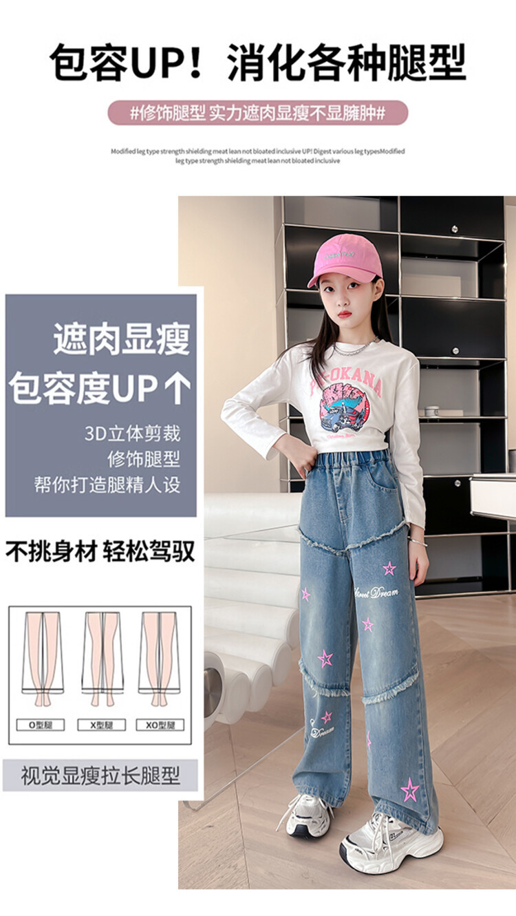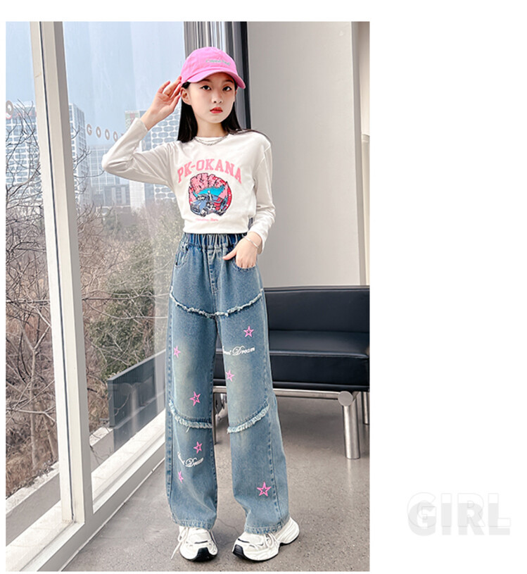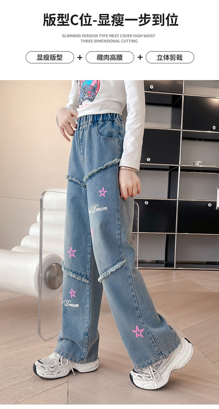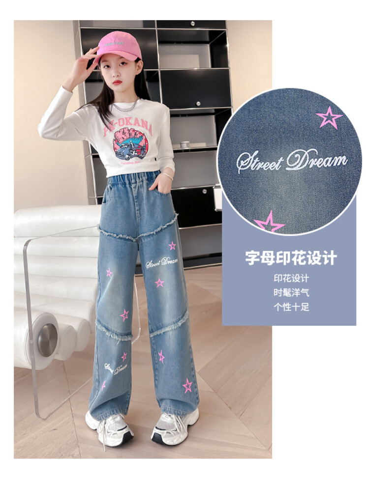 소녀 청바지 새로운 봄과 가을 패션 여성의 중대형 어린이 스트레이트 느슨한 넓은 다리 바지 바지 느슨한 슬림 인쇄