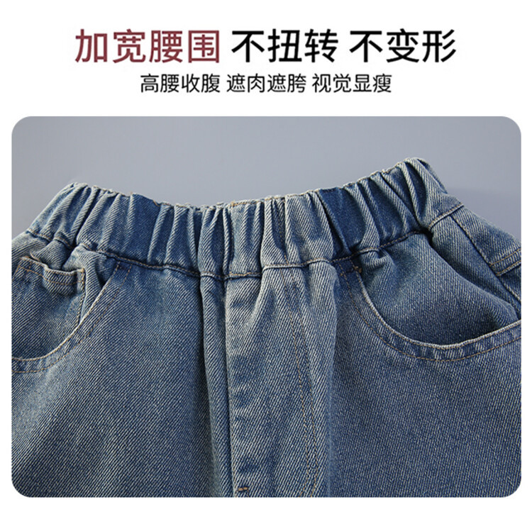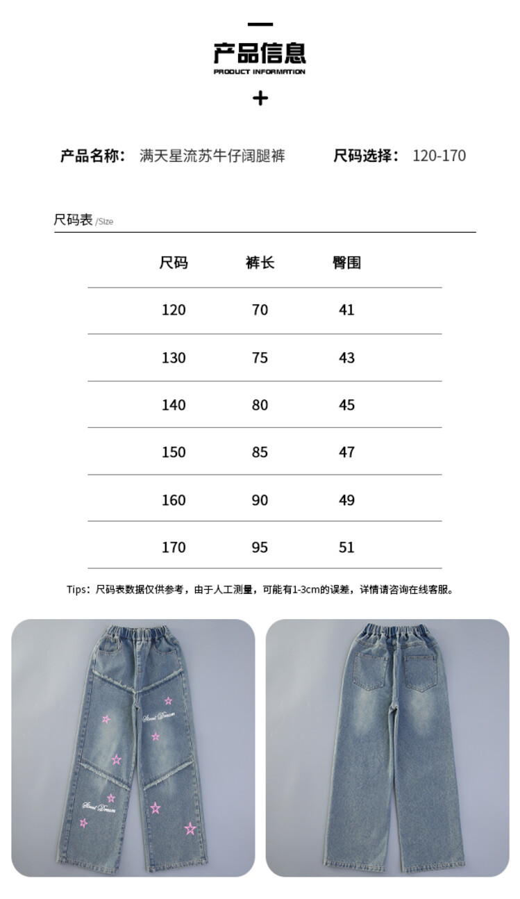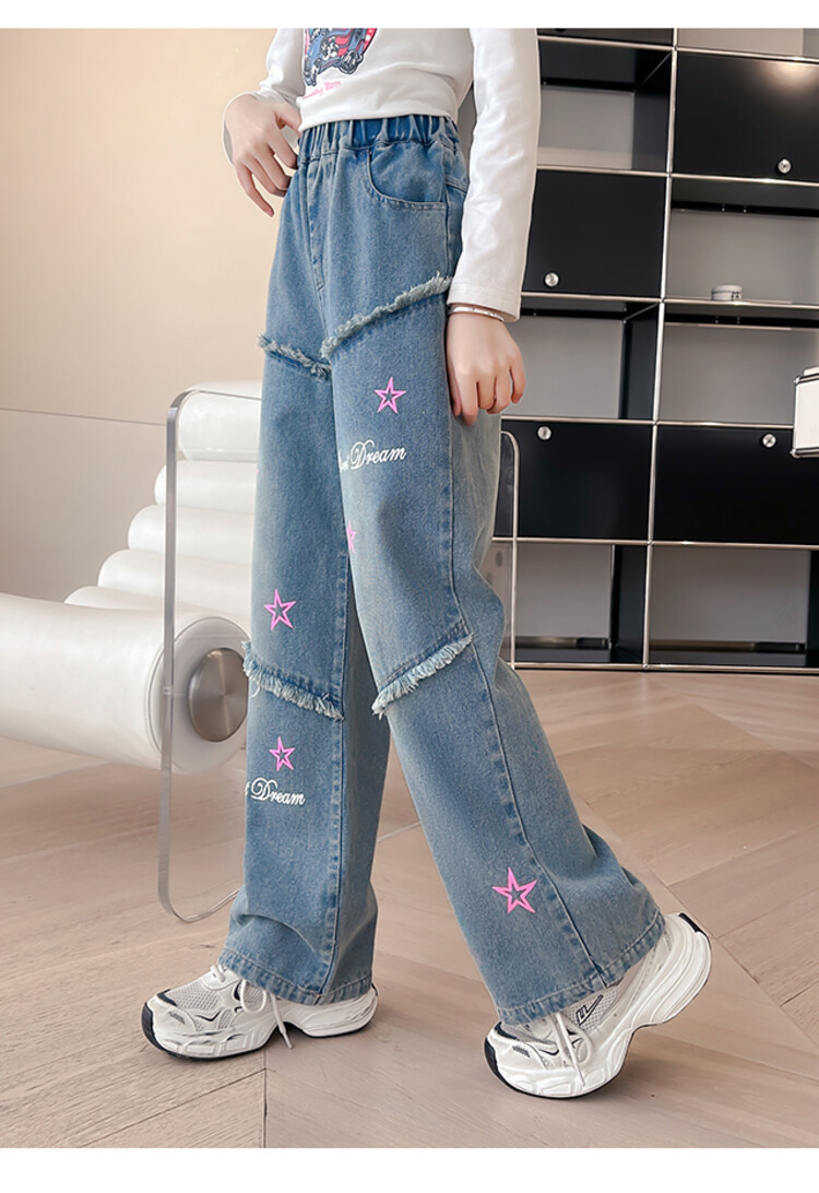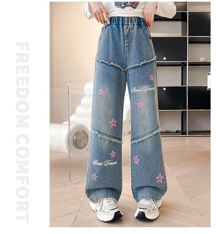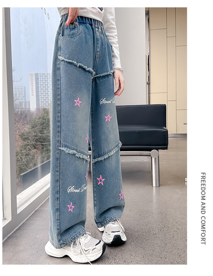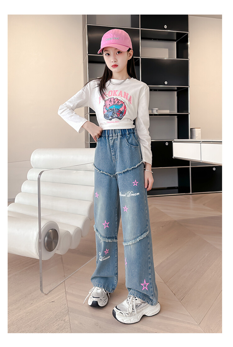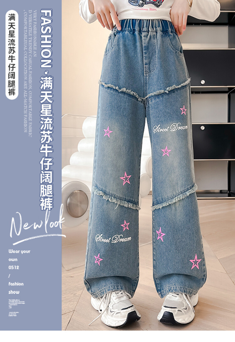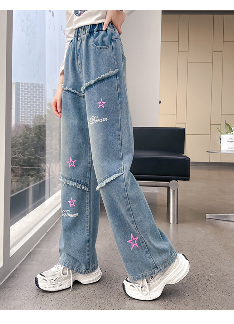 소녀 청바지 새로운 봄과 가을 패션 여성의 중대형 어린이 스트레이트 느슨한 넓은 다리 바지 바지 느슨한 슬림 인쇄