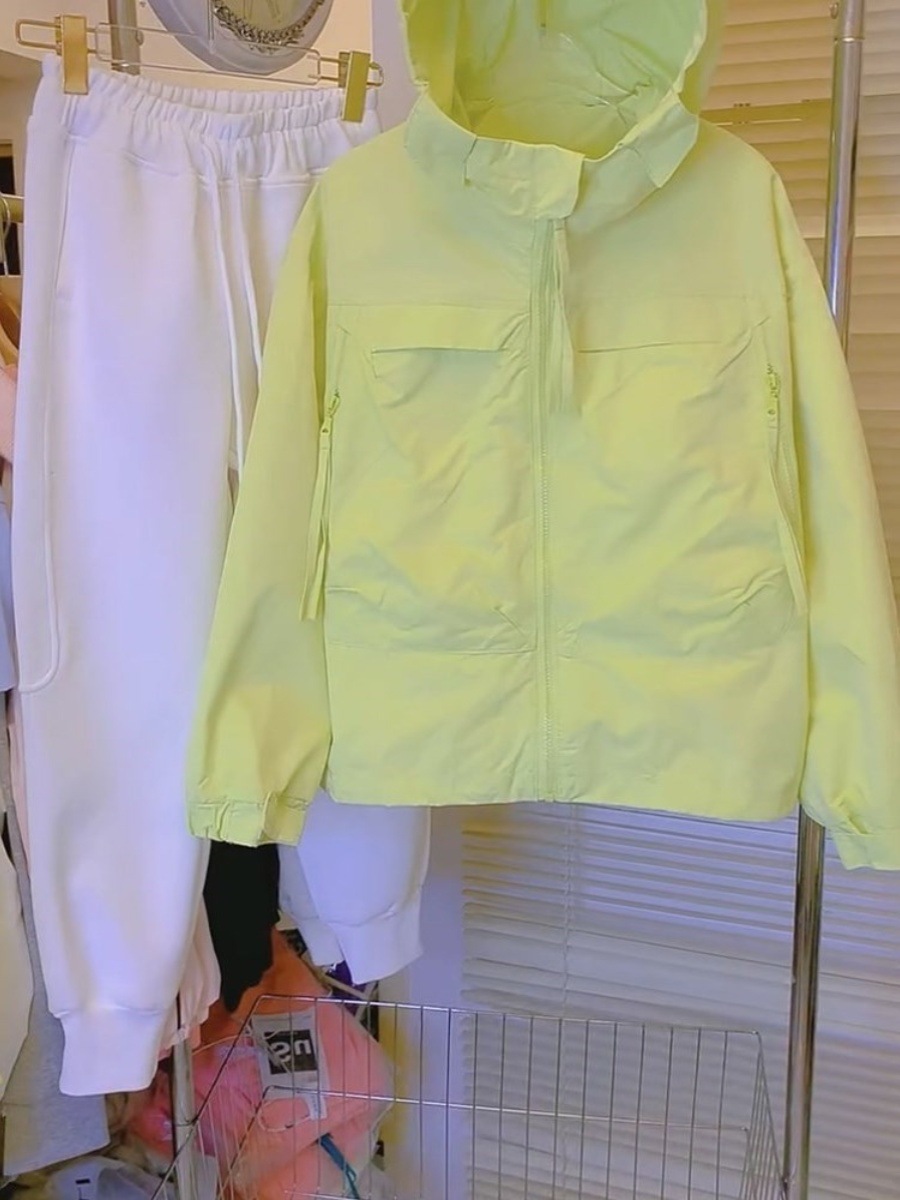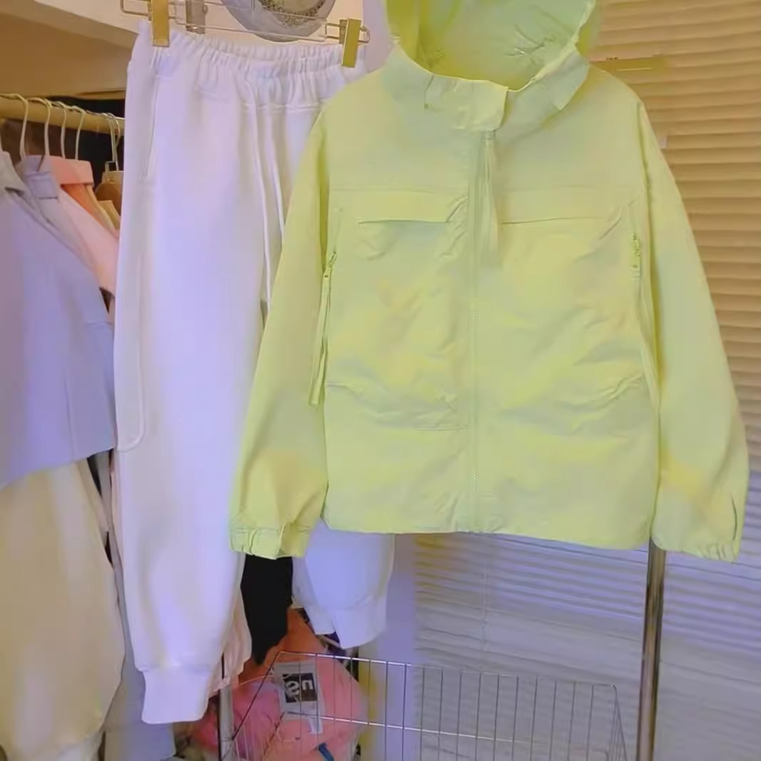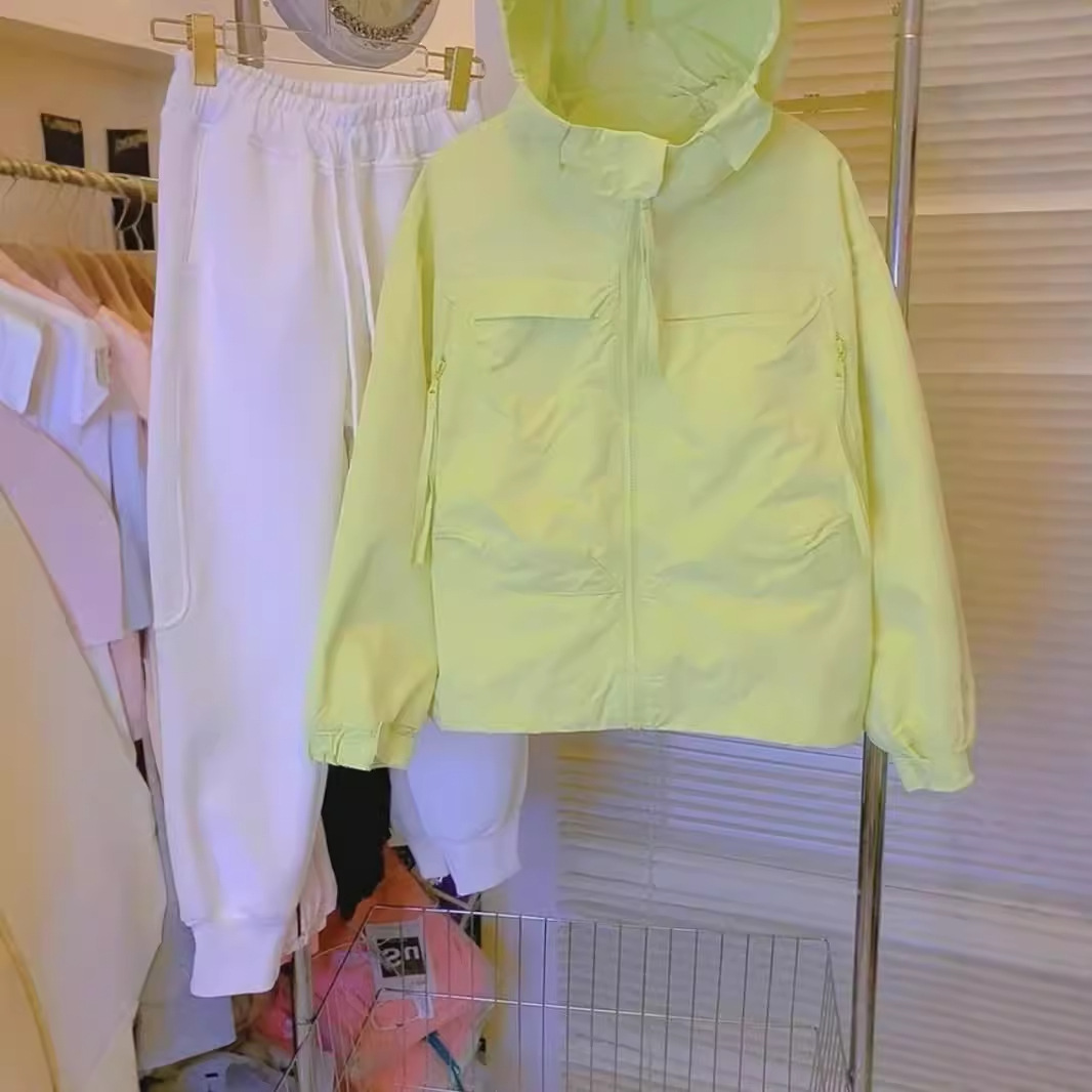 한국 스타일 느슨한 캐주얼 후드 큰 포켓 지퍼 노란색 충전 옷 여성의 2024 봄 선 스크린 작업 코트 코트스토어 가기