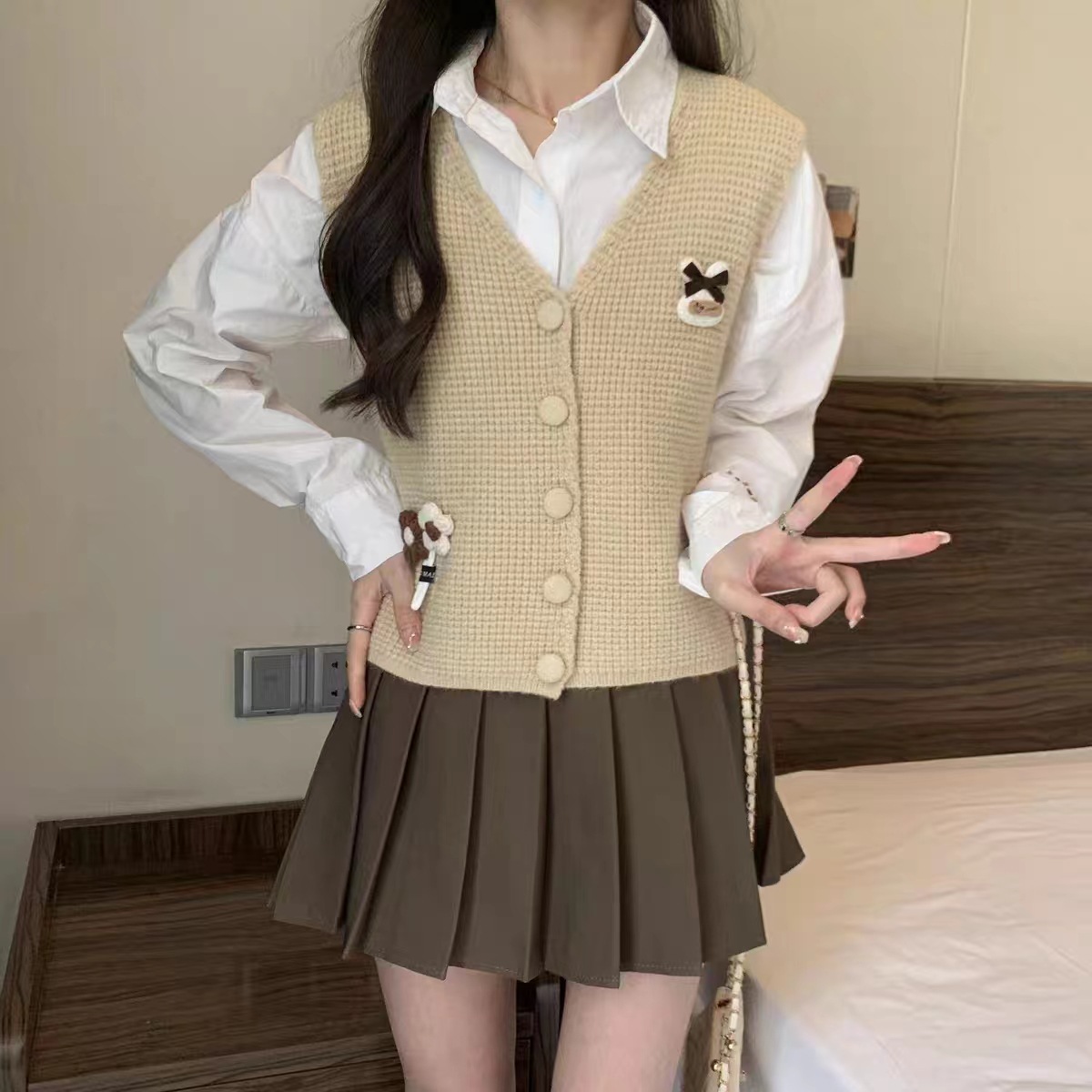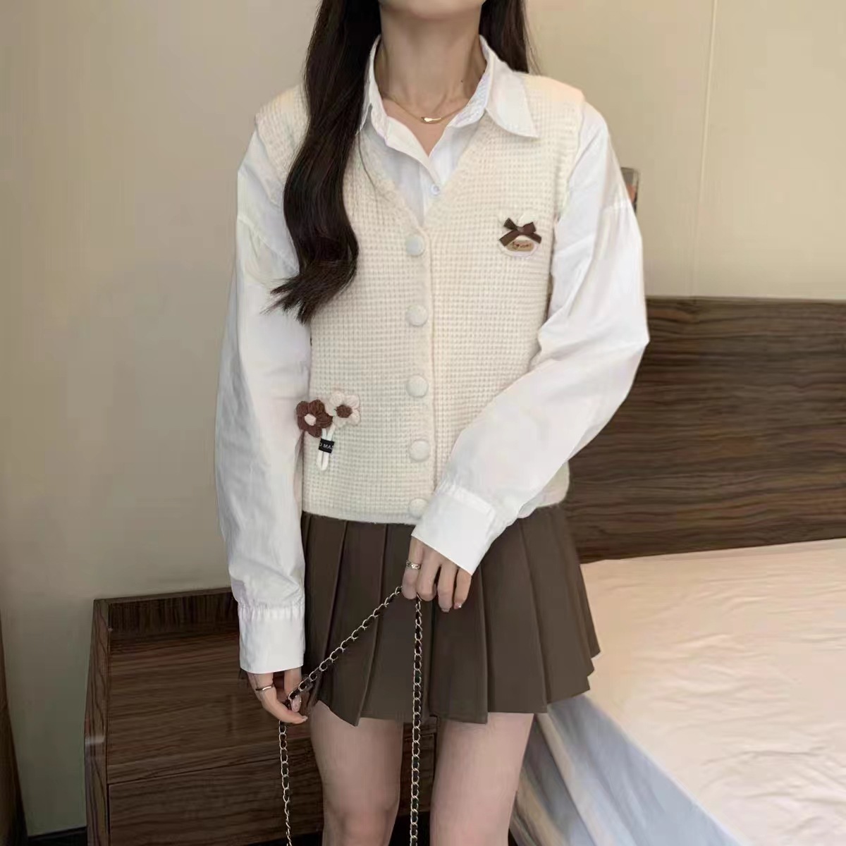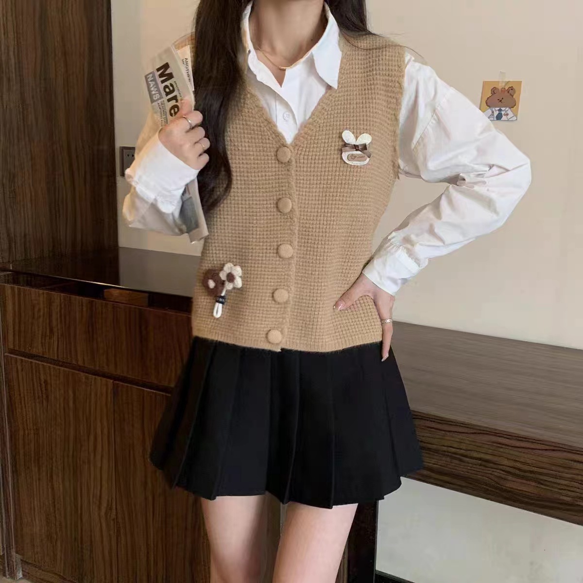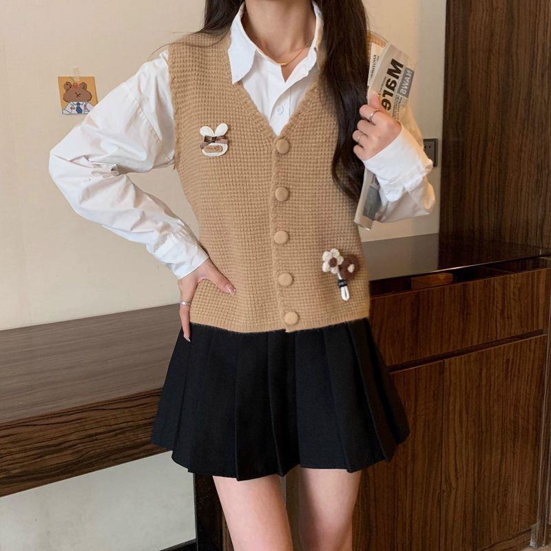 대학 스타일 3 차원 꽃 니트 솔리드 컬러 조끼 여성의 가을과 겨울 새로운 빈티지 V 넥 웨이스트 코트 쌓인 조끼