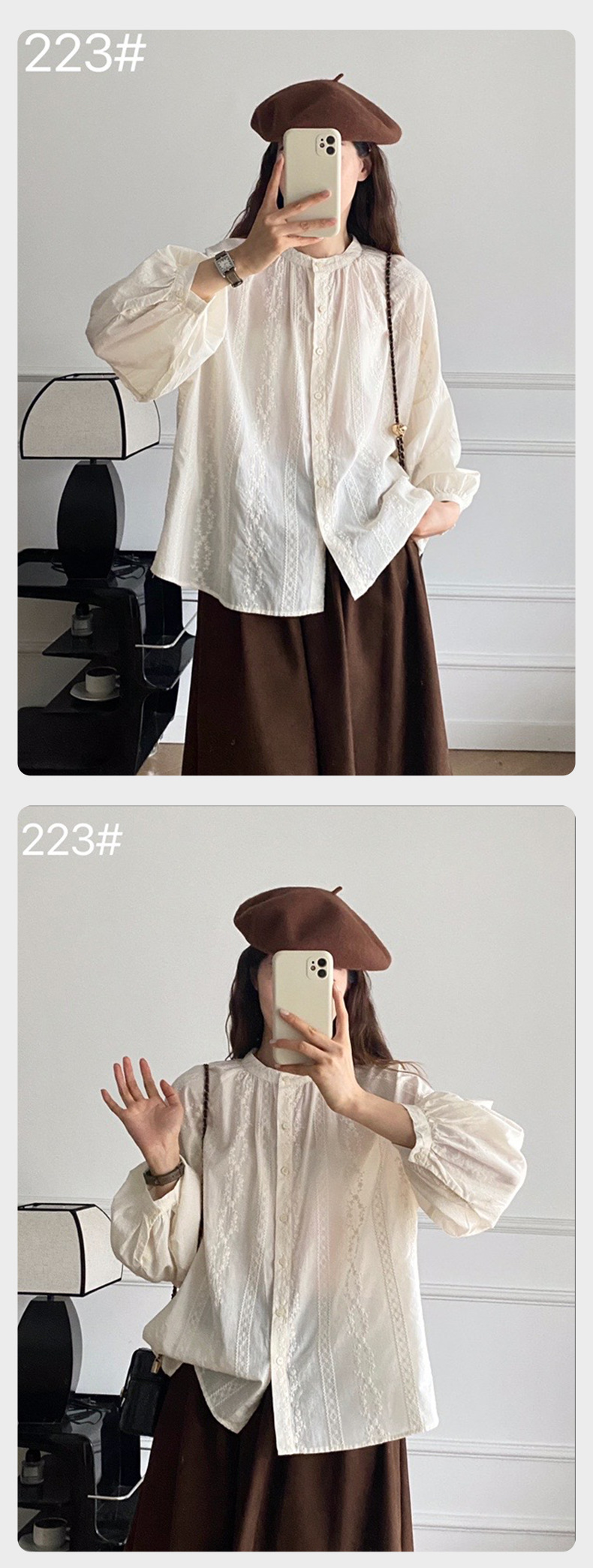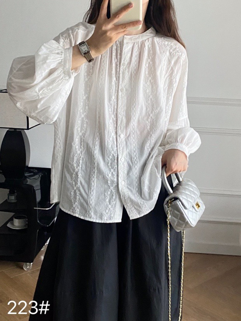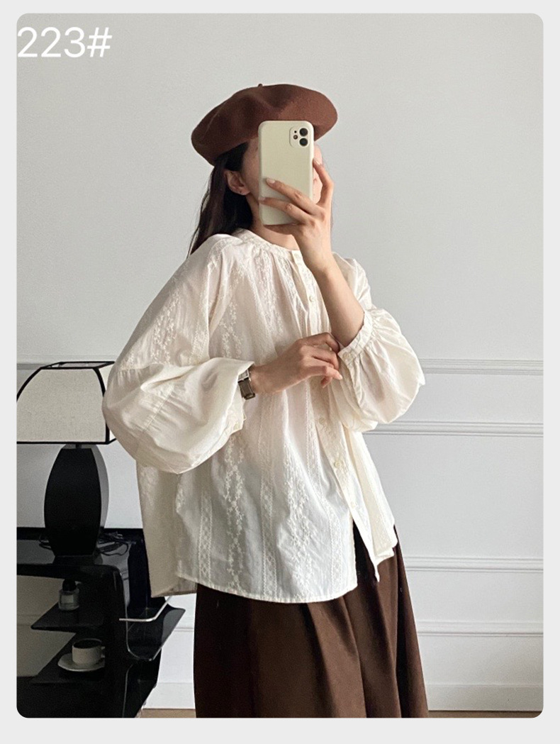이른 가을 프랑스 셔츠 최고 예술적 신선한 스타일 기질 일본 중공업 여성용 둥근 목 랜턴 슬리브 셔츠