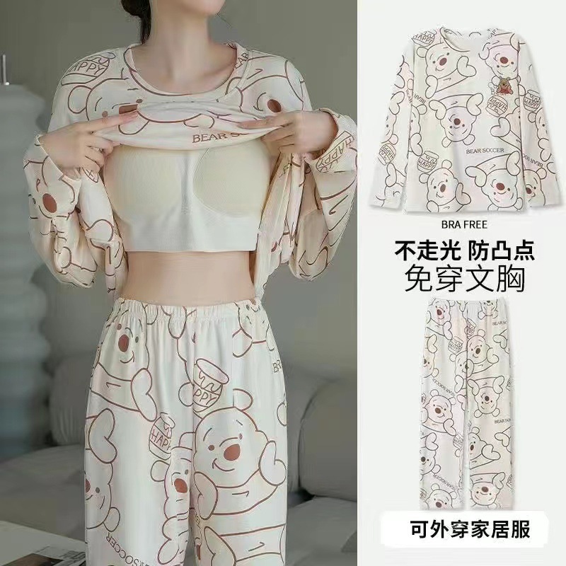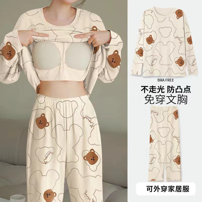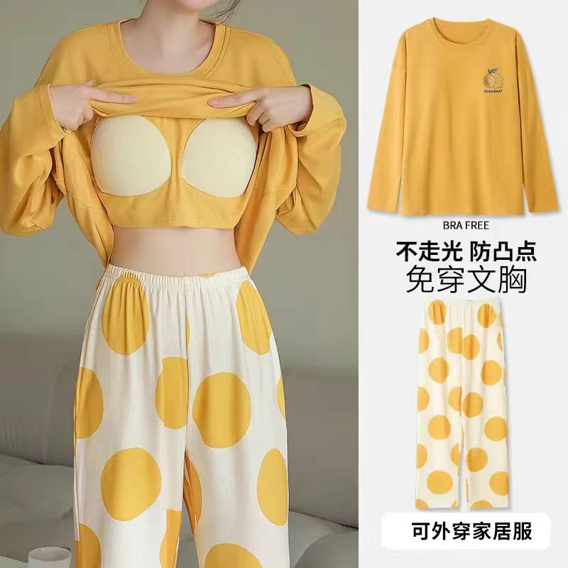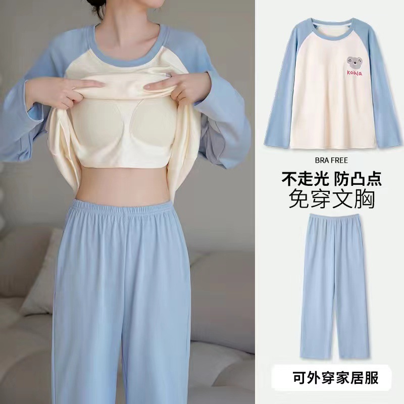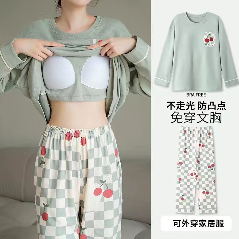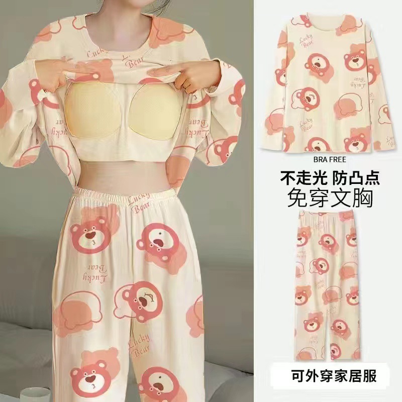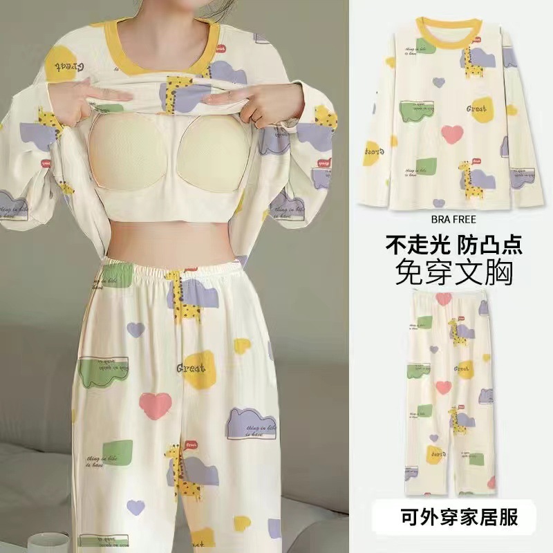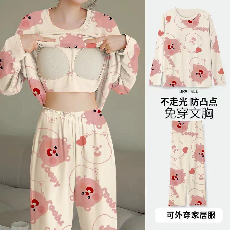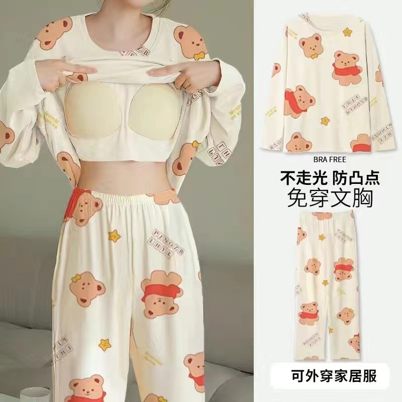 2024 봄과 가을에 가슴 패드를 가진 여성을위한 새로운 스타일 잠옷 긴 소매 바지 홈 의류 세트 캐주얼 의상스토어 가기