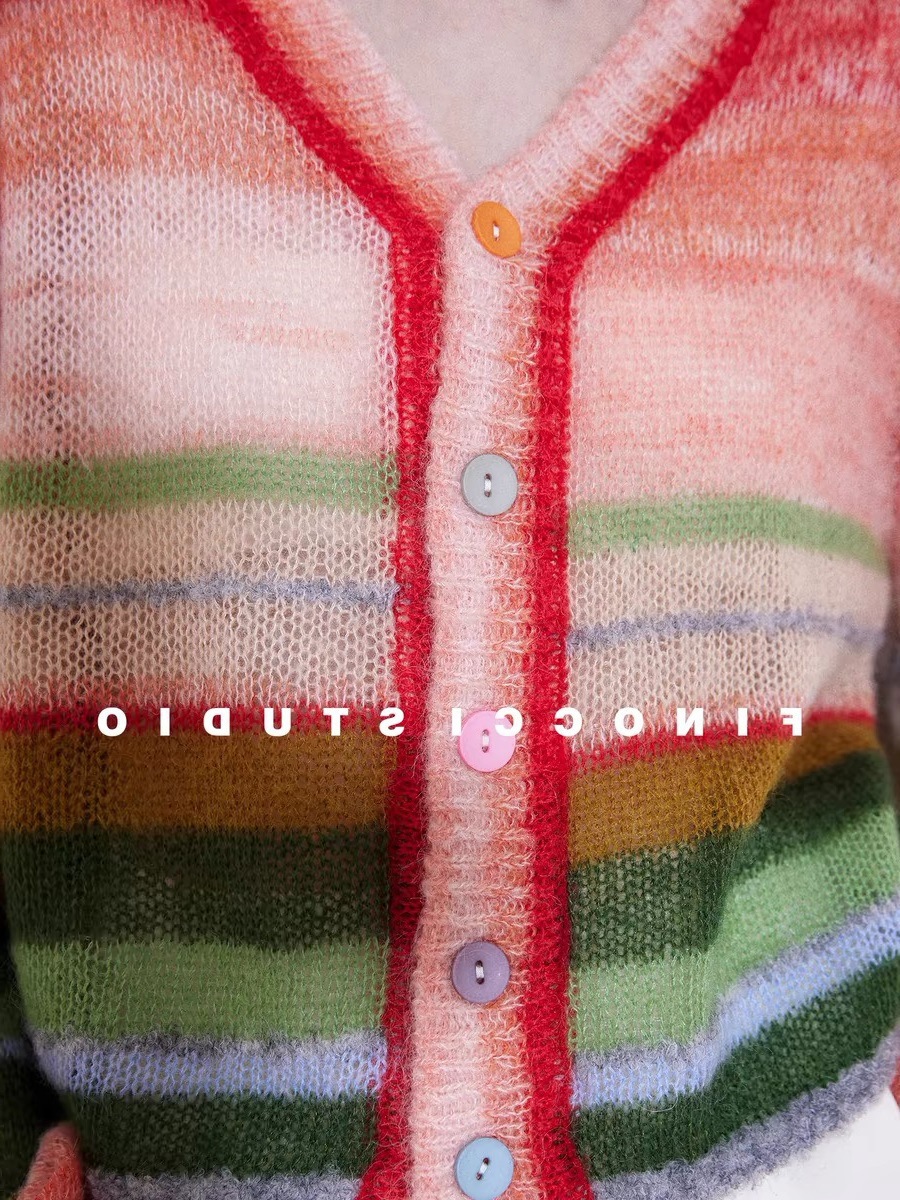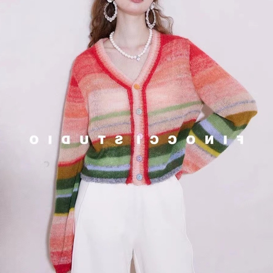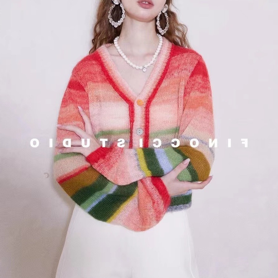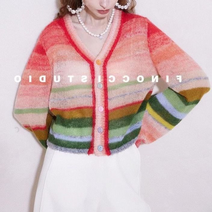 FINOCI 봄 남아프리카 수입 모헤어 무지개 대비 색상 복고풍 세련된 고급 랜턴 소매 울 카디건