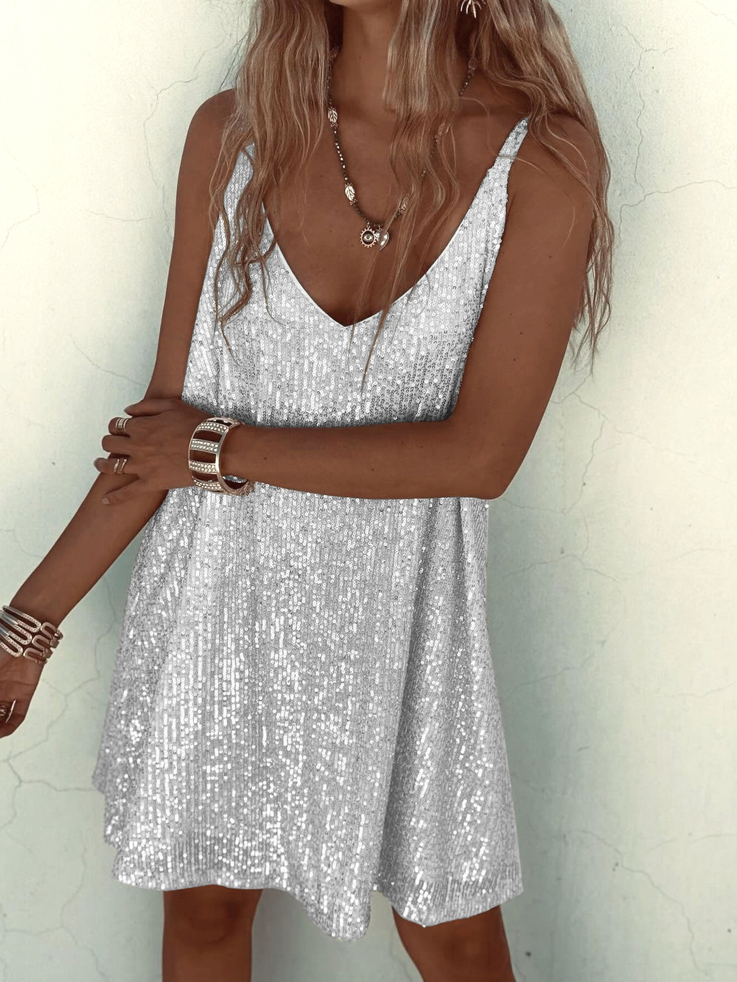 여름 신상 여성용 스팽글 민소매 브이넥 솔리드 컬러 루즈핏 패셔너블 섹시한 슬립 스타일 휴가룩 원피스스토어 가기