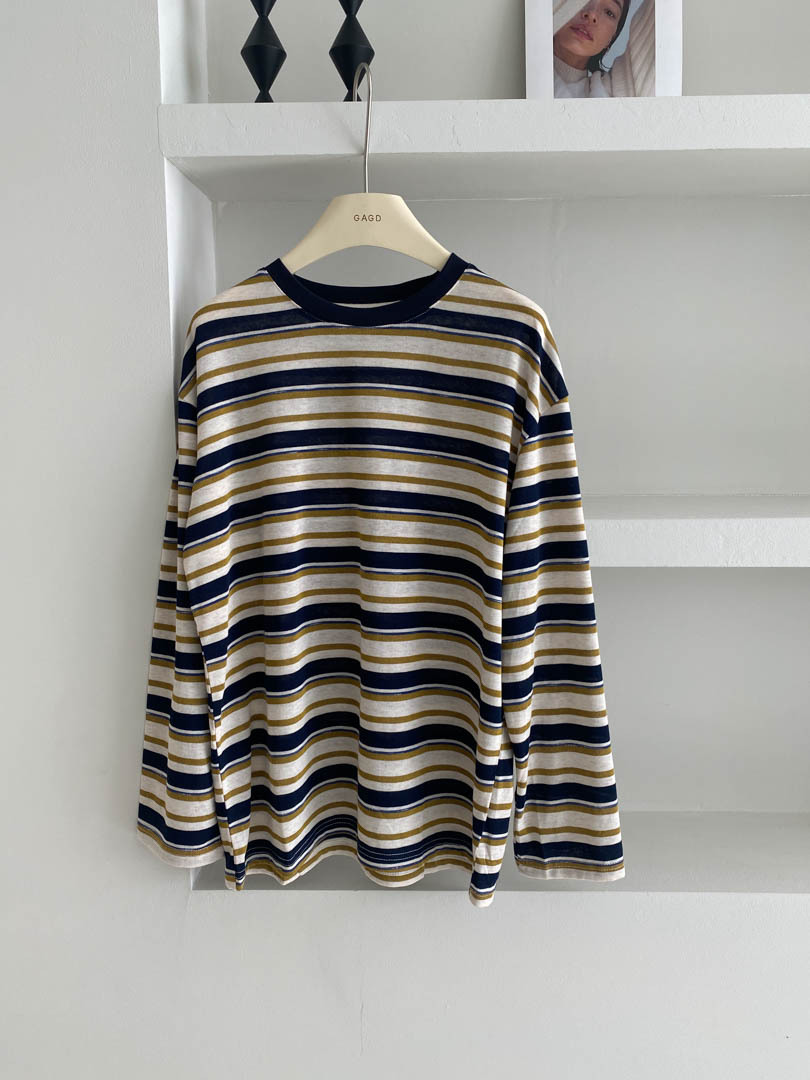 의류 파라다이스 "미우 스트라이프 컨트롤" 원사 염색 자카드 콘트라스트 컬러 스트라이프 긴팔 스웨터 여성의 중간 길이 바닥