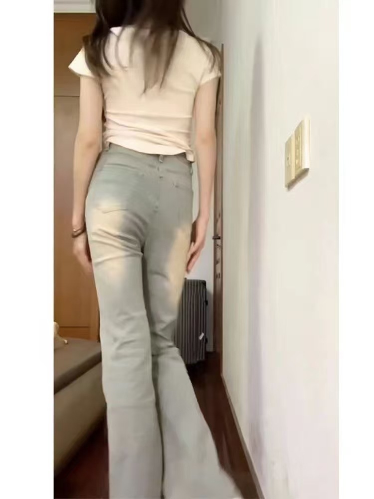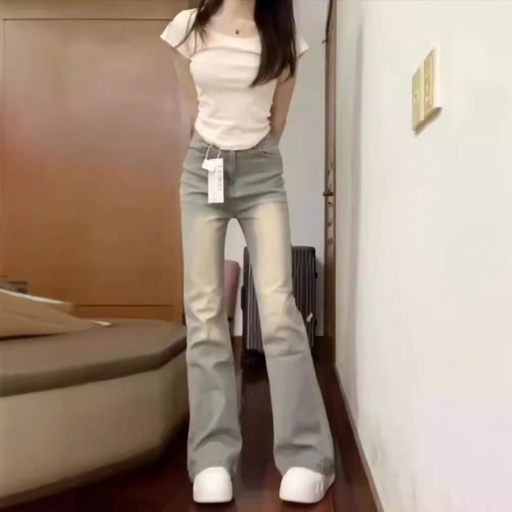 작은 옷을 입은 노란색 진흙 마이크로 플레어 청바지 여성의 새로운 한국식 하이 웨이스트 슬림 핏 슬리밍 바지