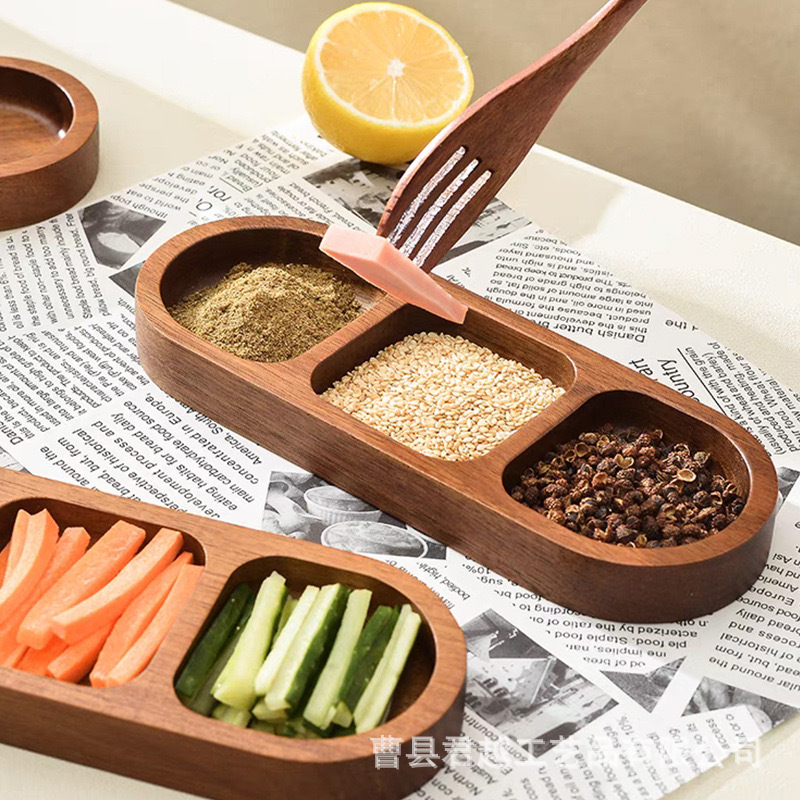 원목 조미료 접시, 가정용 원목 스낵 접시, 전골 바베큐 3칸 소스 접시, 스낵 접시, 나무 접시
