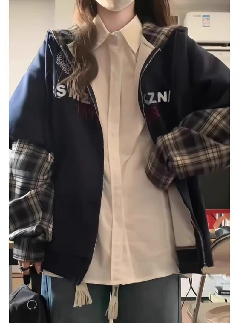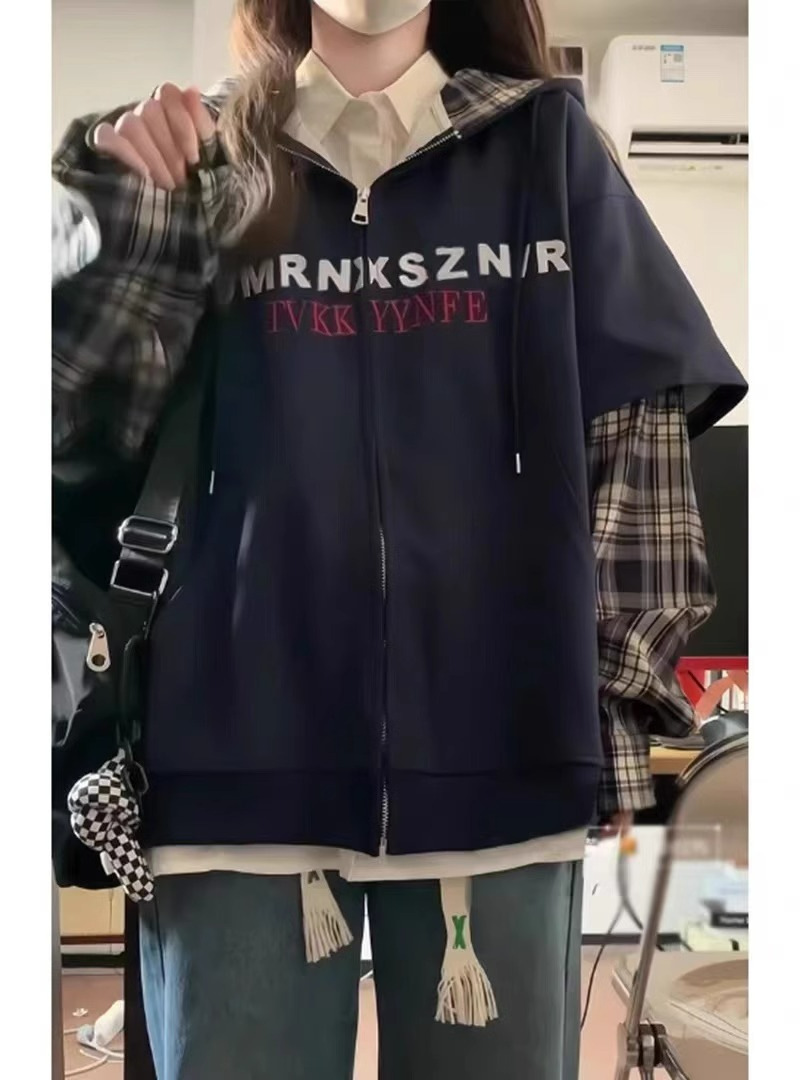 한국 패션 격자 무늬 바느질 가짜 투피스 후드 스웨터 여성 플러스 사이즈 통통녀 디자인 감각 느슨한 카디건 재킷 BF스토어 가기