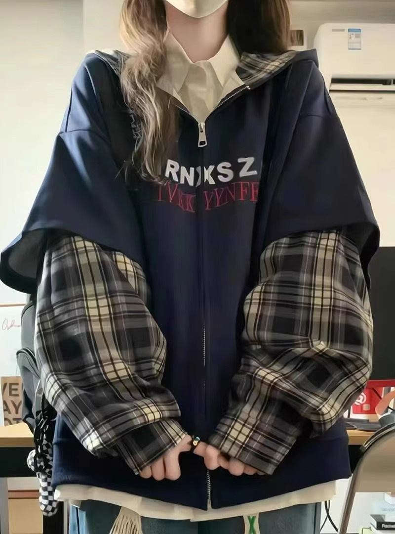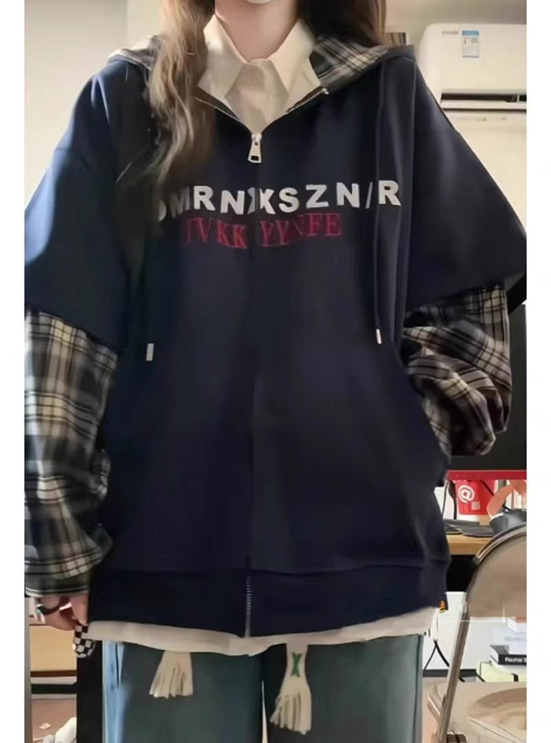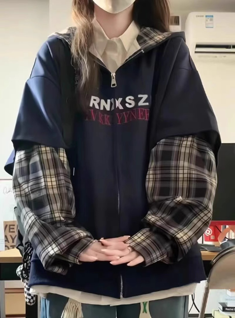 한국 패션 격자 무늬 바느질 가짜 투피스 후드 스웨터 여성 플러스 사이즈 통통녀 디자인 감각 느슨한 카디건 재킷 BF