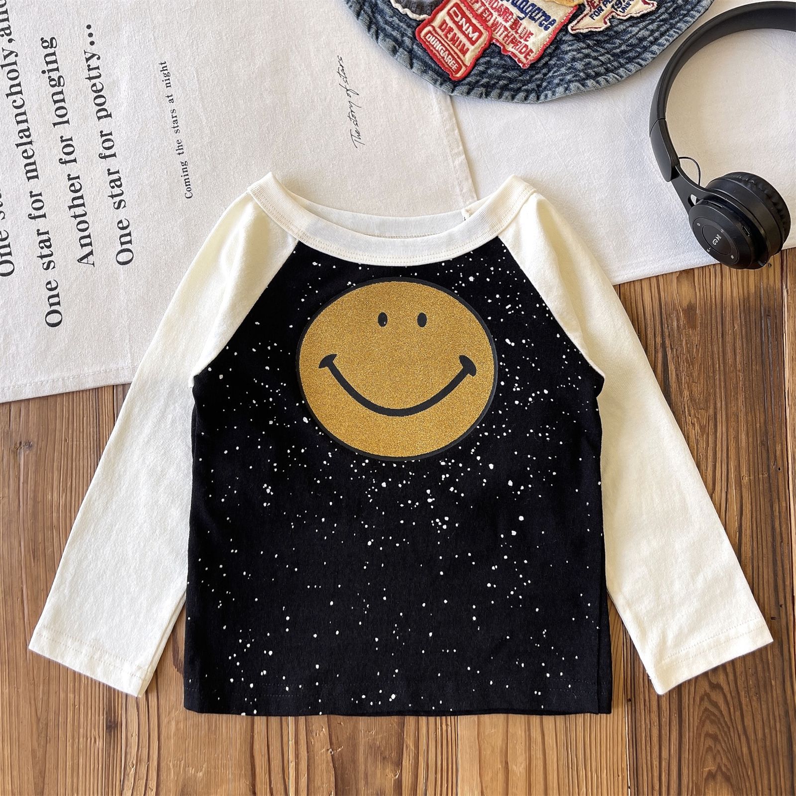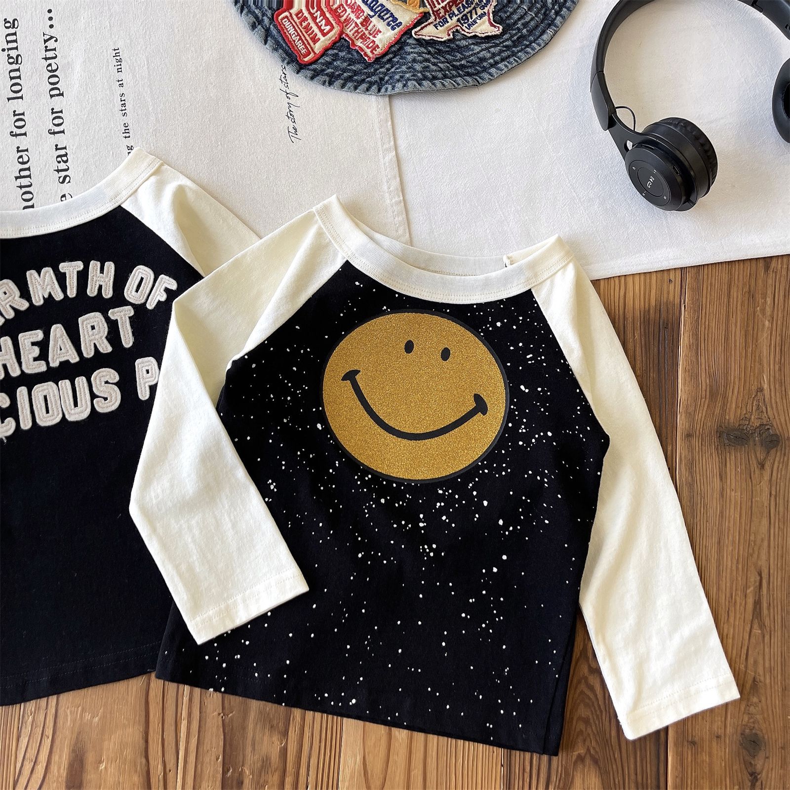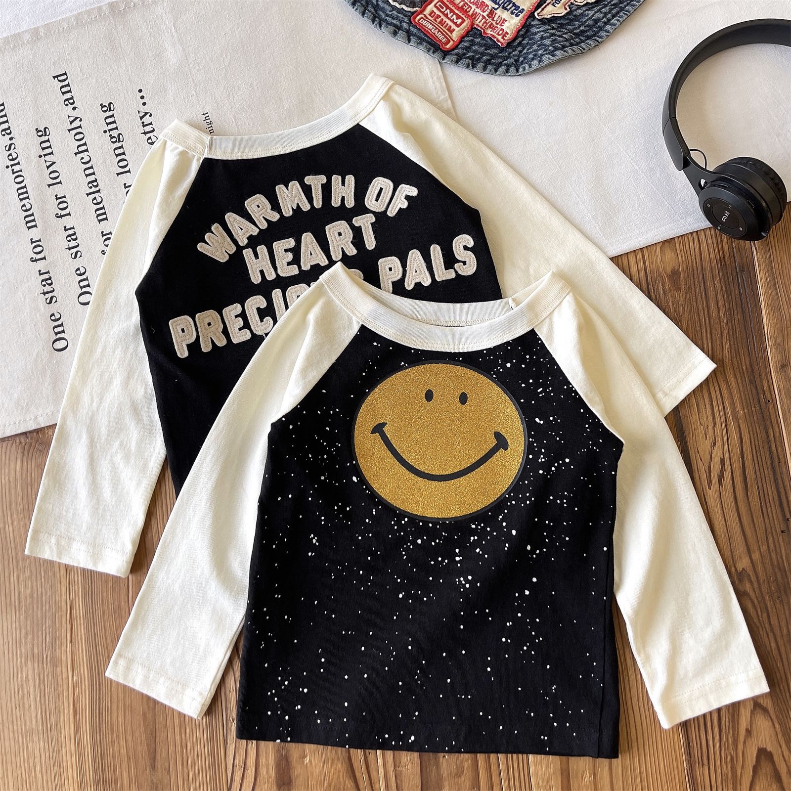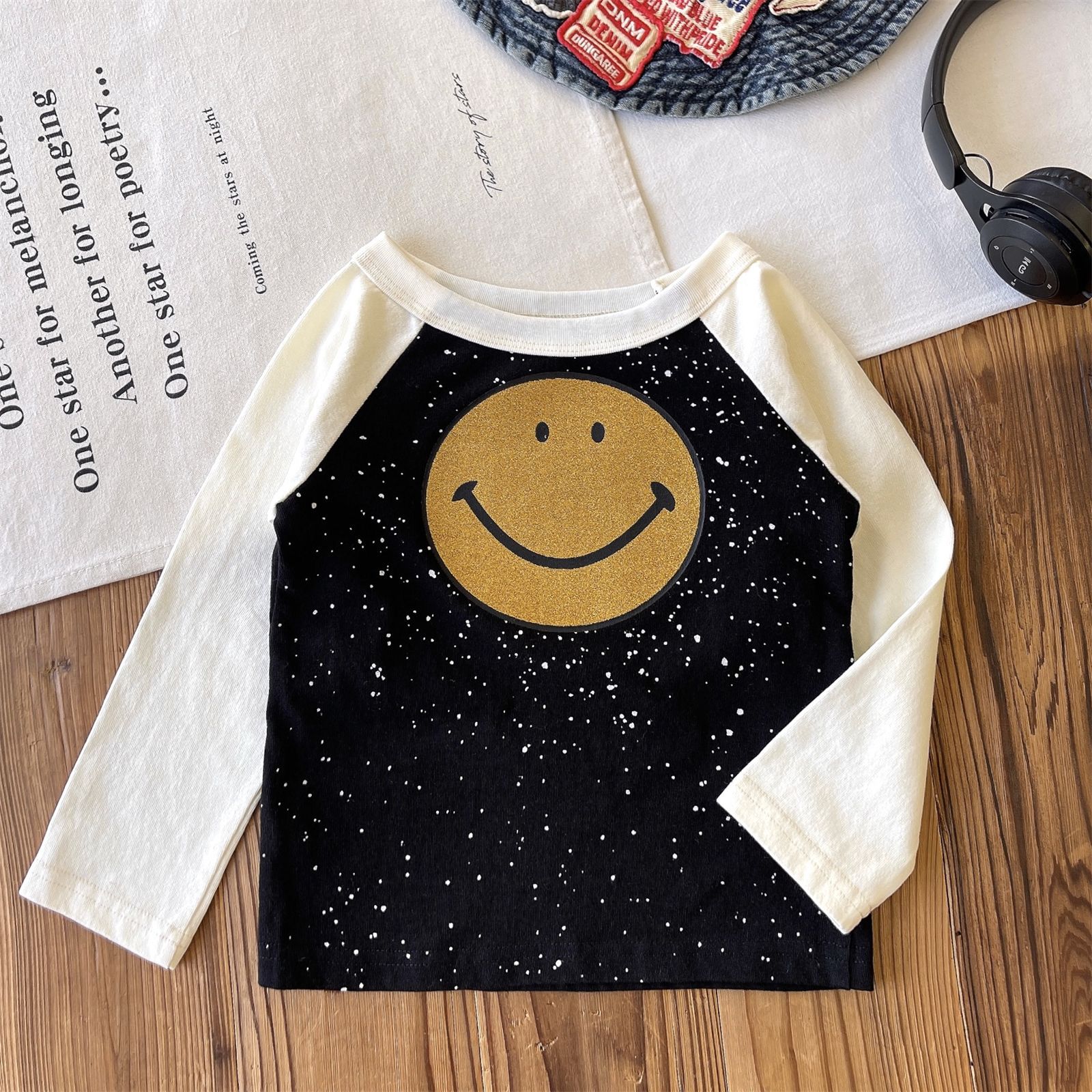 [재고] 일본 중세 유행 어린이 블랙 슈퍼 어린이 웃는 얼굴 라글란 소매 긴 소매 티셔츠 탑