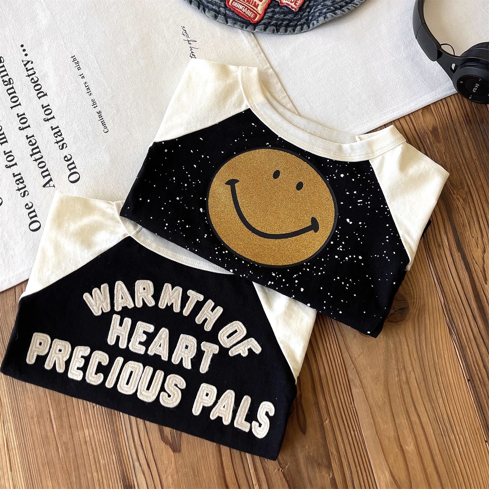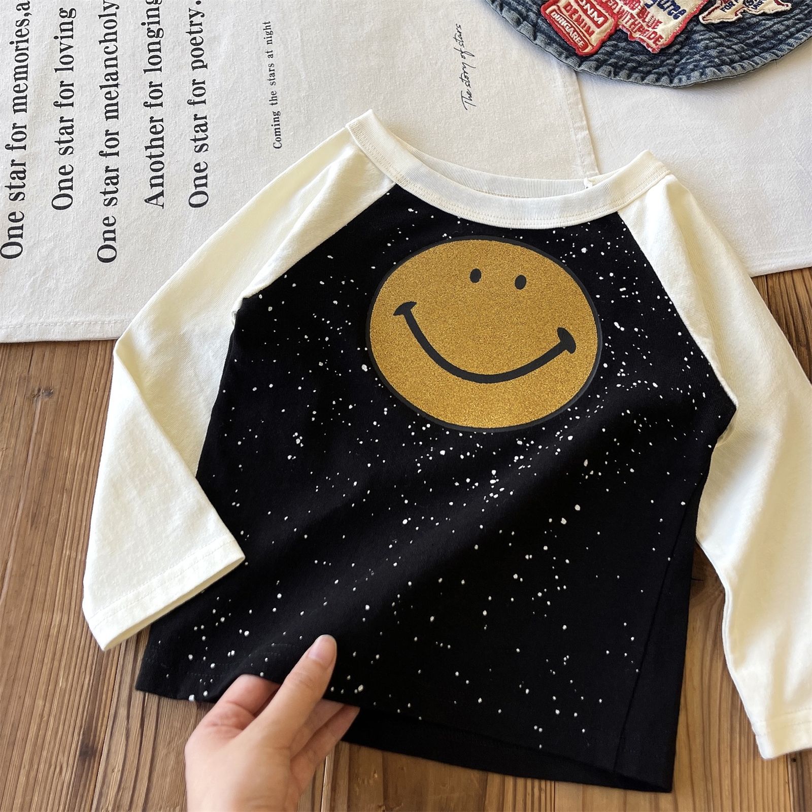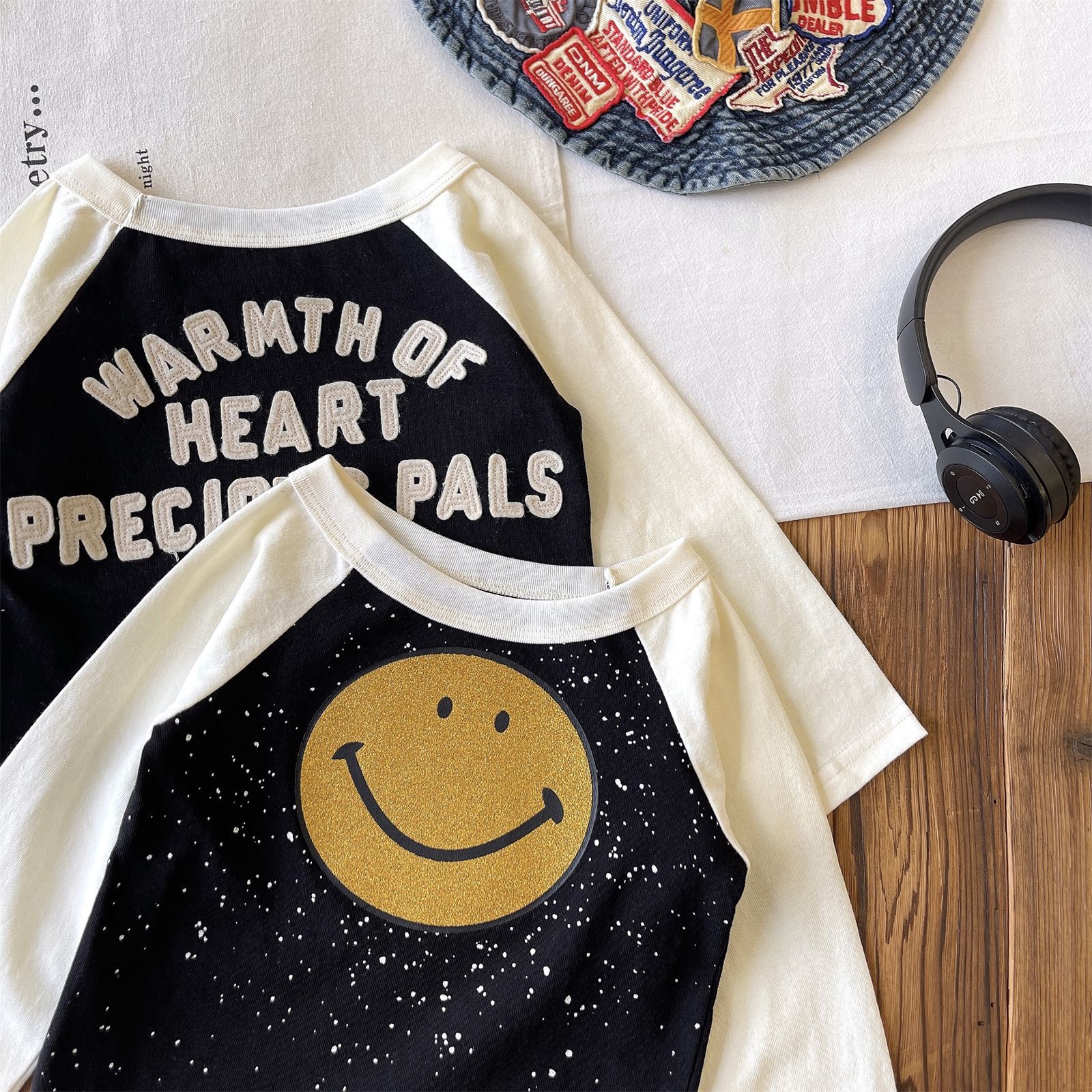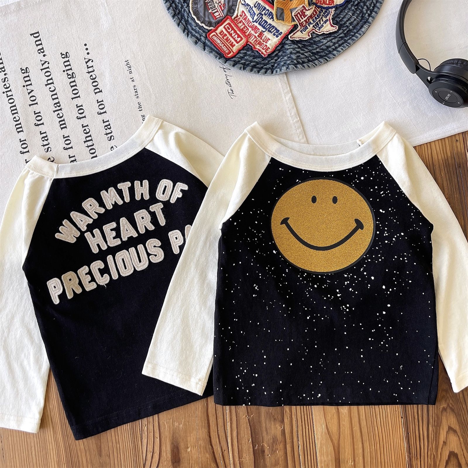 [재고] 일본 중세 유행 어린이 블랙 슈퍼 어린이 웃는 얼굴 라글란 소매 긴 소매 티셔츠 탑