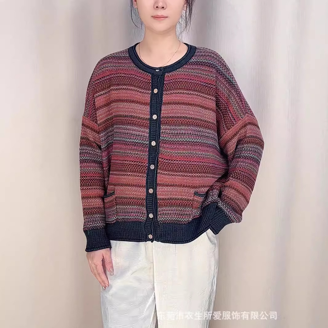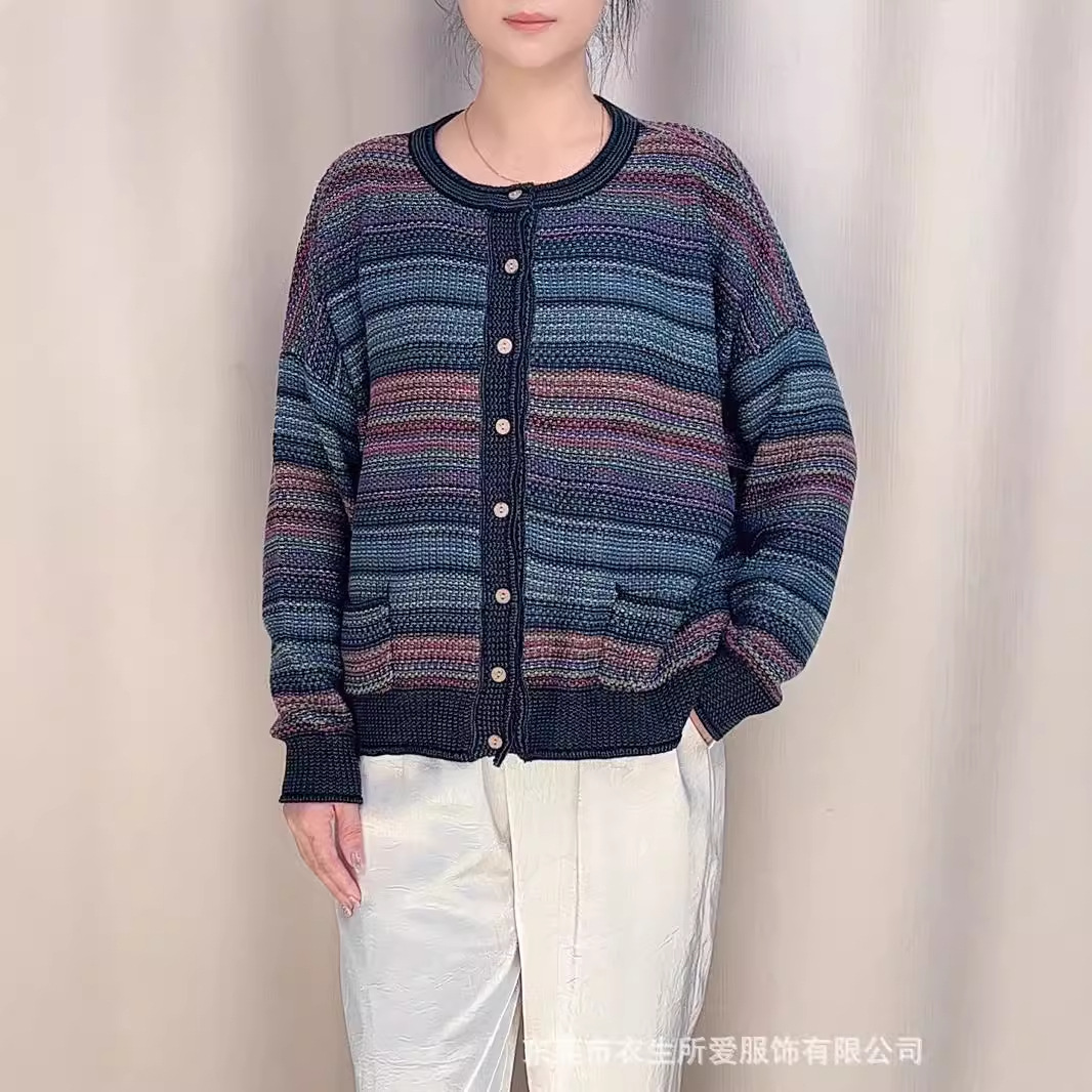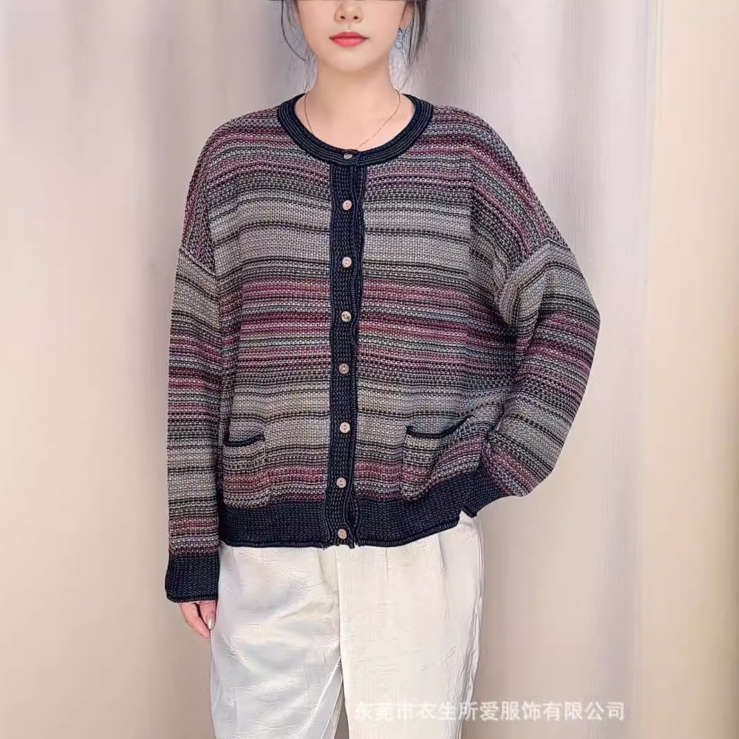 2024 새로운 가을, 겨울 예술적 라인 스트라이프 대비 색상 싱글 브레스트 니트 카디건 여성 긴팔 자켓 슬리밍 탑스토어 가기