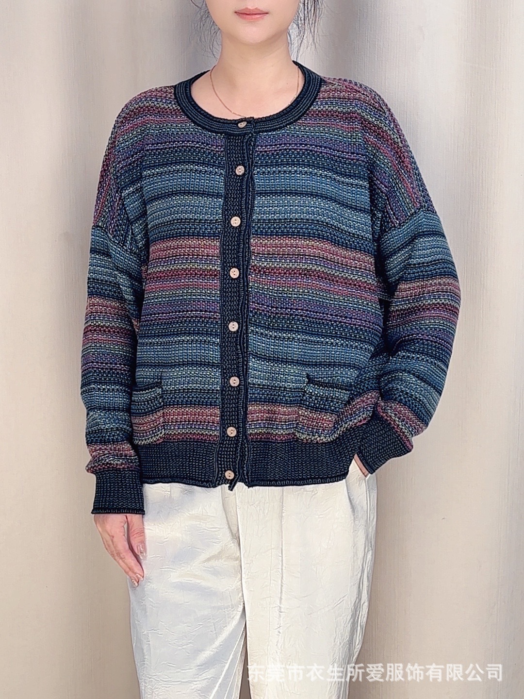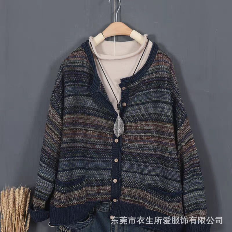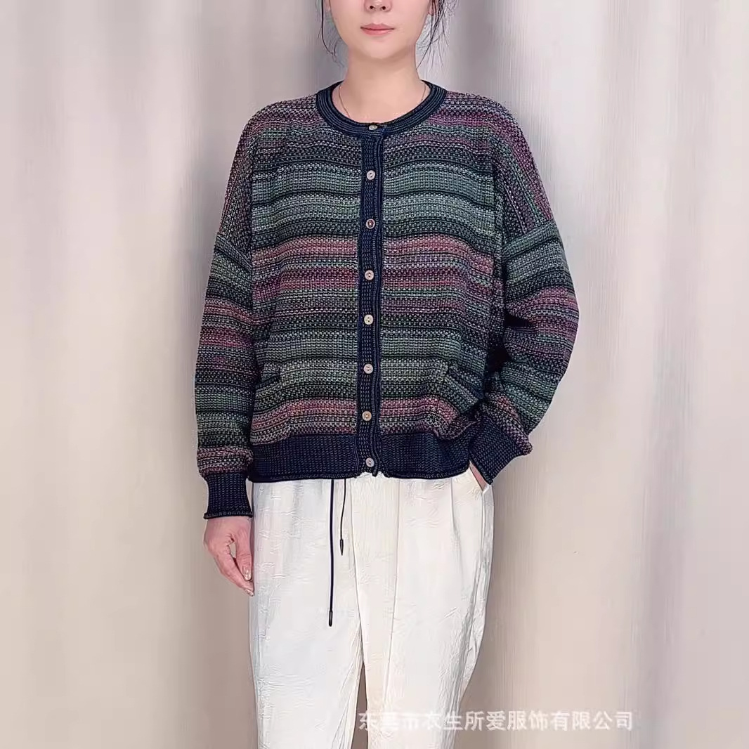 2024 새로운 가을, 겨울 예술적 라인 스트라이프 대비 색상 싱글 브레스트 니트 카디건 여성 긴팔 자켓 슬리밍 탑스토어 가기