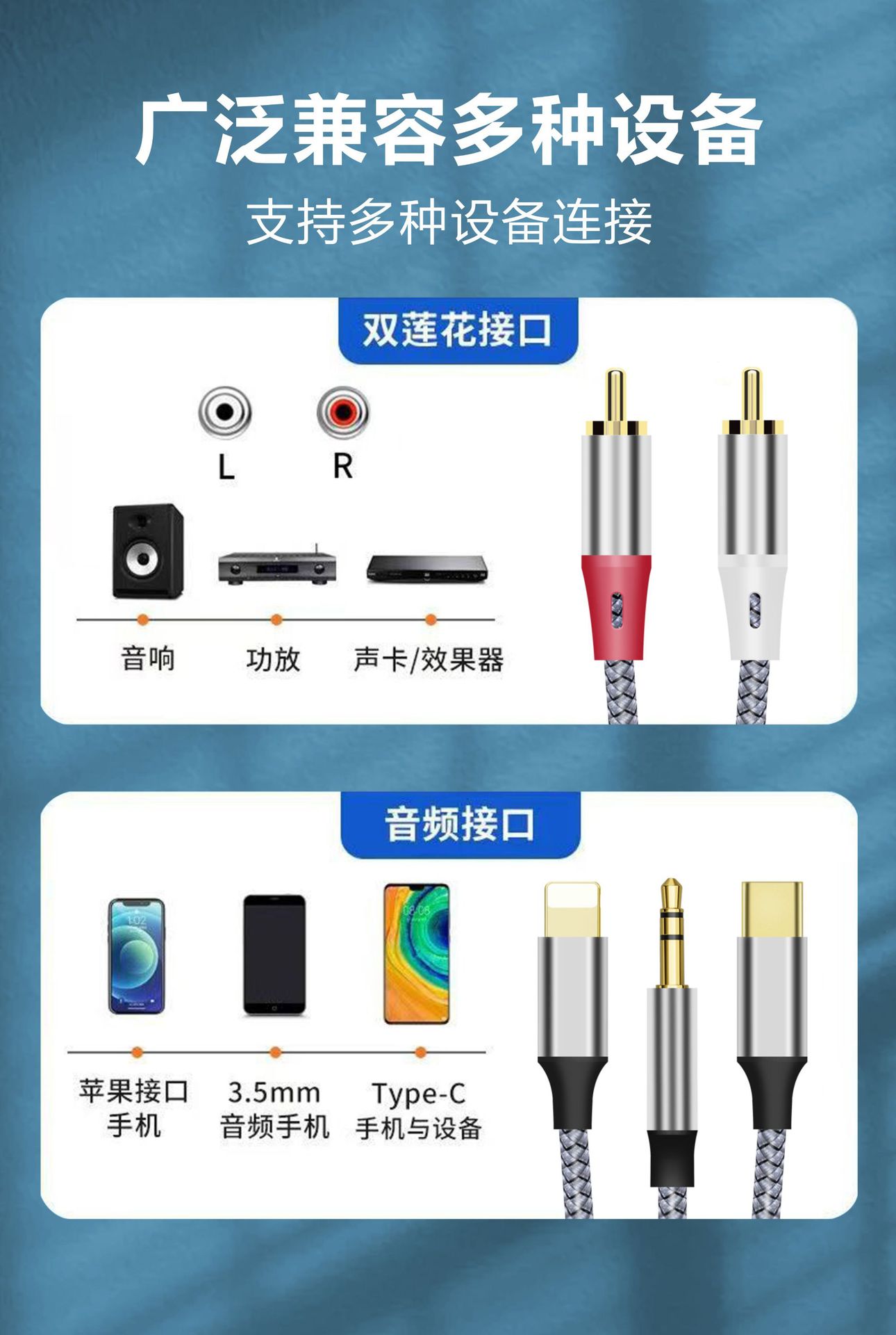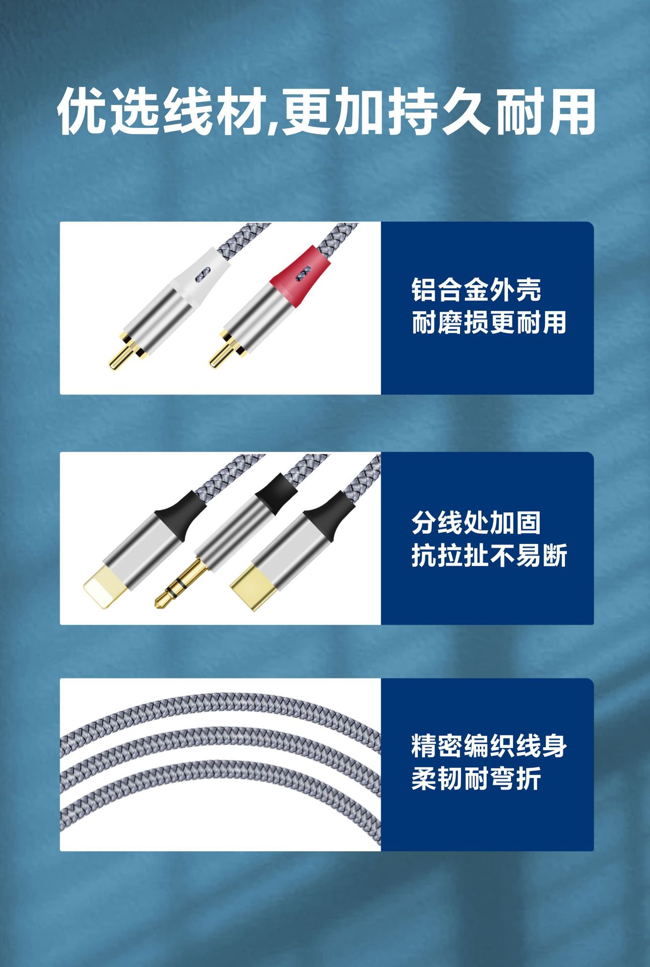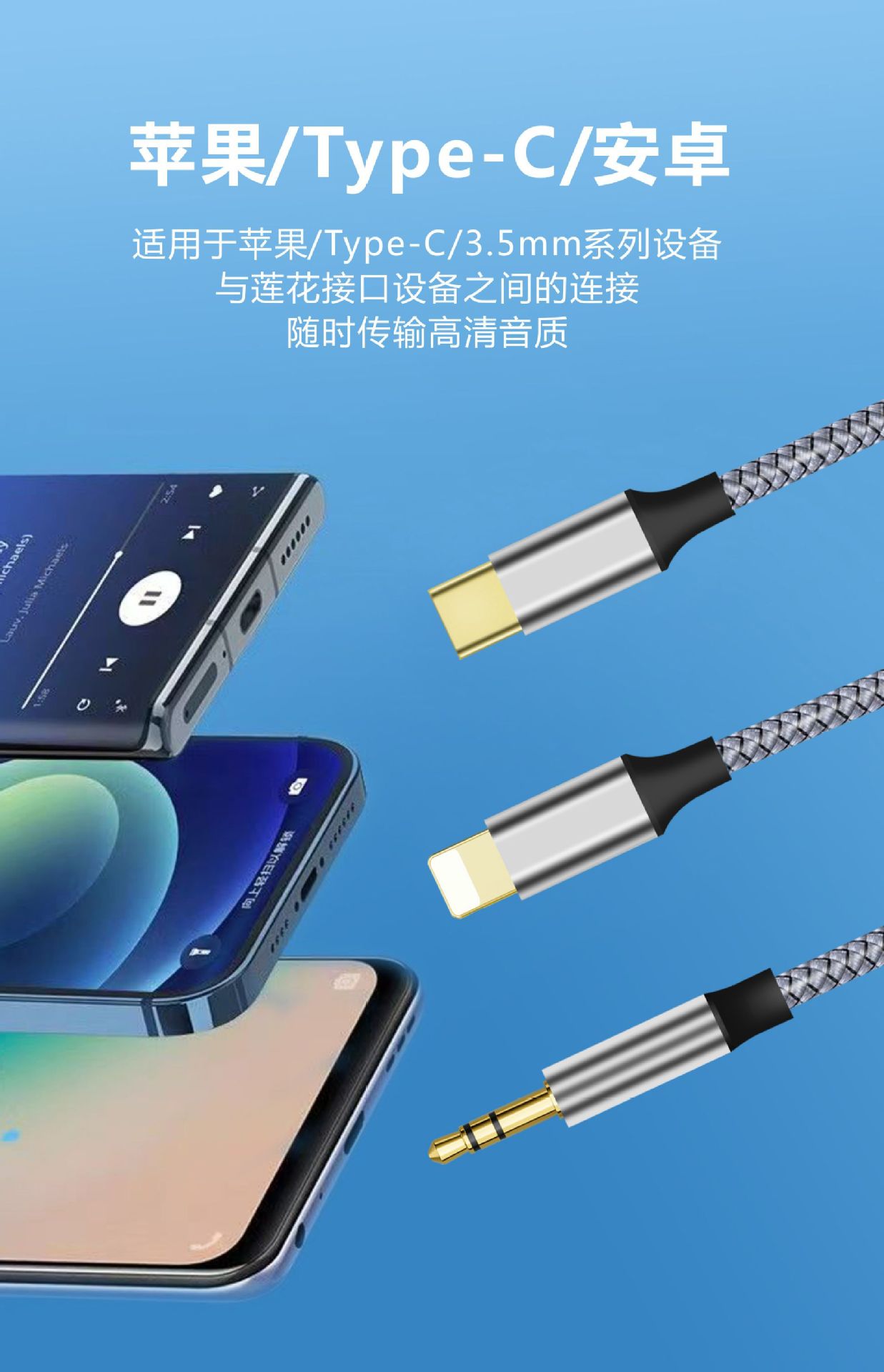 크로스보더 3-in-1 2RCA 오디오 케이블, 타입-C 애플 3.5MM 오디오 케이블, 스피커 및 앰프용