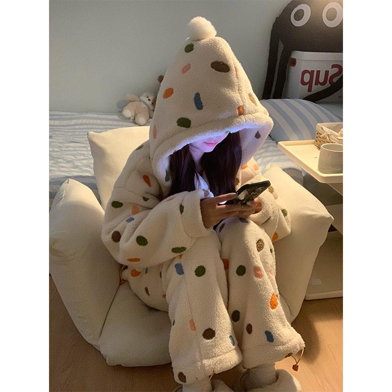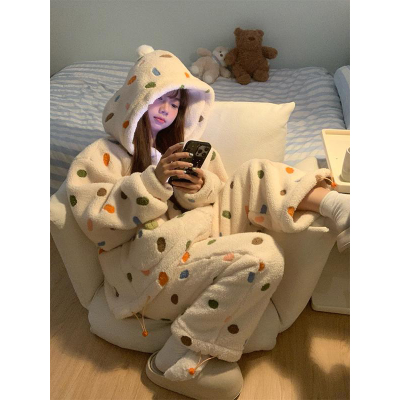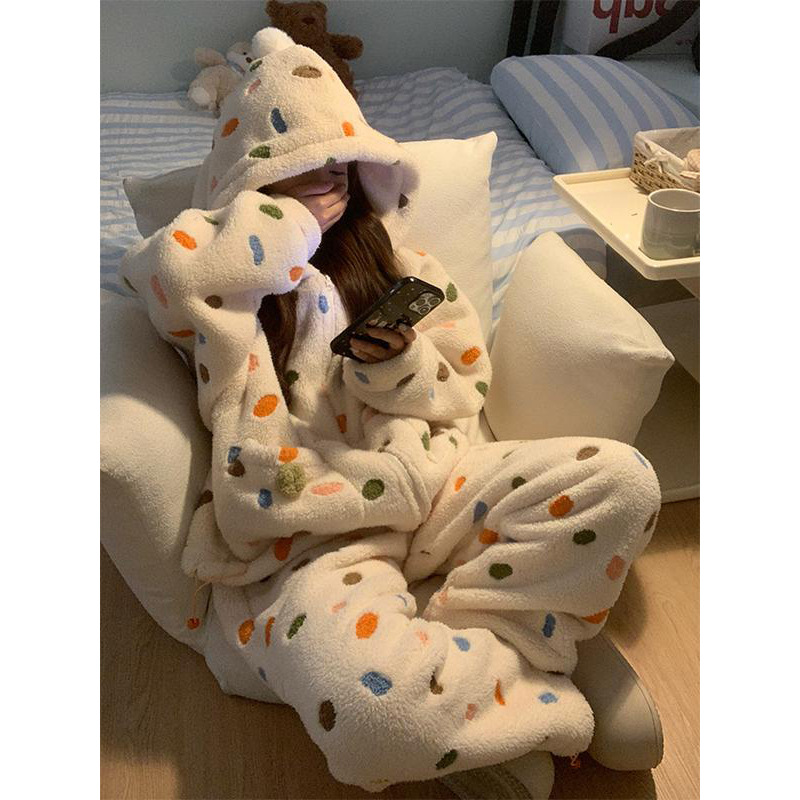 여성을위한 소녀의 달콤한 다채로운 폴카 도트 산호 벨벳 잠옷 겨울 새로운 두꺼운 플러스 벨벳 따뜻한 홈 대형 정장스토어 가기