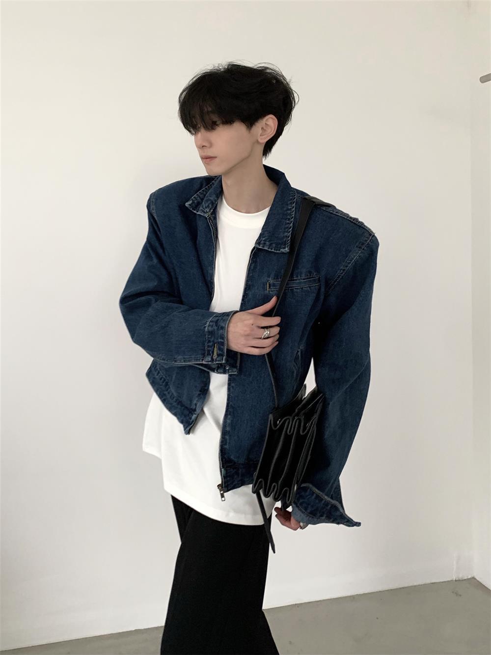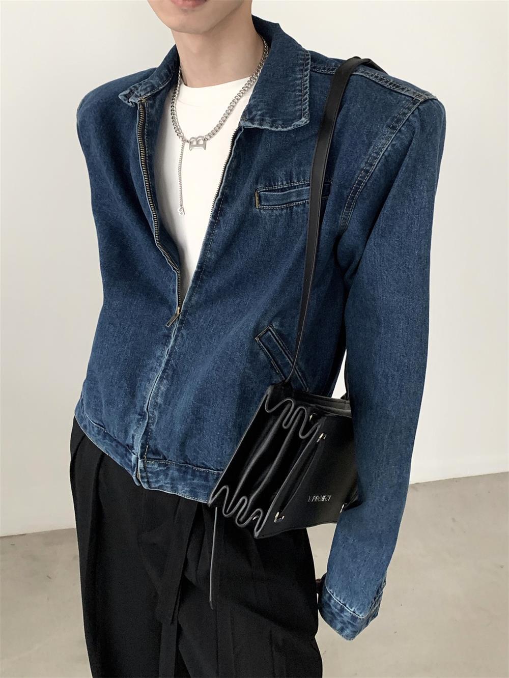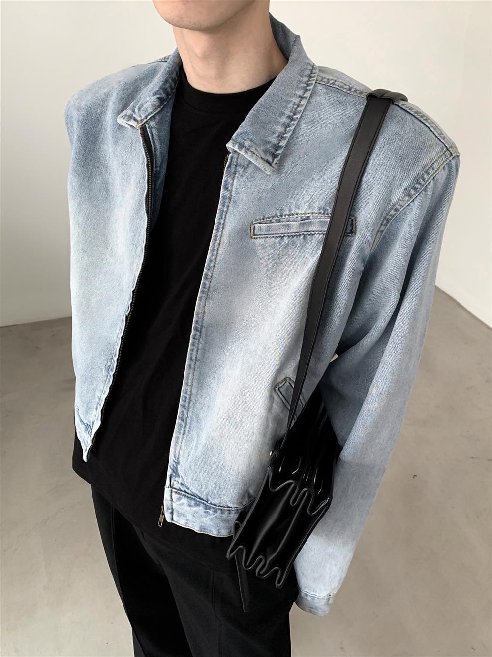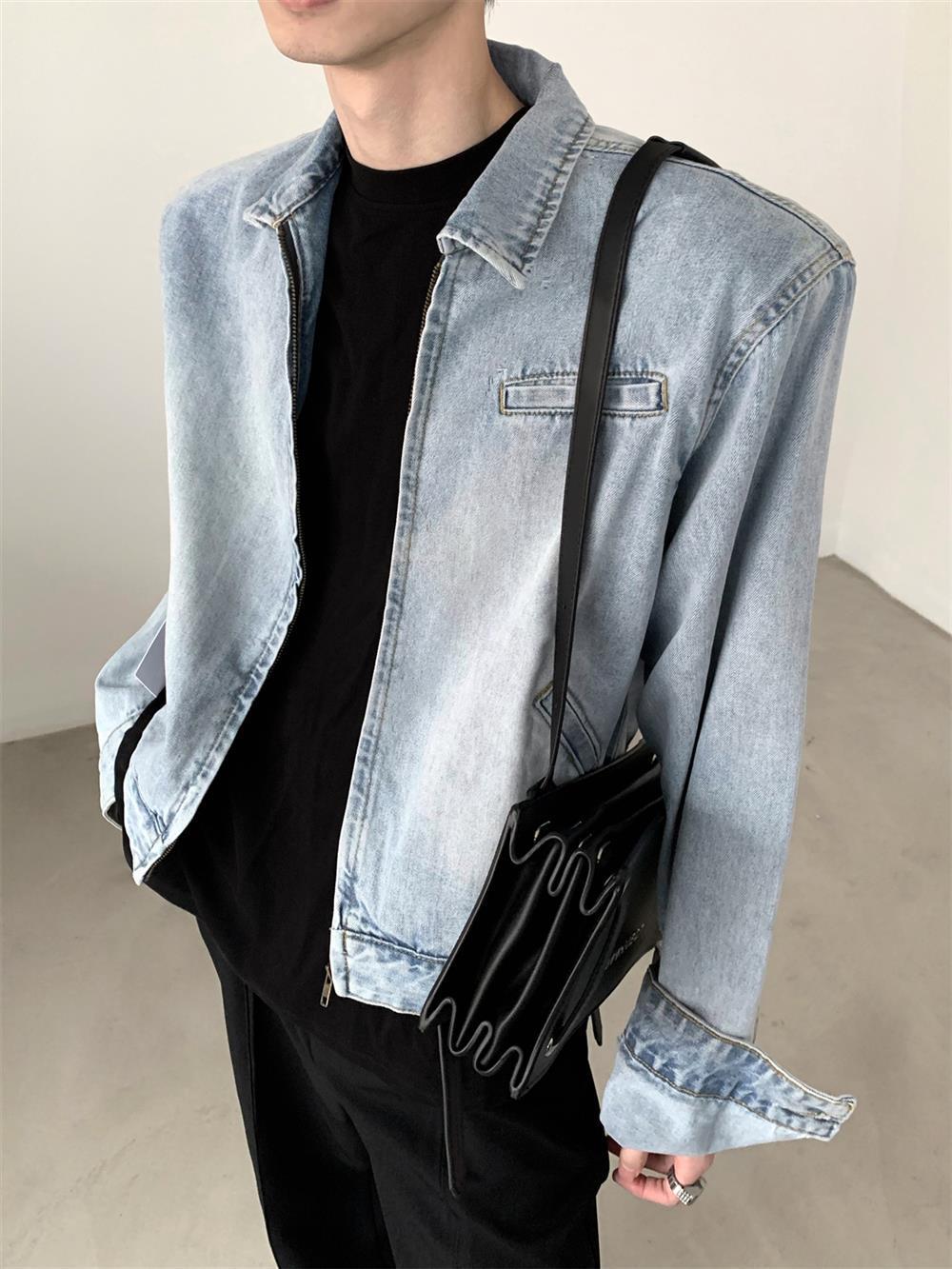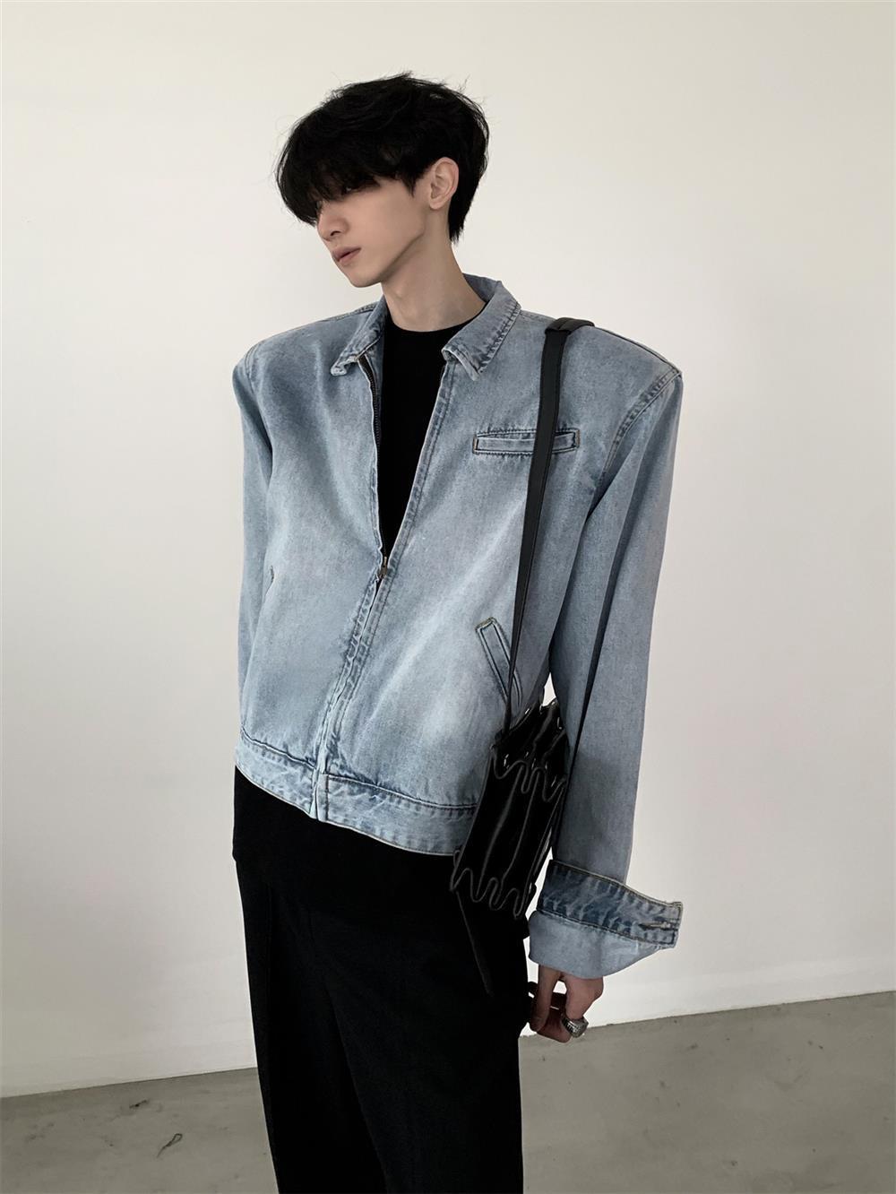 2024 새로운 미니멀리스트 프로필 틈새 하이 엔드 쇼트 데님 재킷 남자 복고풍 세탁 디자인 숄더 패드 재킷