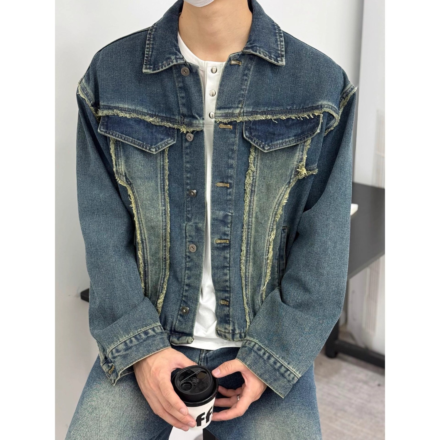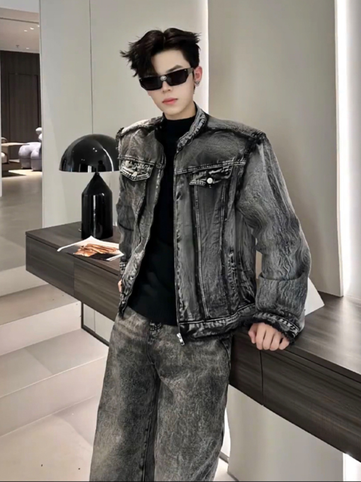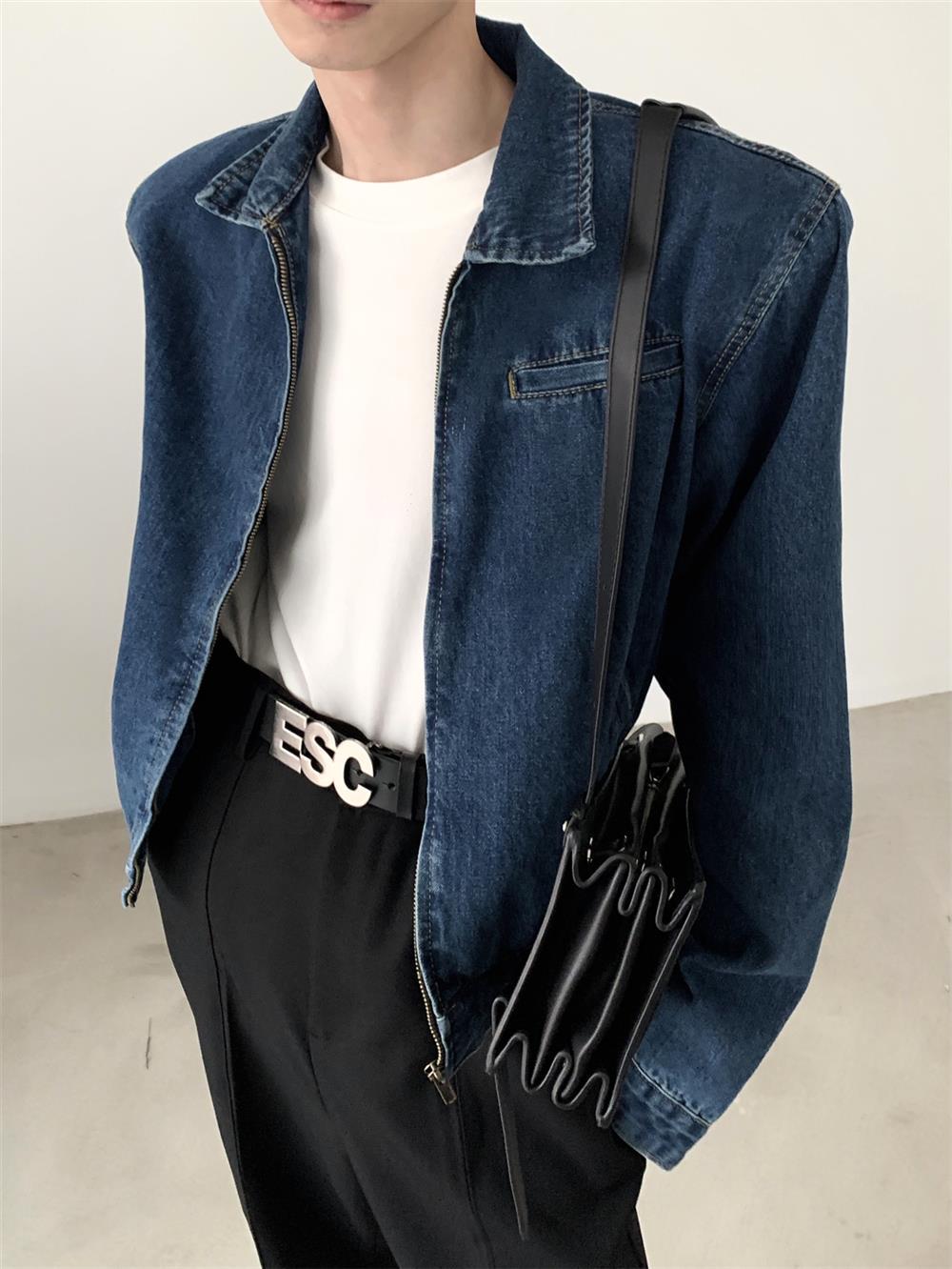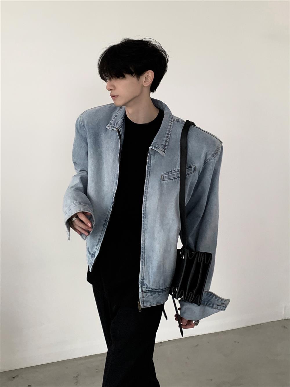 2024 새로운 미니멀리스트 프로필 틈새 하이 엔드 쇼트 데님 재킷 남자 복고풍 세탁 디자인 숄더 패드 재킷