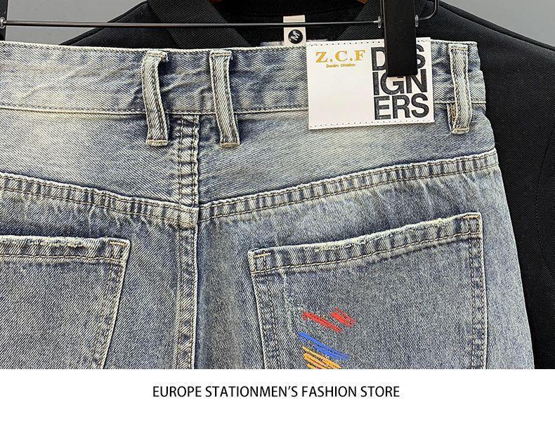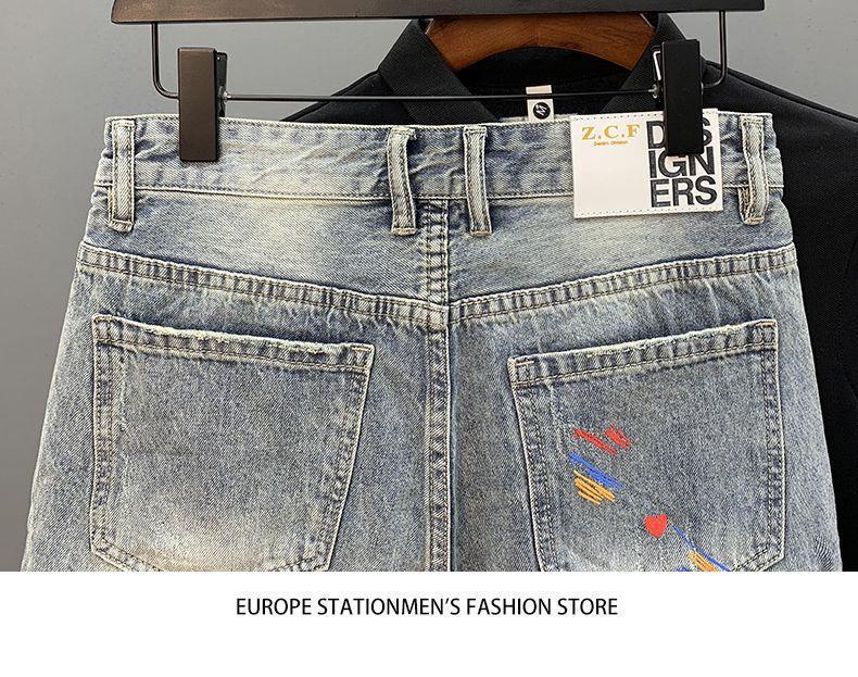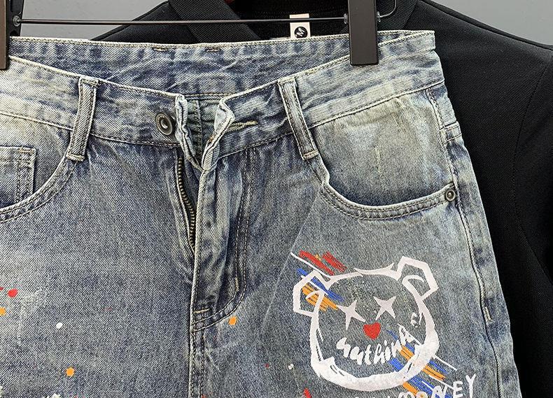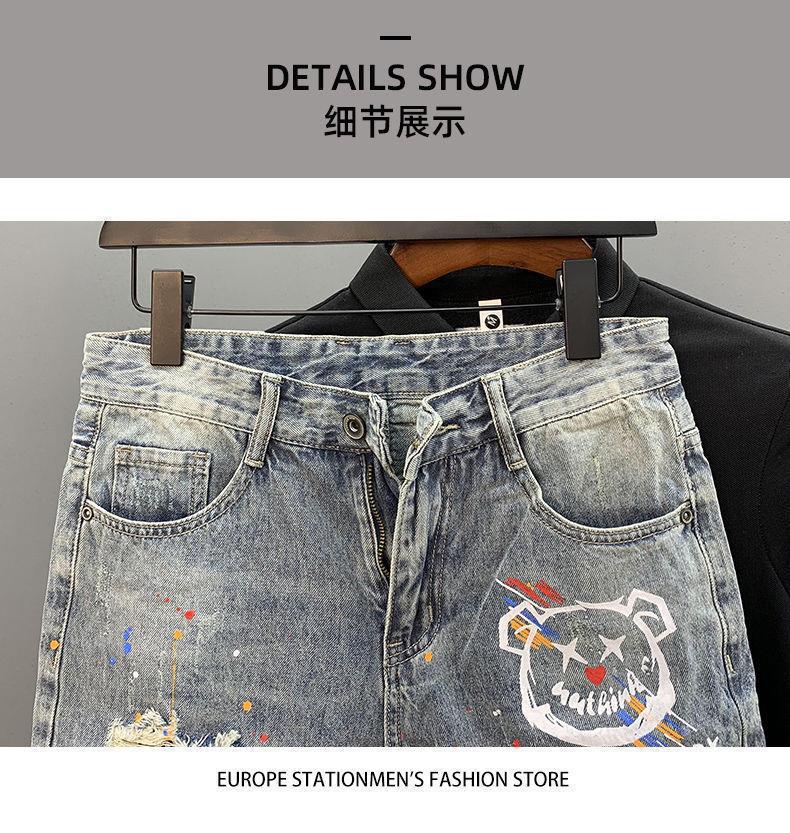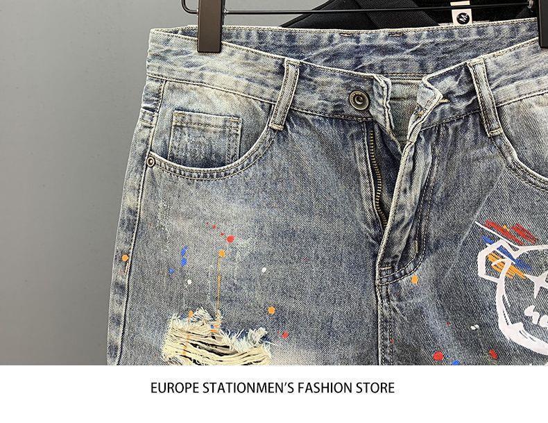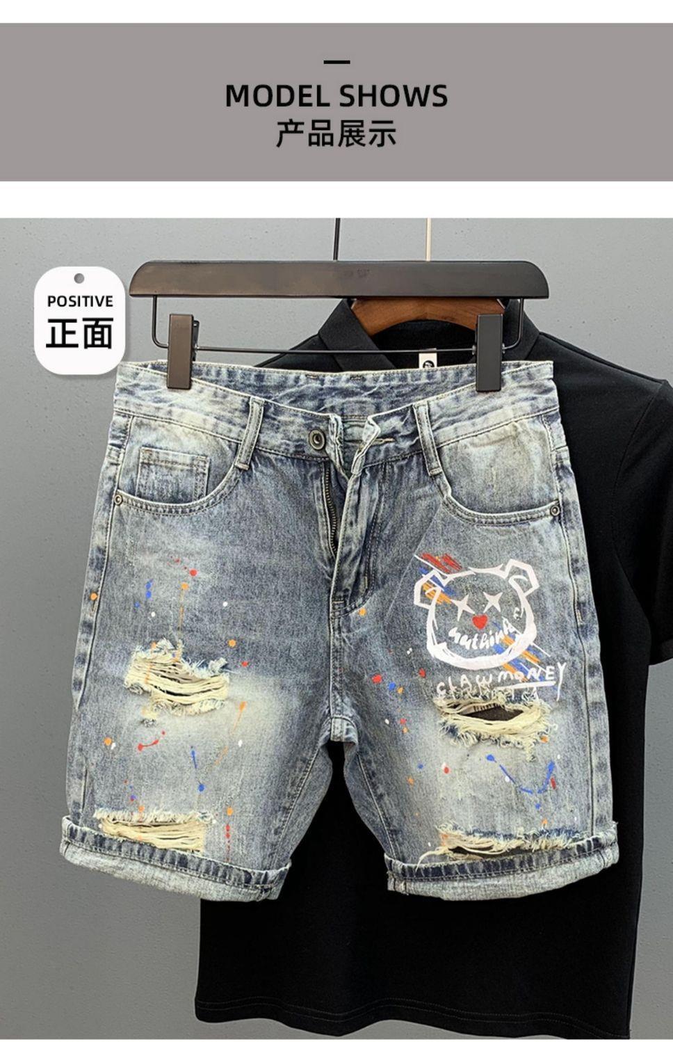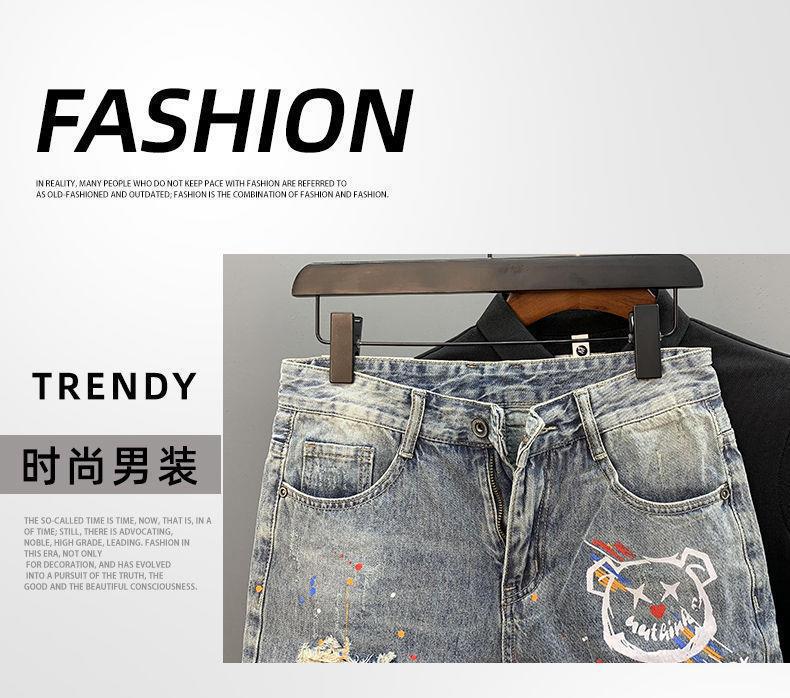 구멍 데님 고양이 반바지 남성 맞춤형 인쇄 스플래시 잉크 2023 여름 새로운 한국 스타일 슬림-적합 유행 브랜드 쿼드 바지스토어 가기