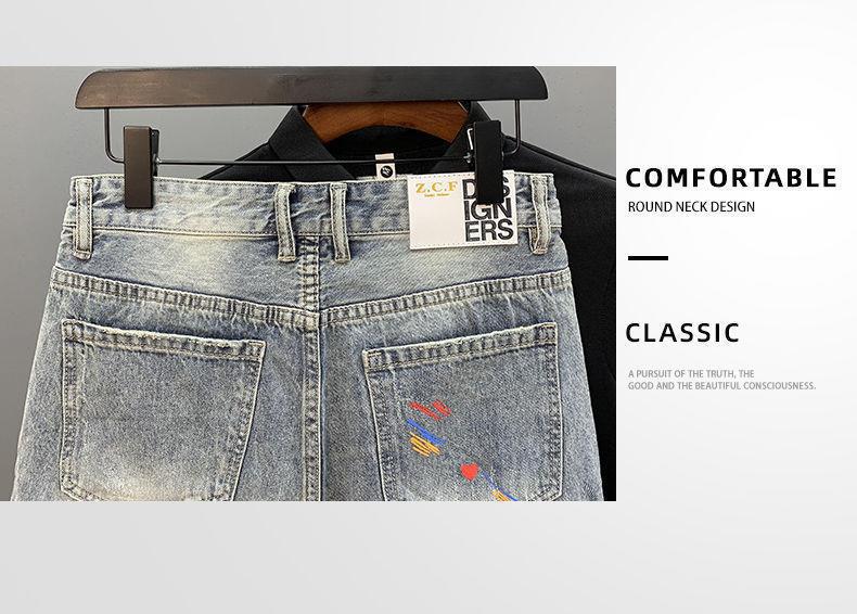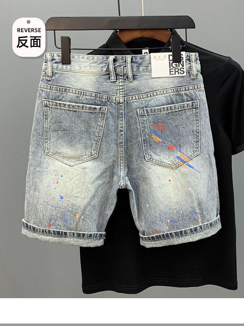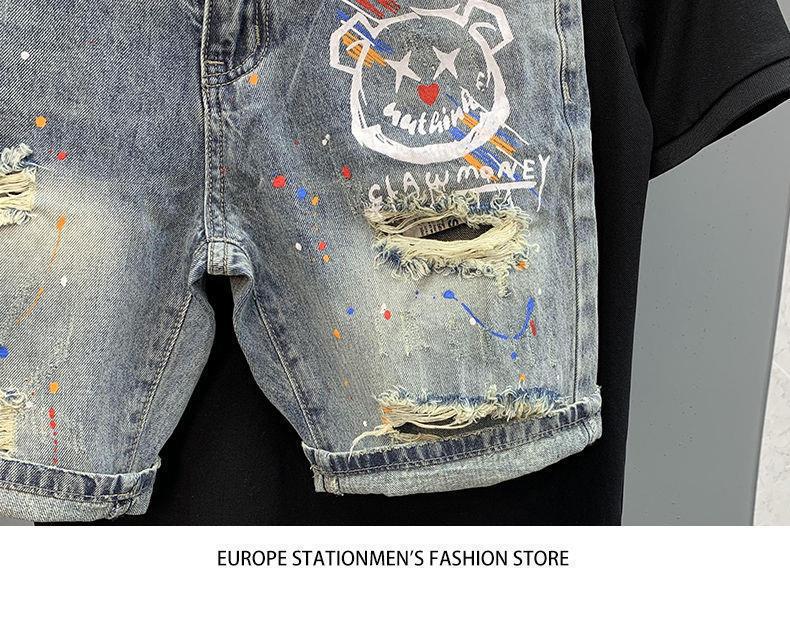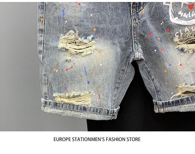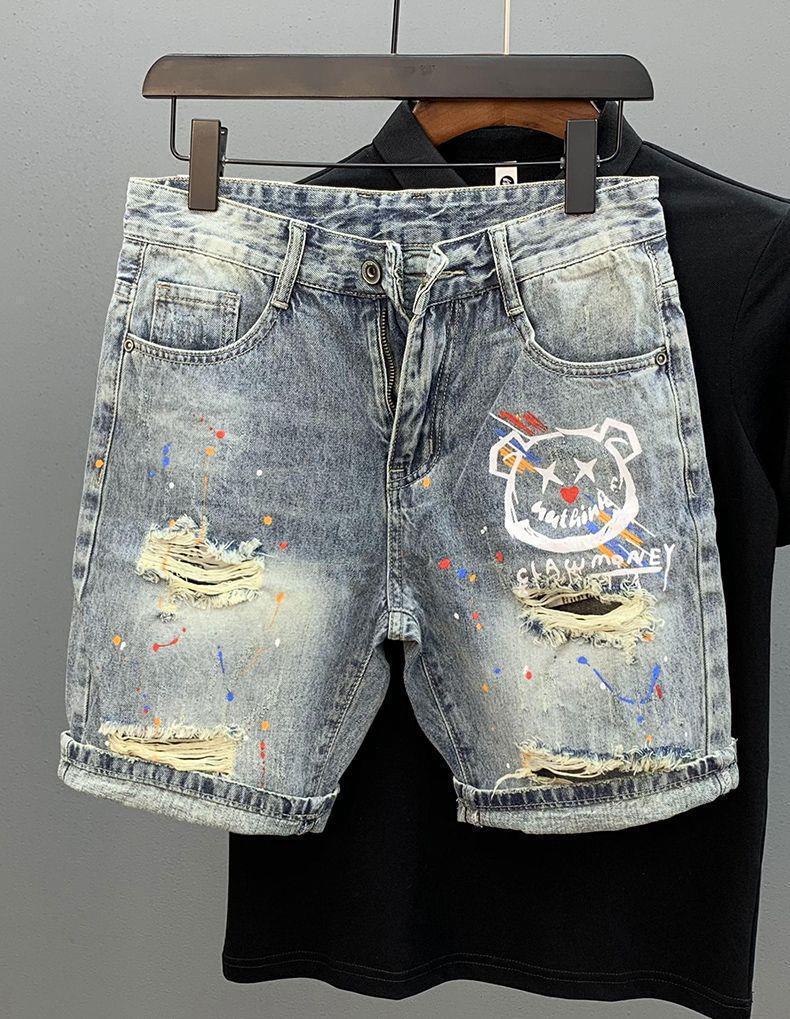 구멍 데님 고양이 반바지 남성 맞춤형 인쇄 스플래시 잉크 2023 여름 새로운 한국 스타일 슬림-적합 유행 브랜드 쿼드 바지