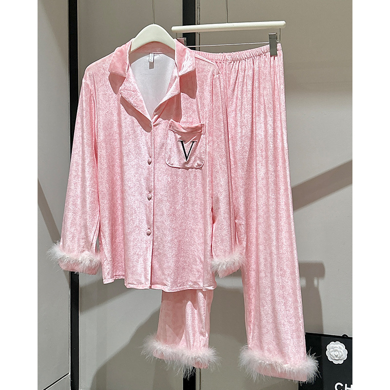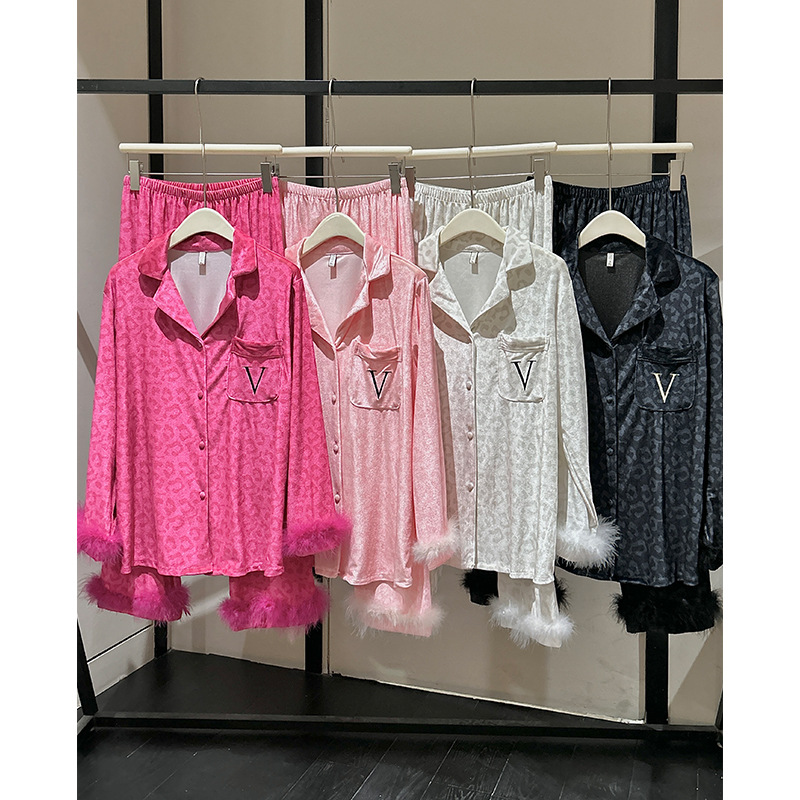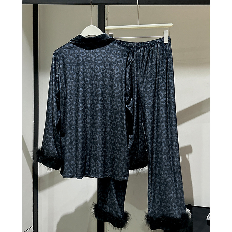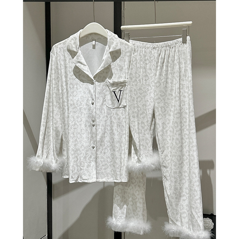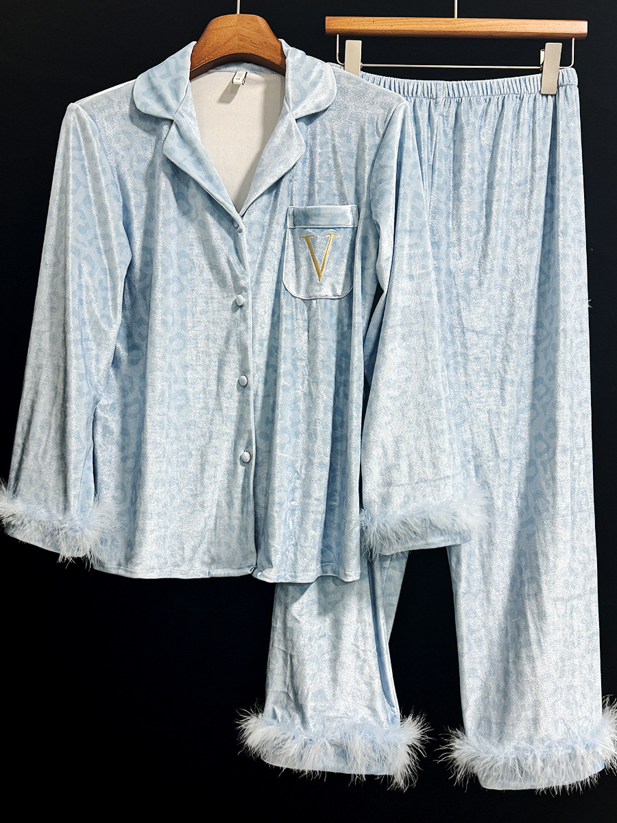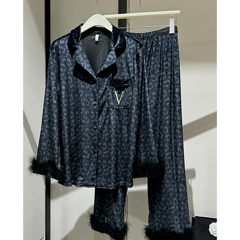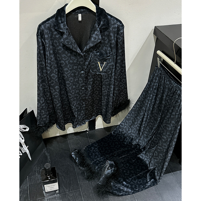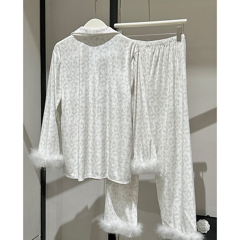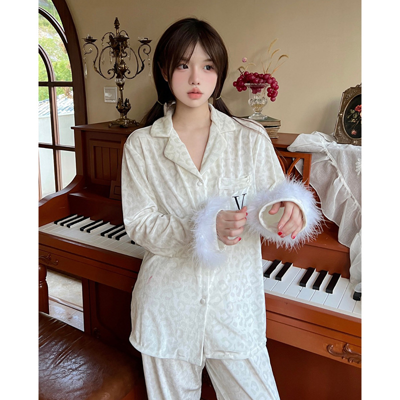 레오파드 깃털 가벼운 고급 고급 고급 파자마 여성 가을과 겨울 골드 벨벳 긴 소매 편안한 홈 의류 세트