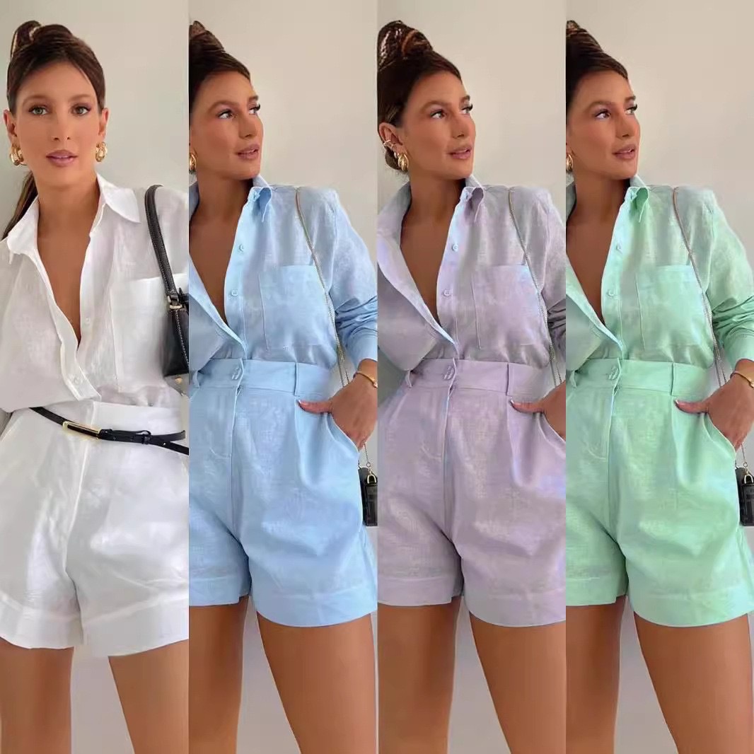 2024 년 가을 유럽과 미국 아마존 여성의 새로운 느슨한 단색 캐주얼 셔츠 높은 허리 반바지 패션 세트 여성