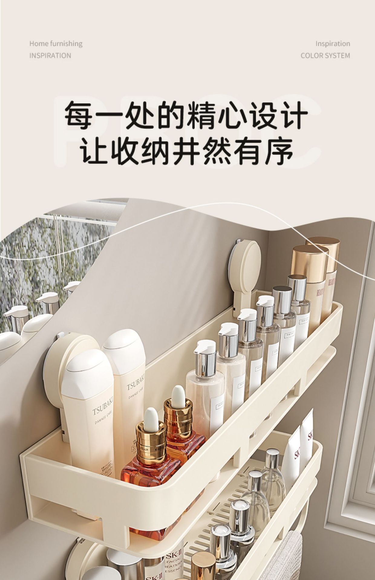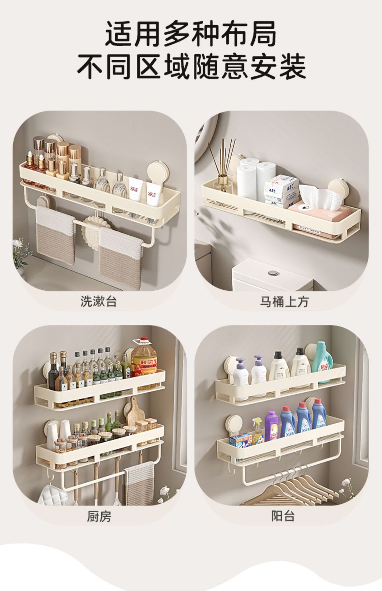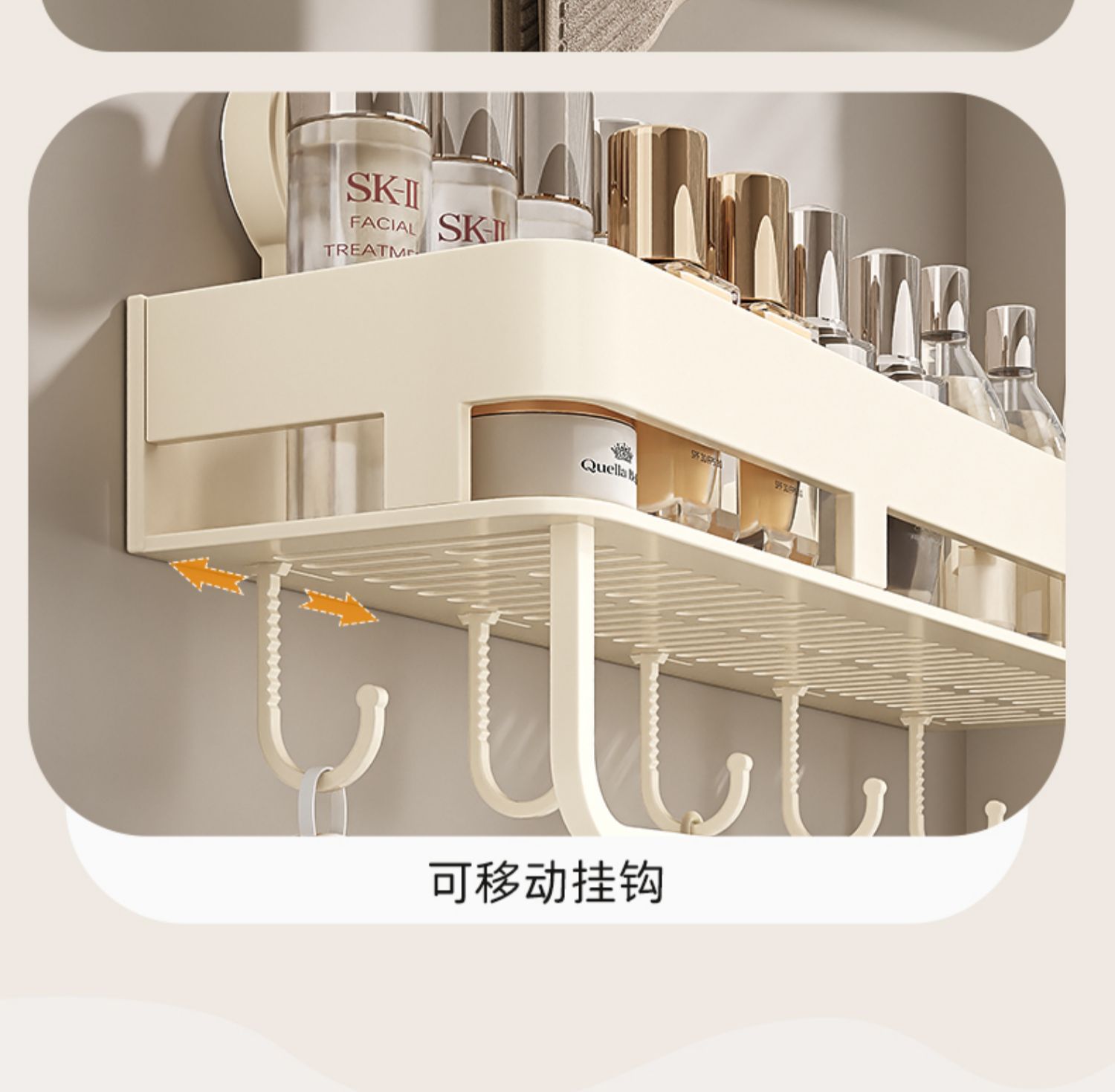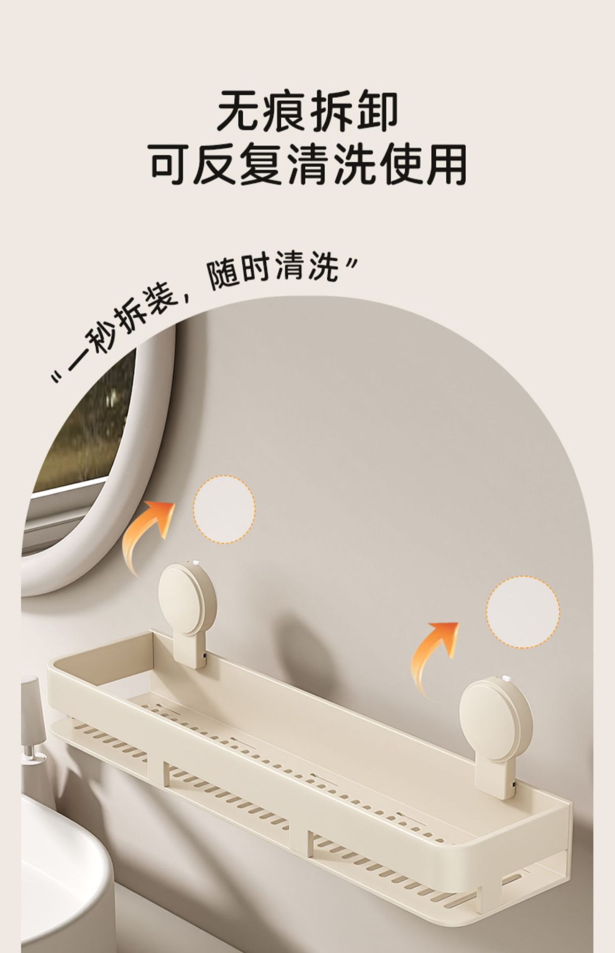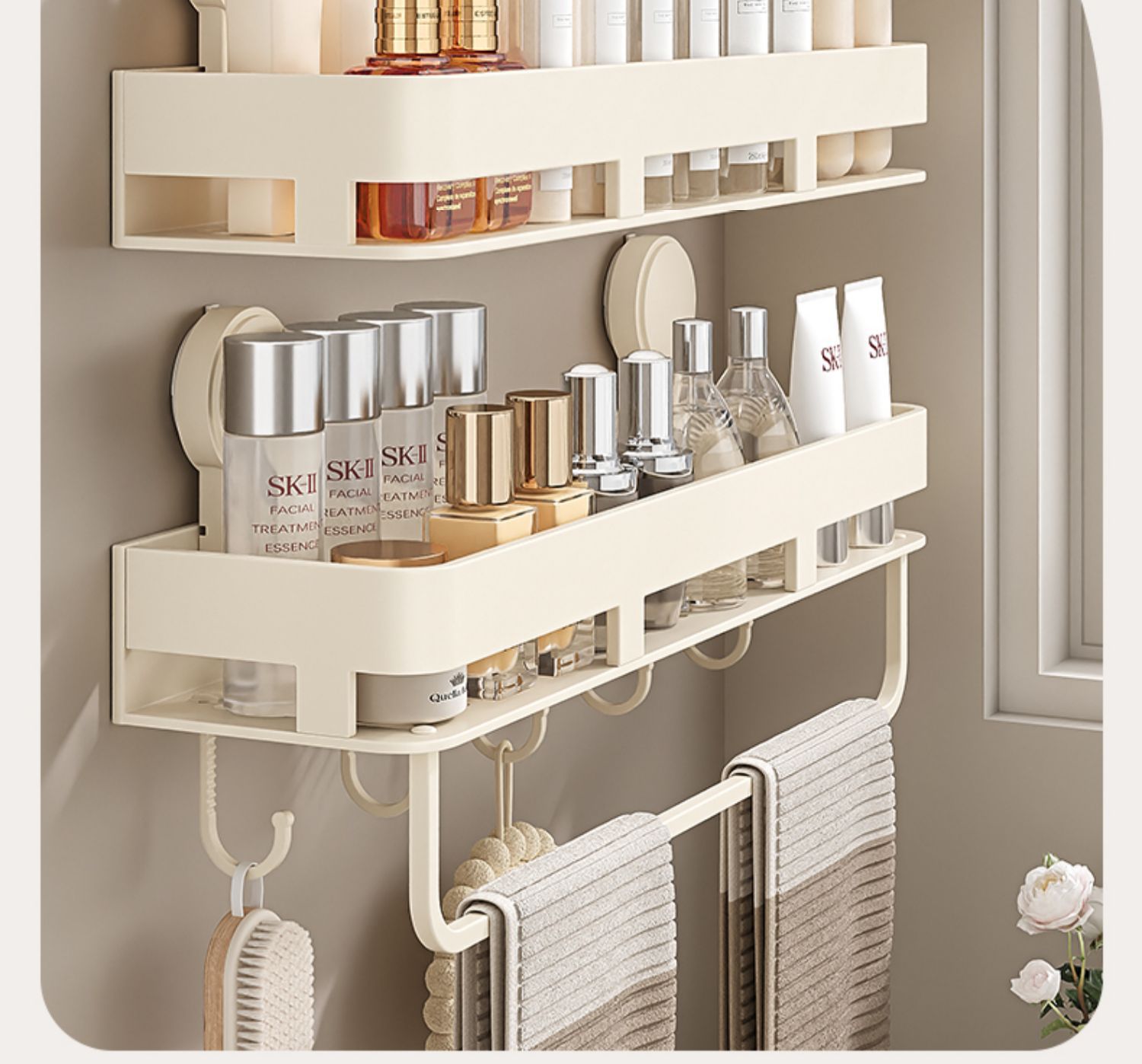 • [밀크화이트] 후크와 막대가 달린 수납선반 50CM (흡착컵)