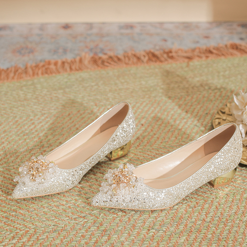 2024 포인팅 샴페인 골드 플랫 임산부 여성 로우 힐 크리스탈 프린세스 하이 엔드 웨딩 슈즈 피곤하지 않은 발 신부 들러리 신발스토어 가기
