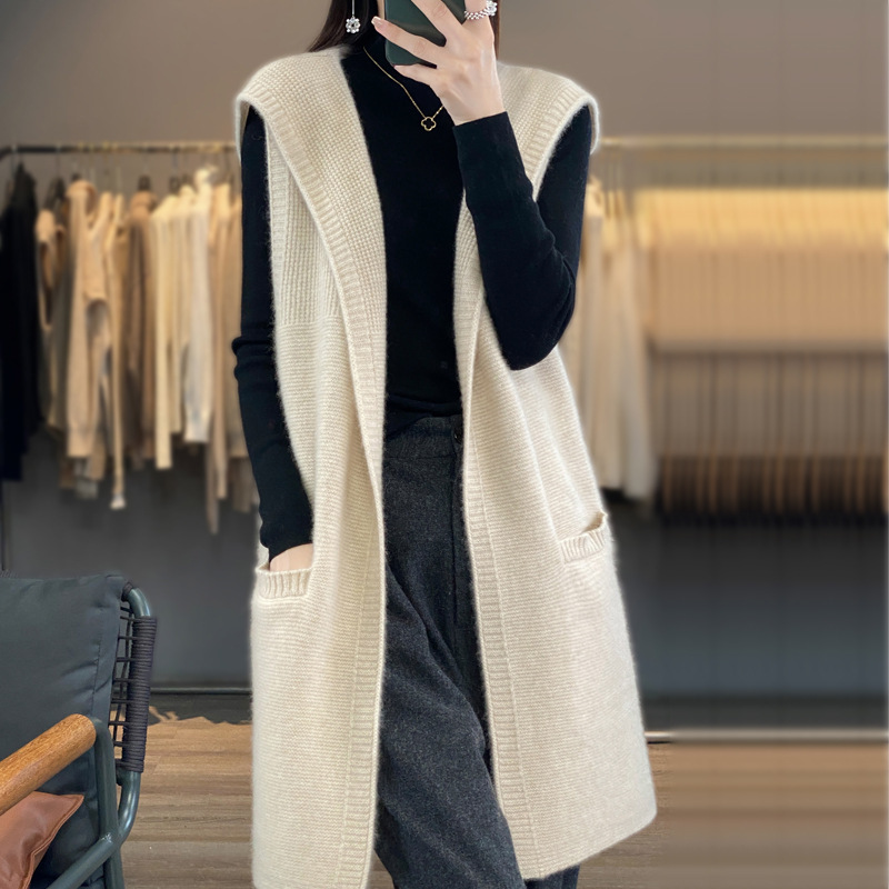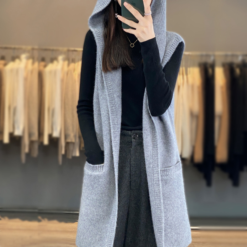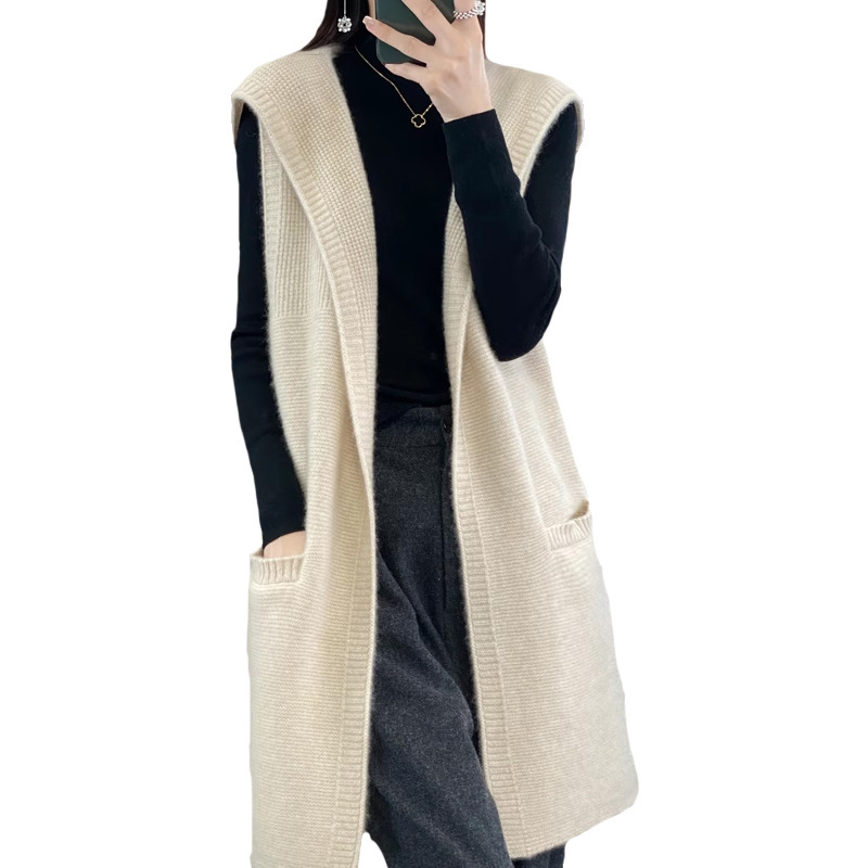 2026 봄 가을 신상 스타일리시한 솔리드 컬러 민소매 스웨터 유럽 스타일 중간 길이 후드 가디건 조끼 여성용스토어 가기