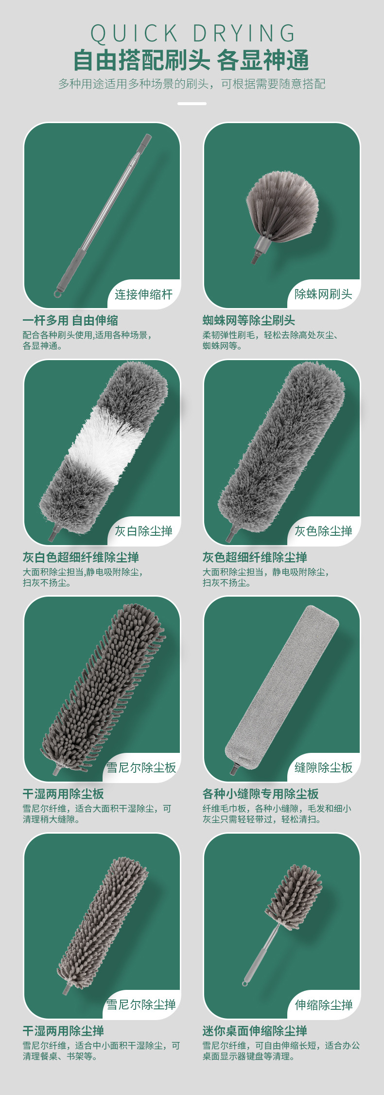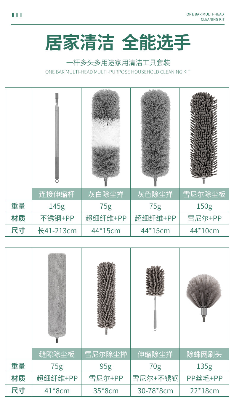 • 2.1m 두꺼운 막대 + 회색 먼지 살포기 + 틈새 브러시 헤드 + 둥근 셔닐 + OPP 가방