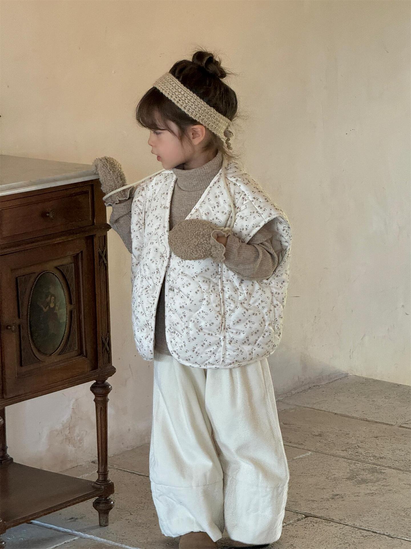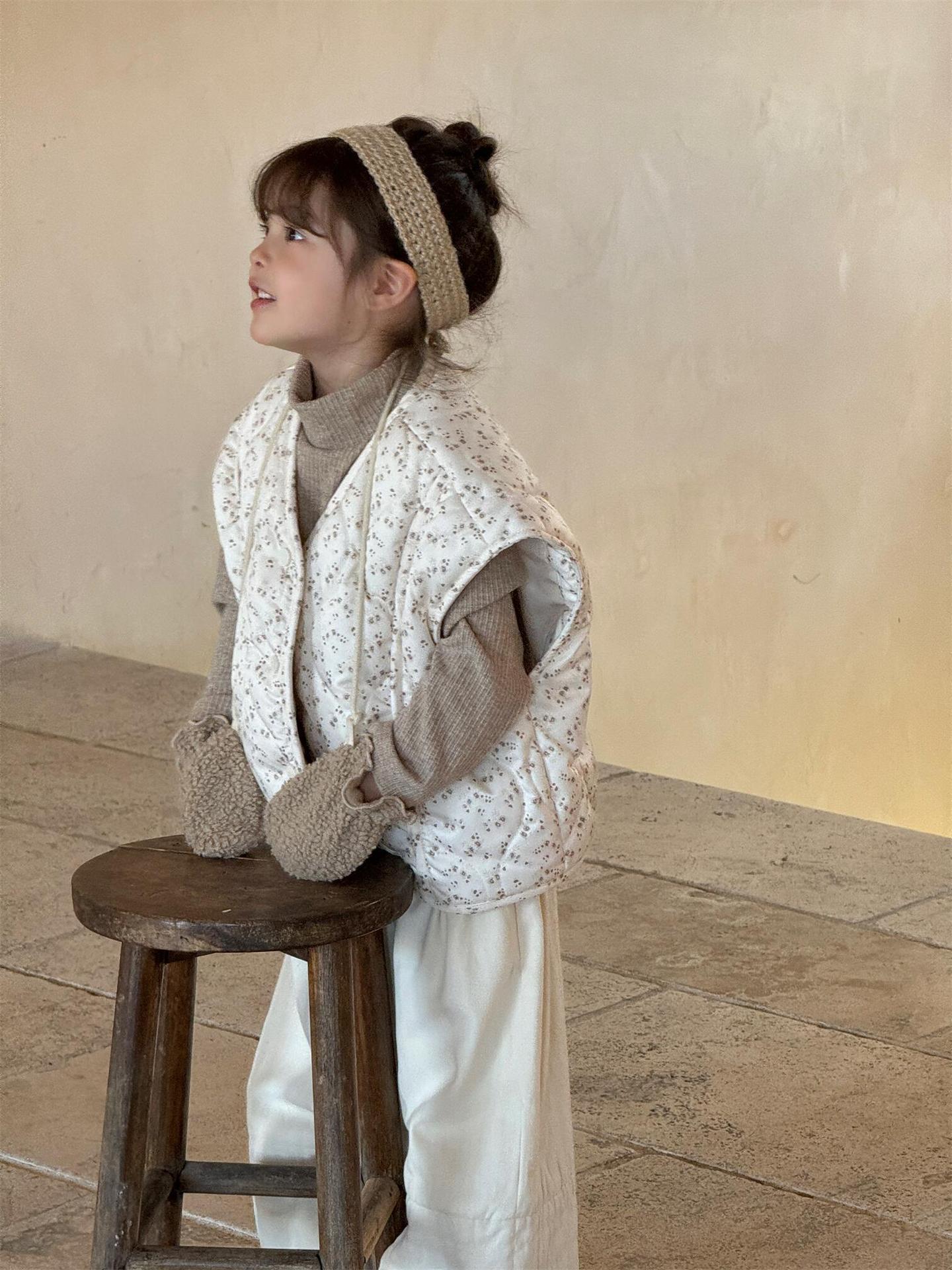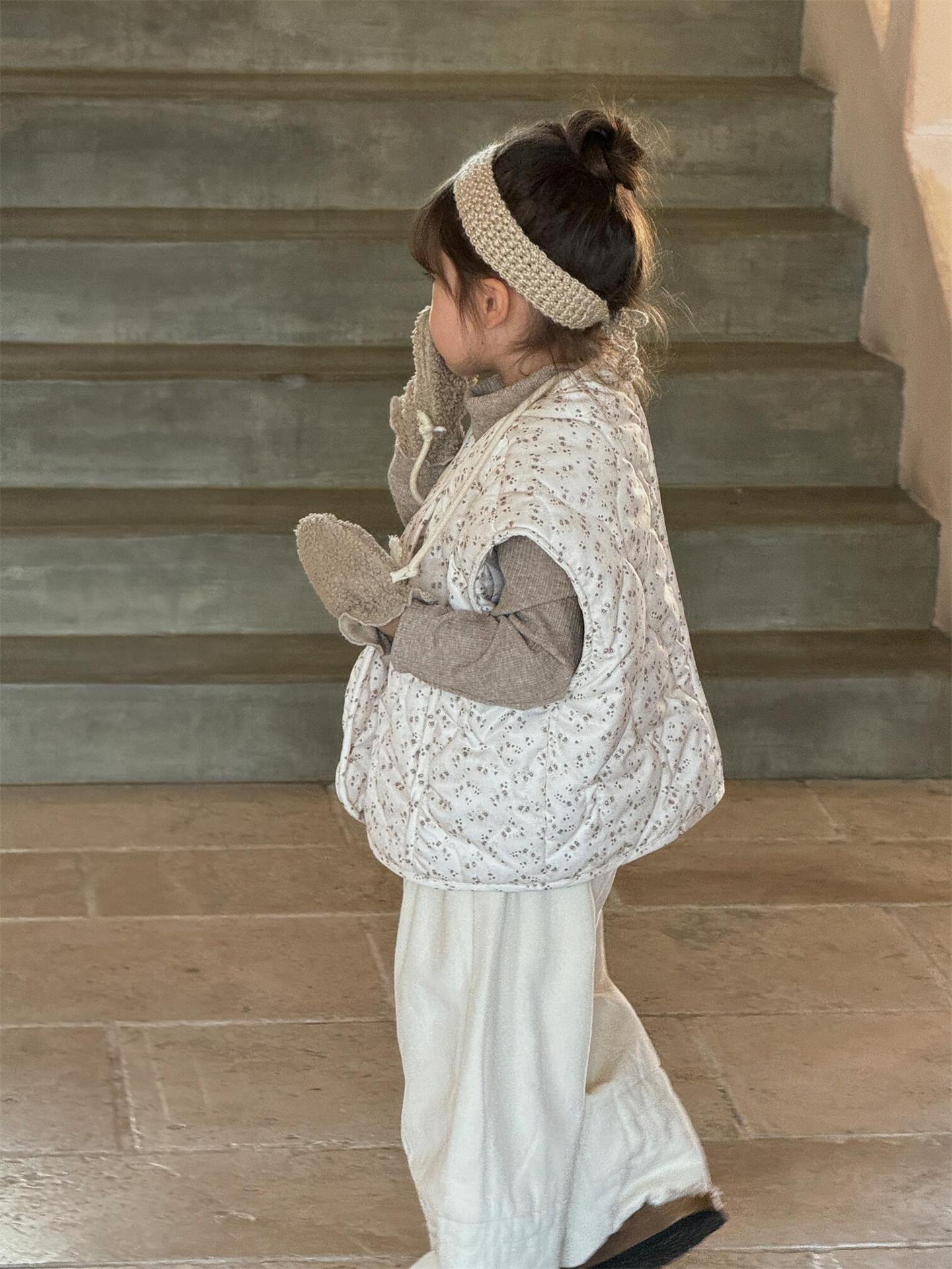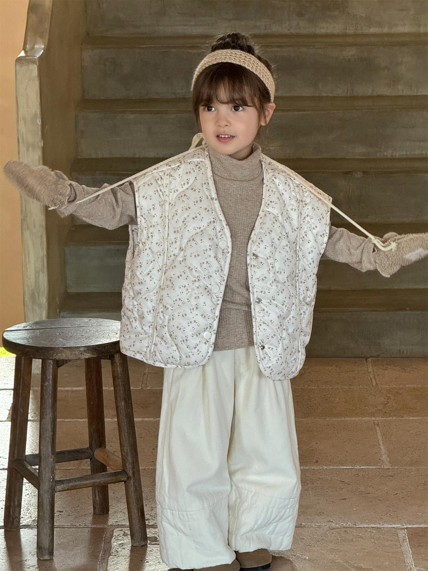 탑 에그 한국 아동복 2024 겨울 새 소녀상 조끼 꽃면 민소매 싱글 가슴 게으른 자켓
