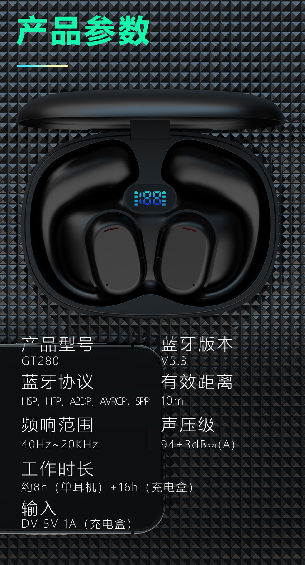 GT280 무선 귀 매달린 헤드셋 블루투스 뼈 전도 귀 스포츠 높은 음질 블루투스 헤드셋 도매