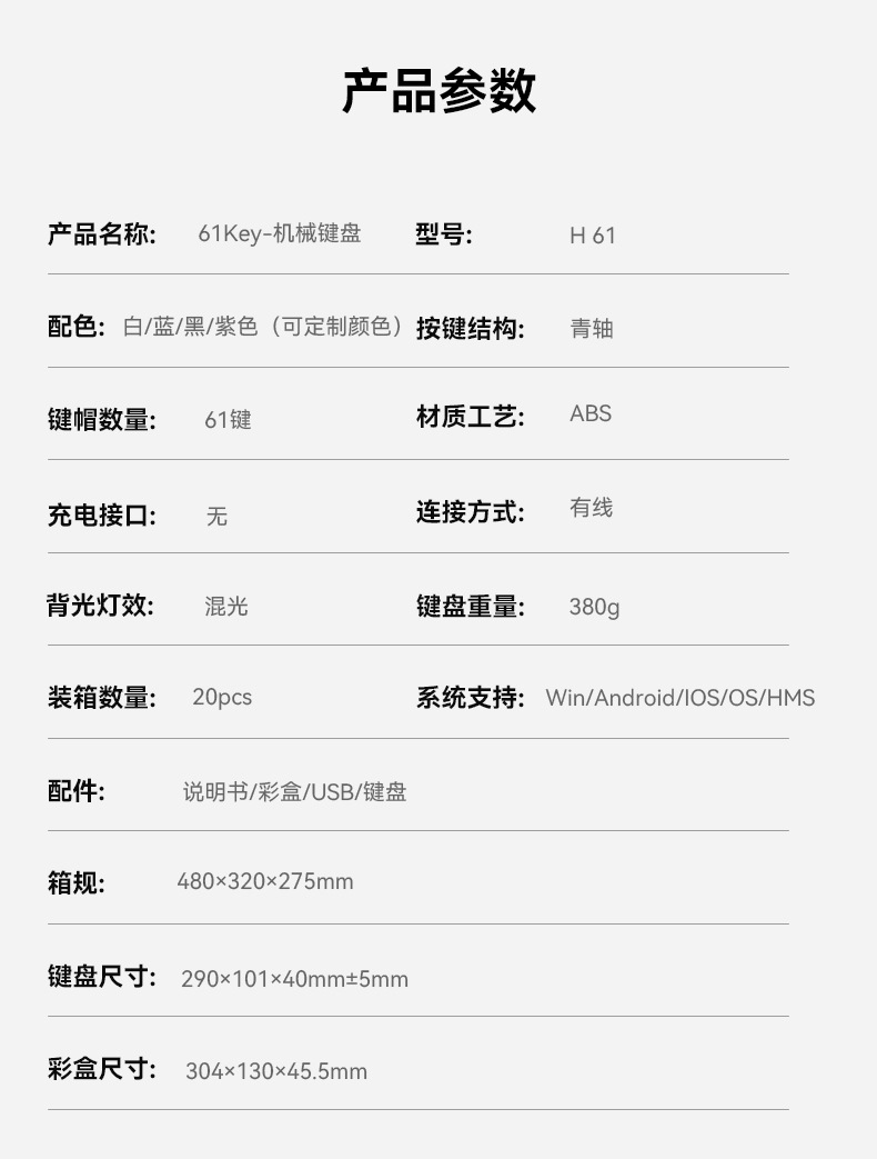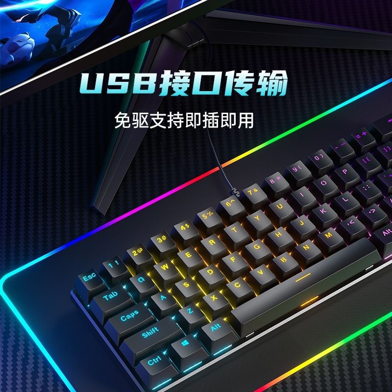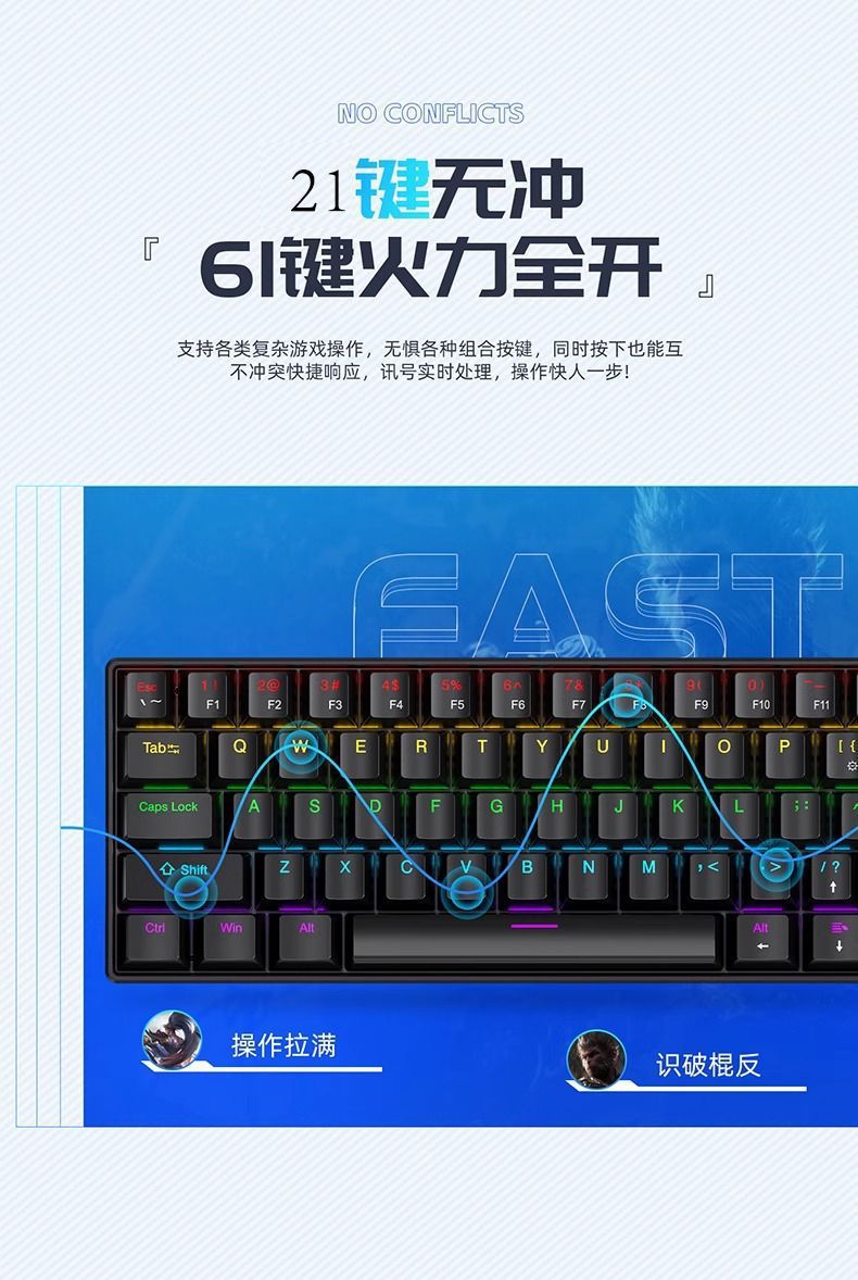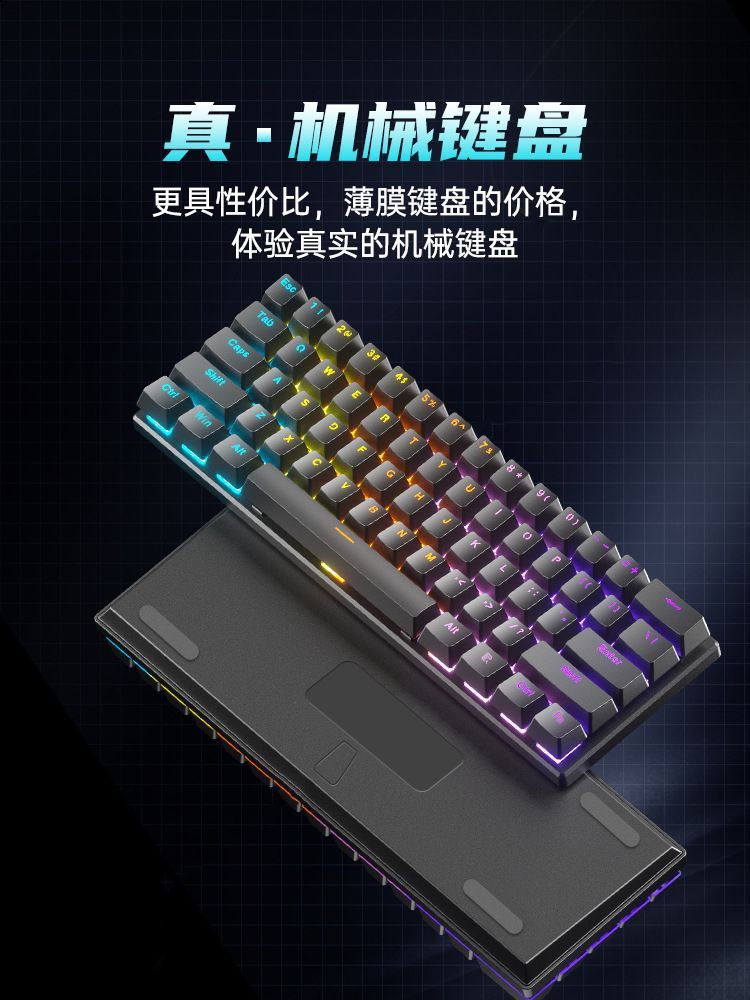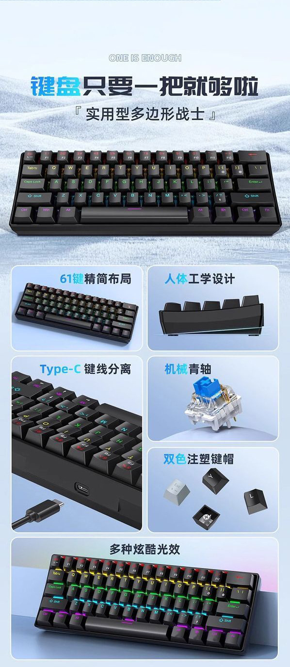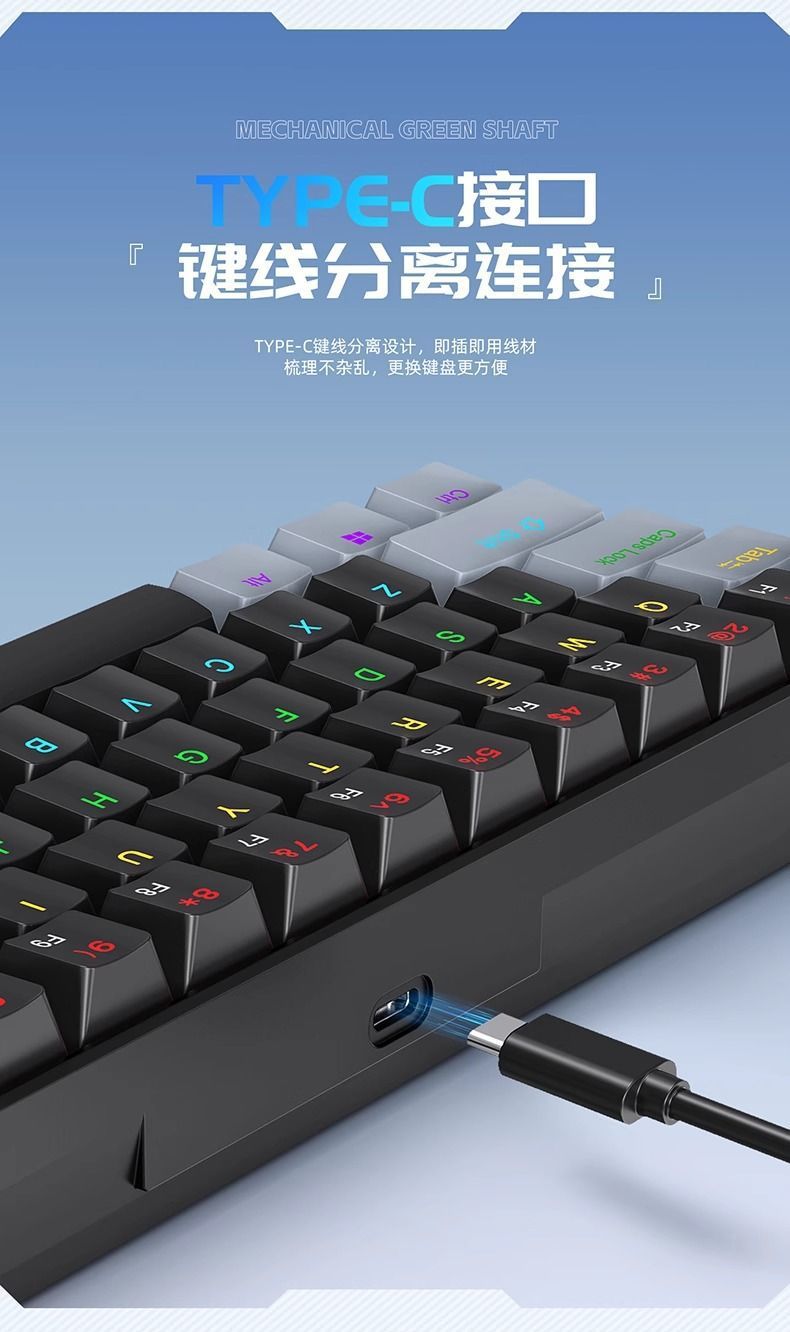 61키 기계식 키보드, 키와 케이블 분리형, 탈착 가능, 탁월한 터치감, 컴퓨터 데스크탑 사무용 범용, 그린축 느낌