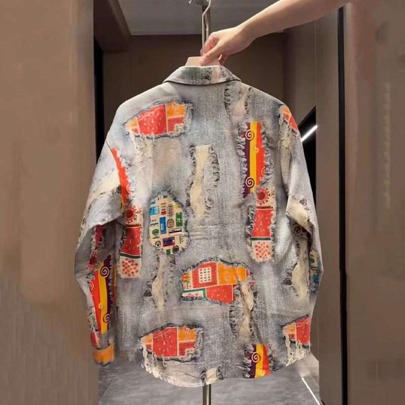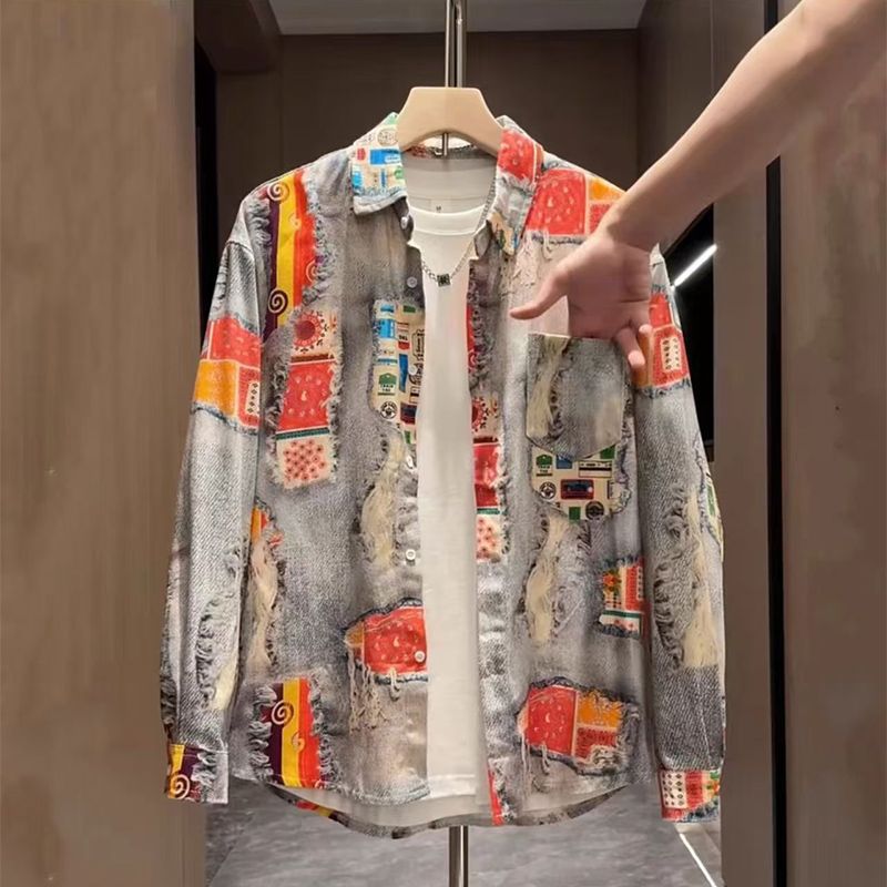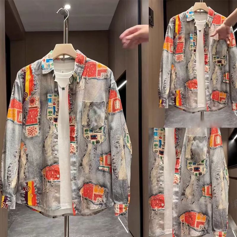 가을 빈티지 홍콩 스타일 그린 프린트 남성 자켓 틈새 디자인 미국 스타일 독특한 긴 소매 셔츠 남녀 올매치스토어 가기